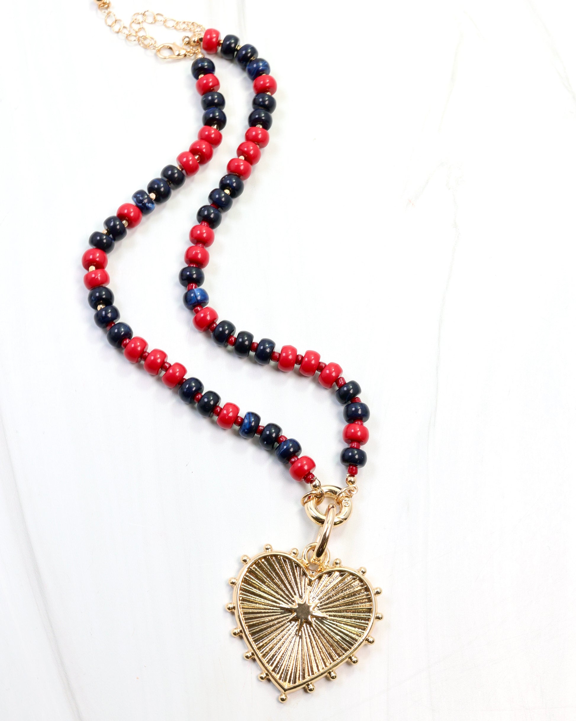 Show your team pride in style with the McLane Stone Necklace featuring bold red and navy stones. This fashionable piece includes a convenient toggle clasp, allowing you to easily add your favorite charm for a personalized touch. Perfect for game day or everyday wear, it combines spirited design with versatile elegance.