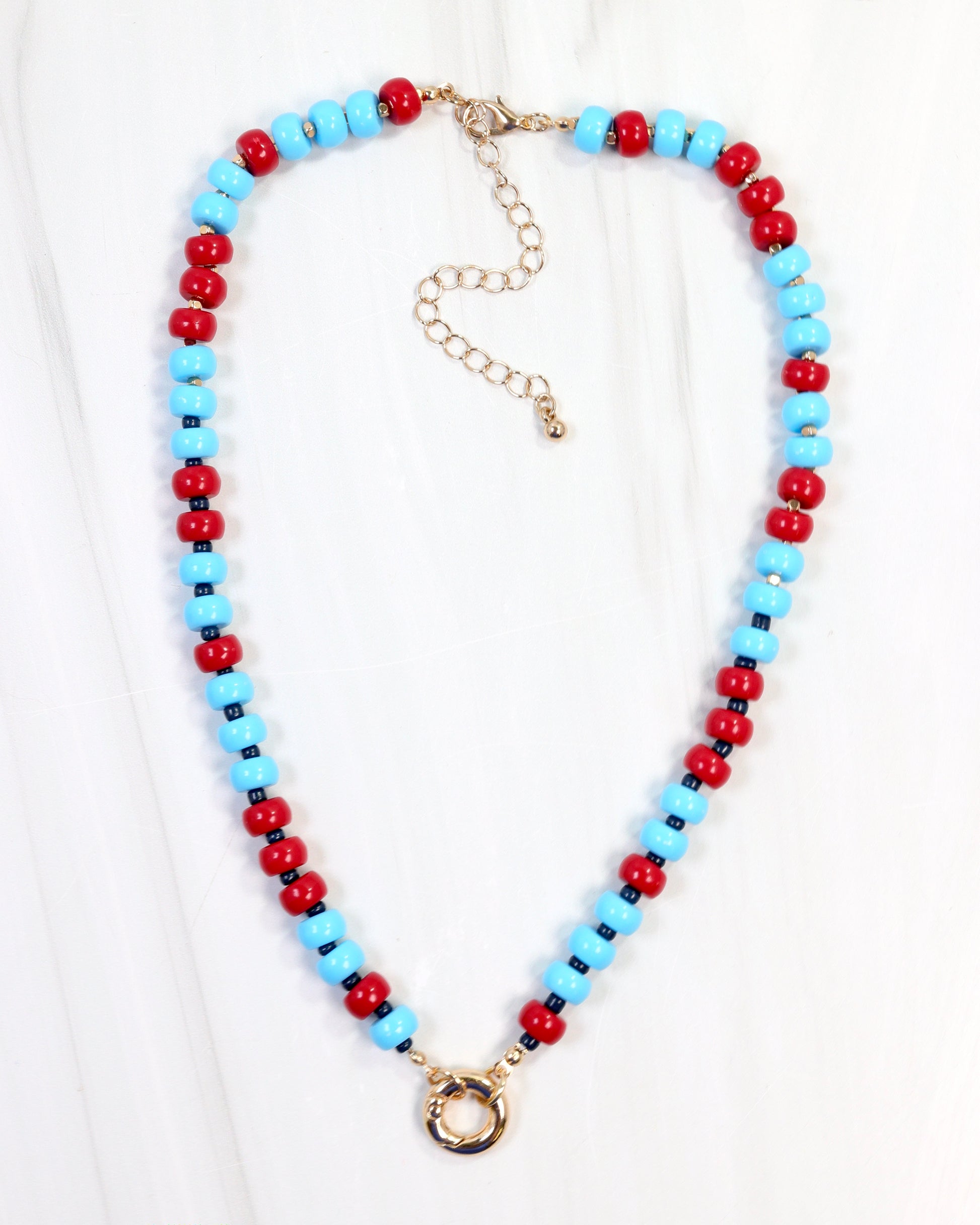 Show your team pride in style with the McLane Stone Necklace featuring bold red and powder blue stones. This fashionable piece includes a convenient toggle clasp, allowing you to easily add your favorite charm for a personalized touch. Perfect for game day or everyday wear, it combines spirited design with versatile elegance.