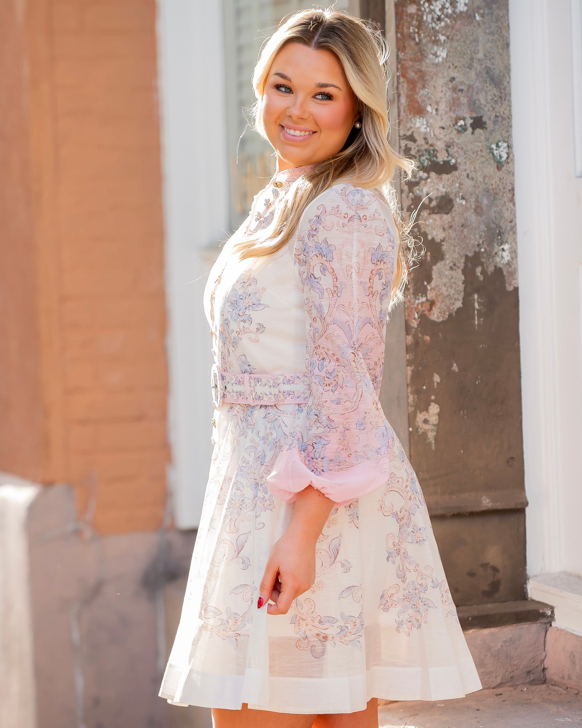 Introducing the Grace Fancy Button Down Dress—a playful layered look that's anything but ordinary. This charming piece features a soft pink camisole slip beneath a breezy linen-feel overlay adorned with an intricate paisley pattern. The standout pink dip dyed sleeves add a modern twist, while decorative rhinestone flower and gold buttons create eye-catching detail down the front. Complete with a coordinating thick fashion belt featuring the same paisley design and a statement round buckle, this dress delivers effortless elegance with a touch of whimsy. Perfect for making a memorable entrance at any occasion.