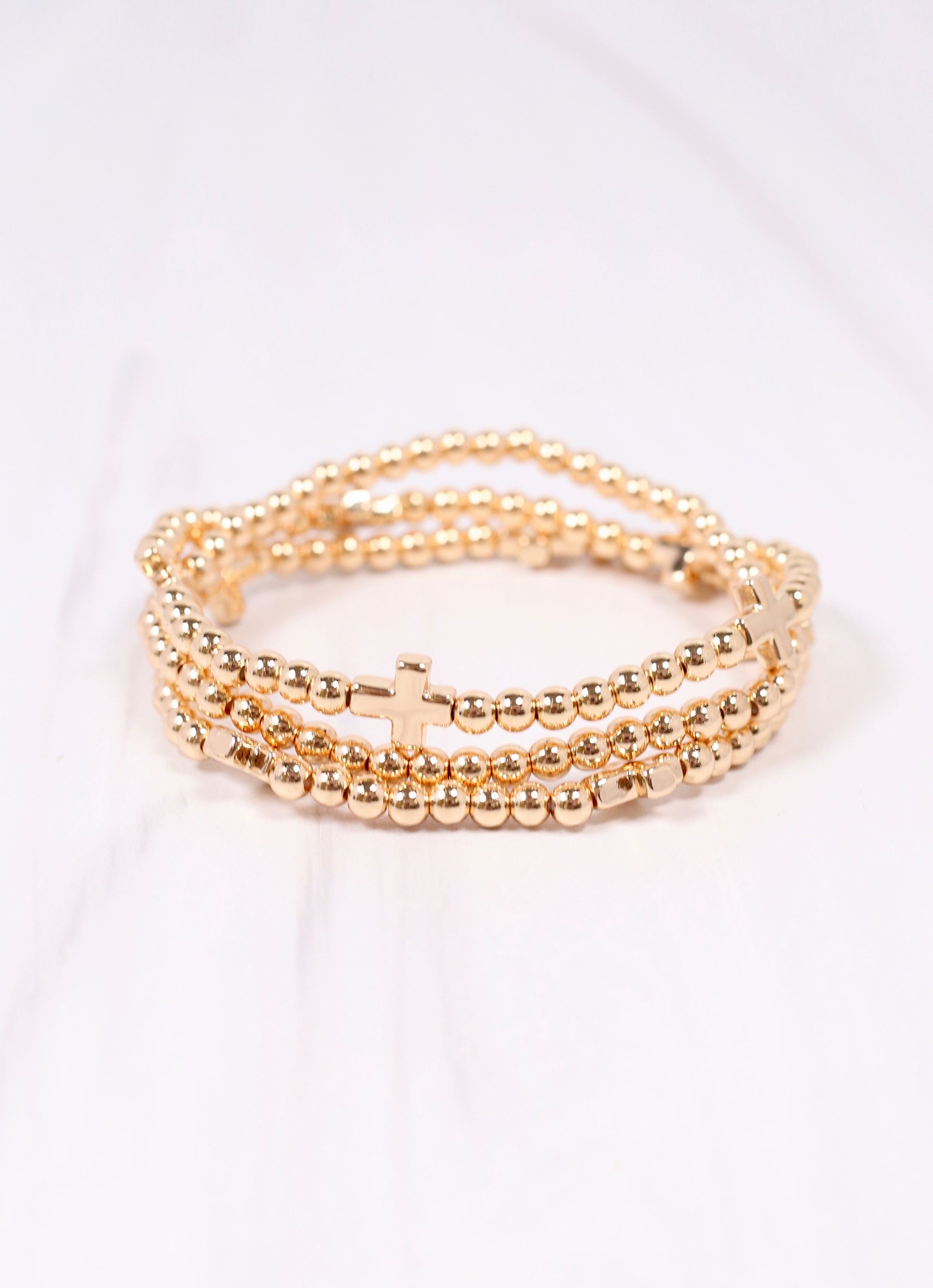 This simple bracelet set includes three pieces lined with gold beading and cross accents. It can easily accessorize any outfit by itself or in a fuller stack.
