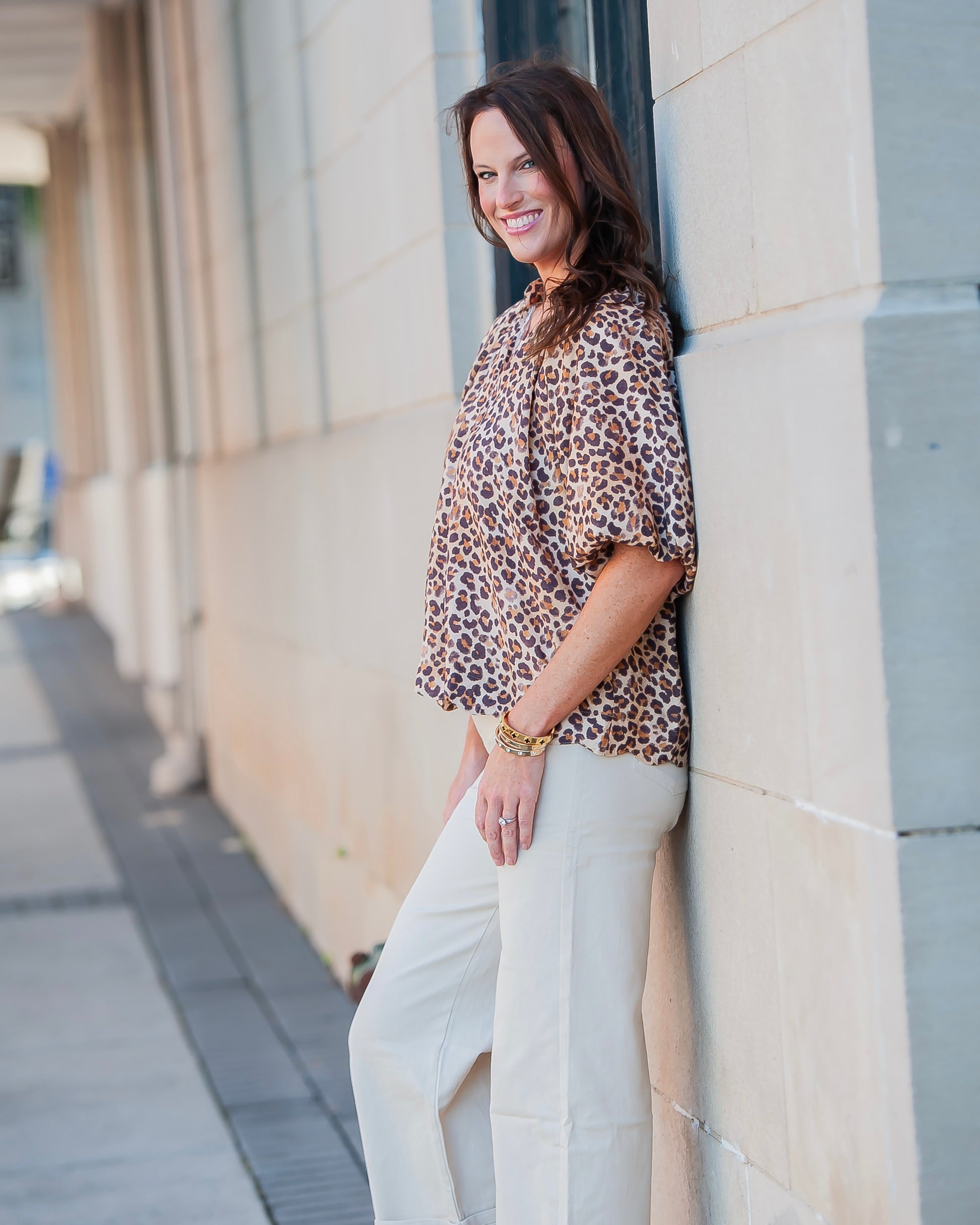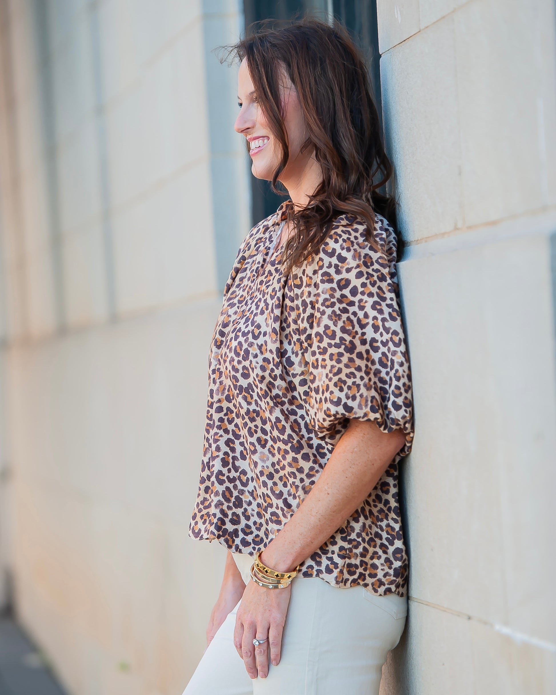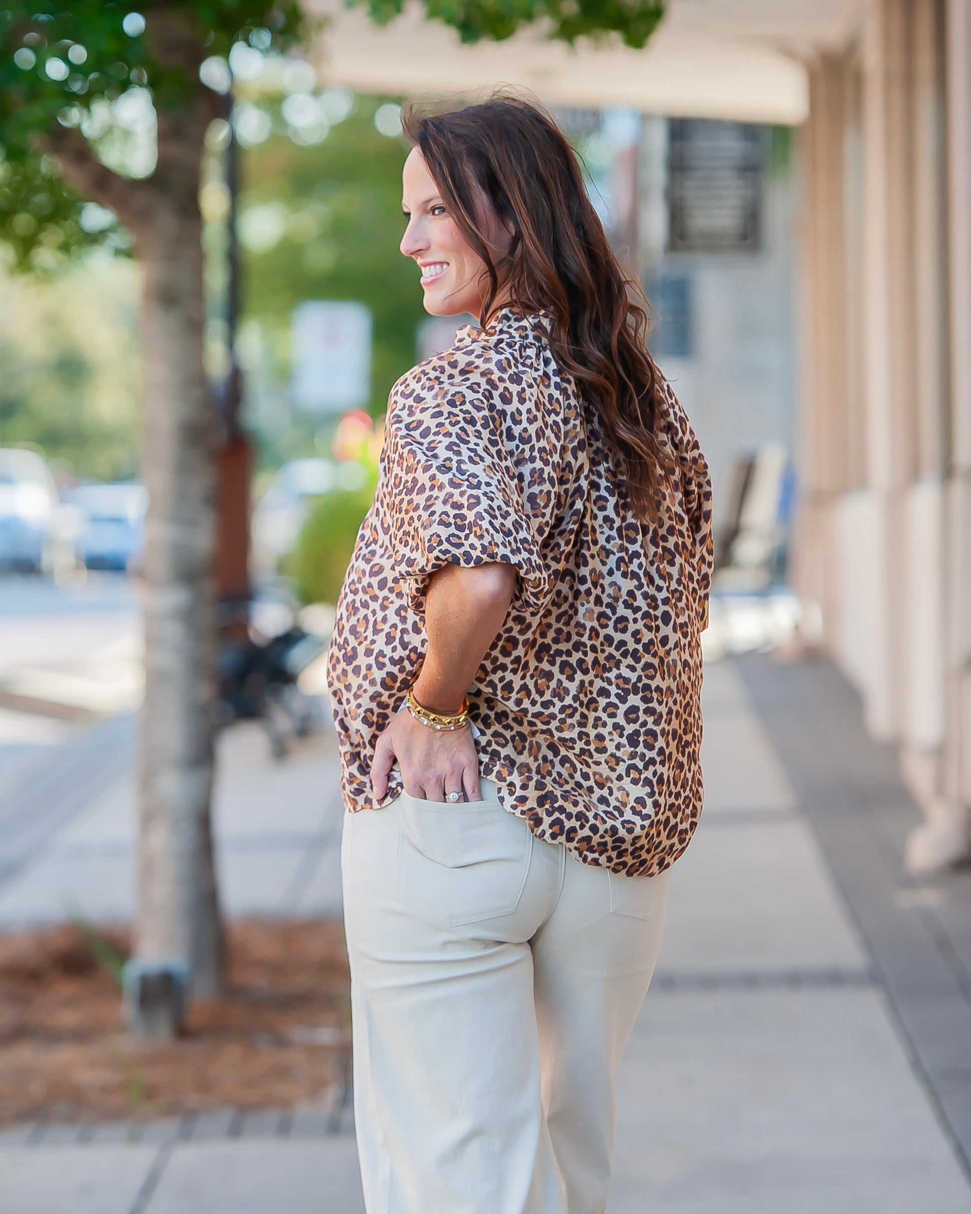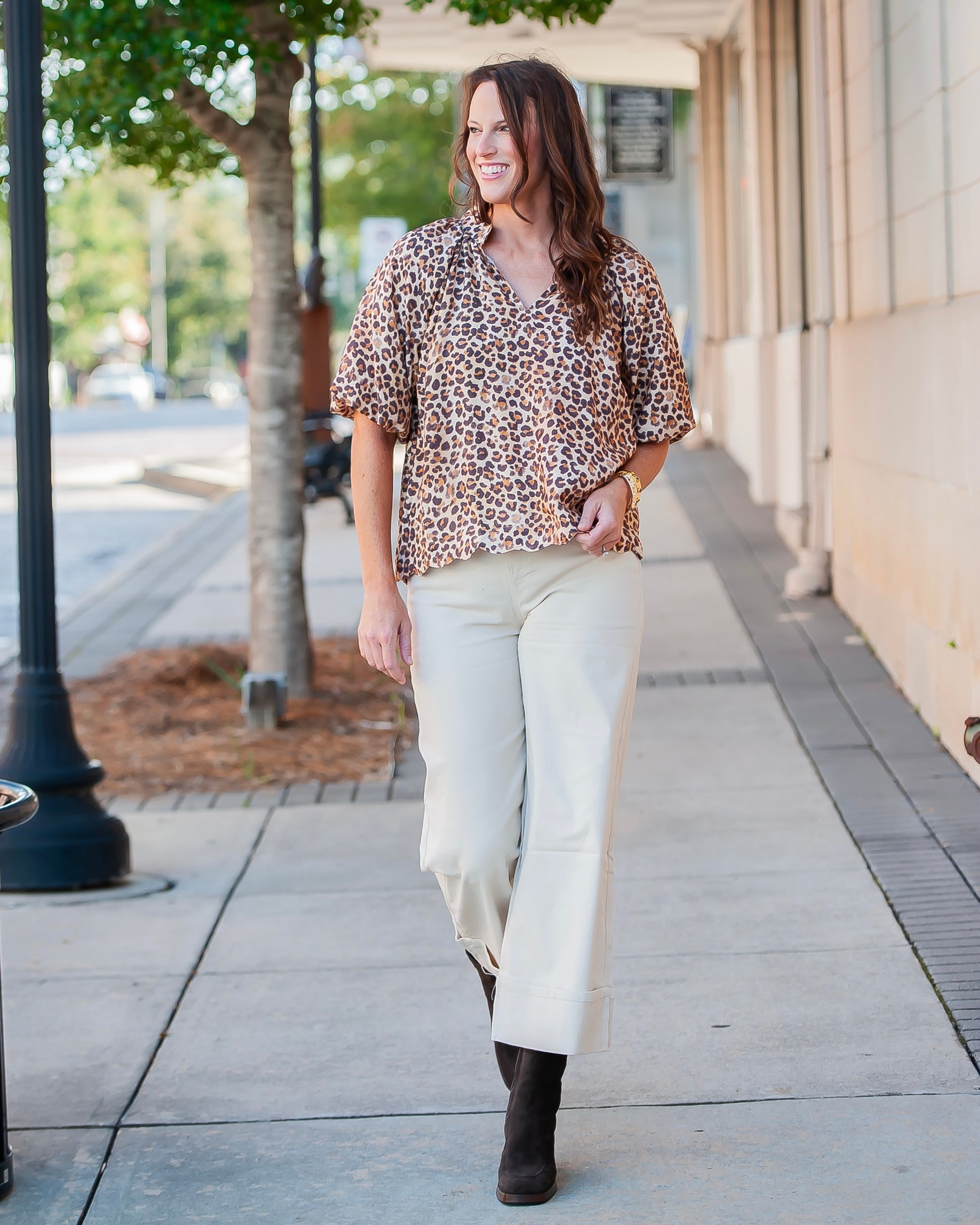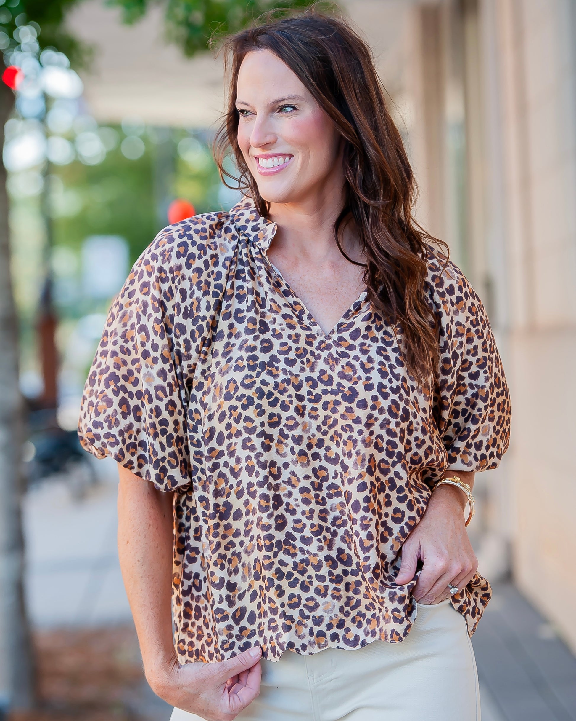 Roar into style with our Miley Leopard Top! Featuring a cute brown leopard print, playful scalloped hem, and flirty balloon sleeves. This unlined v-neck beauty pairs perfectly with denim for any season's adventure!