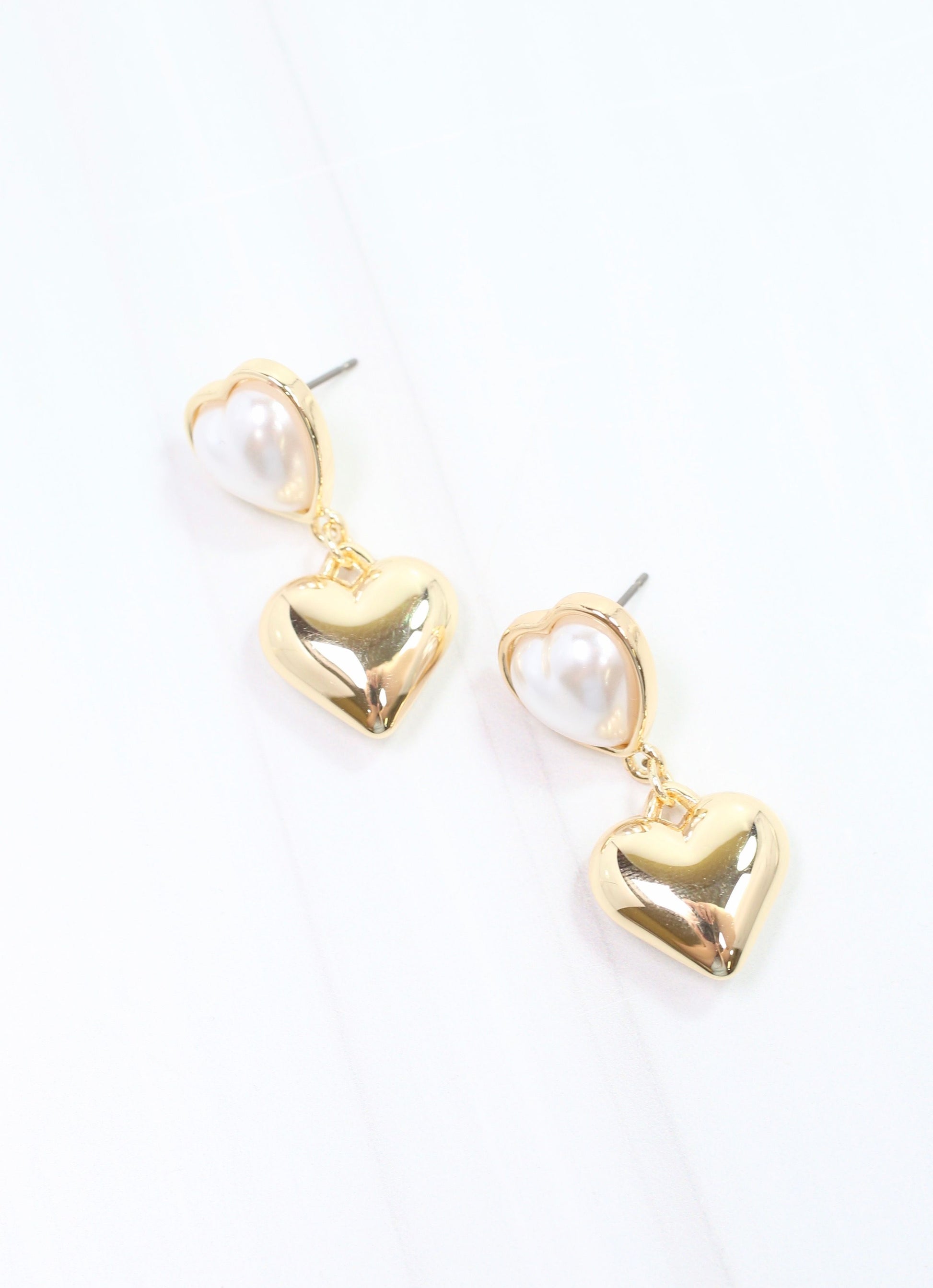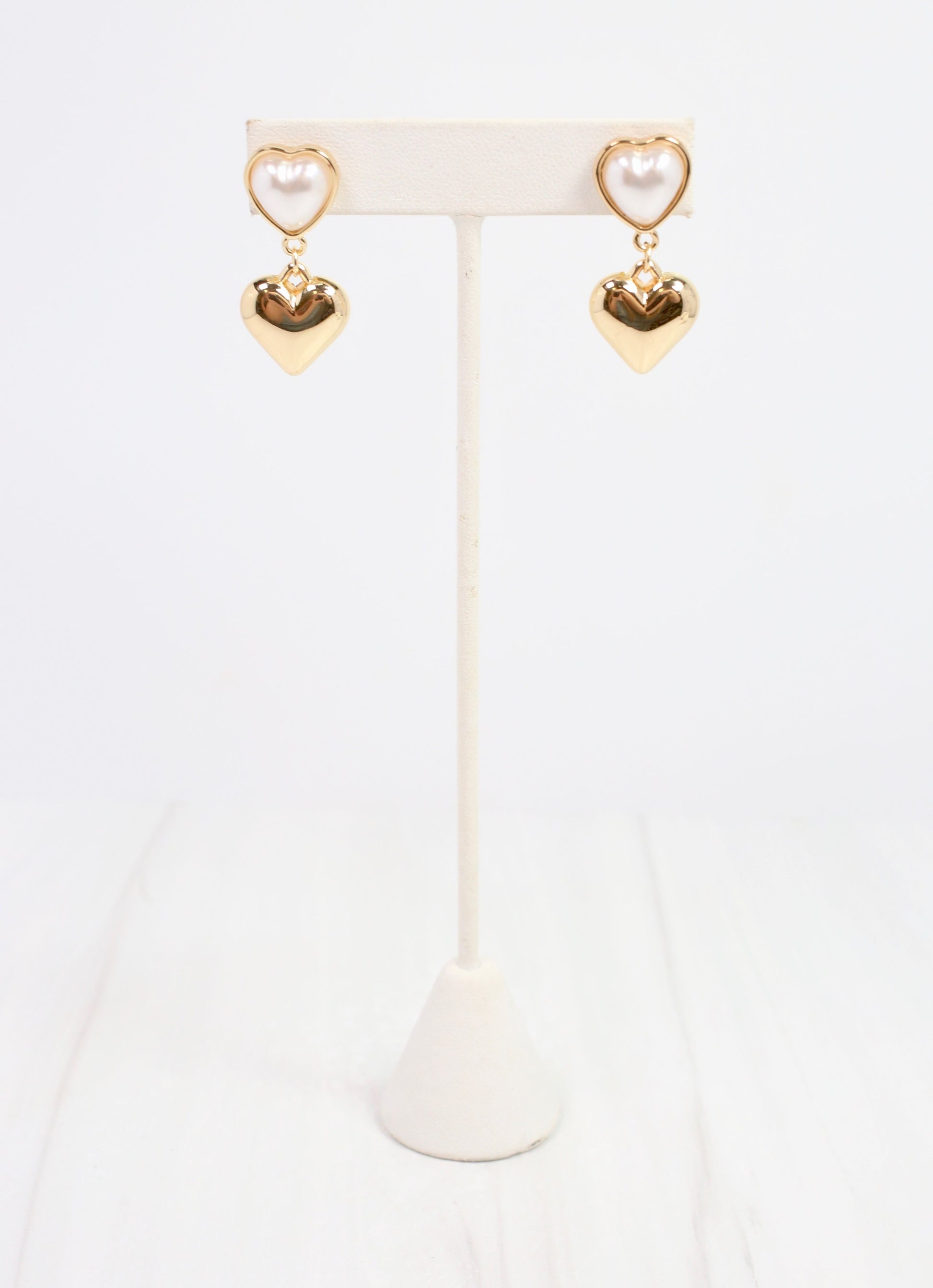 This double drop heart earring is precious. It has a heart pearl post and a shiny heart drop accent as well.