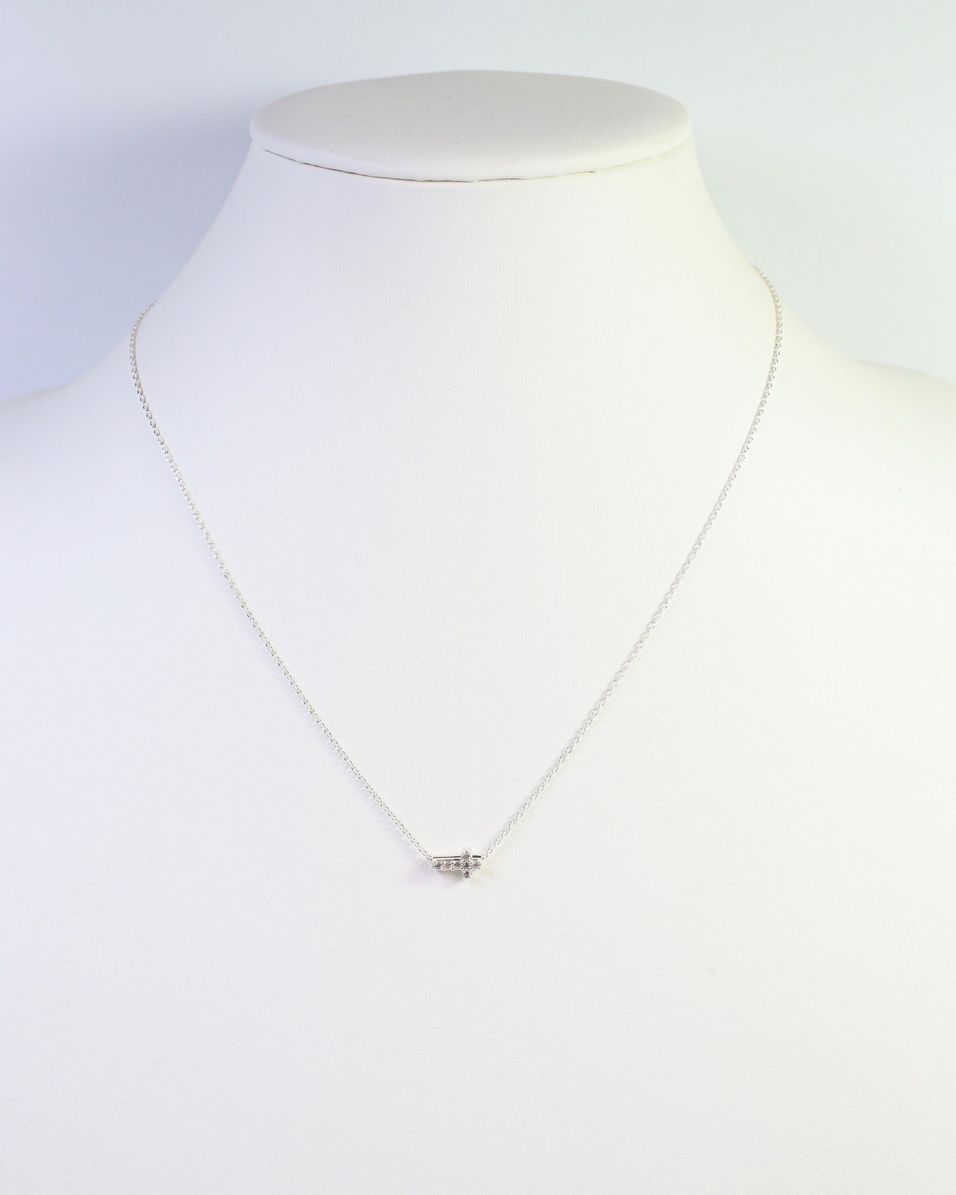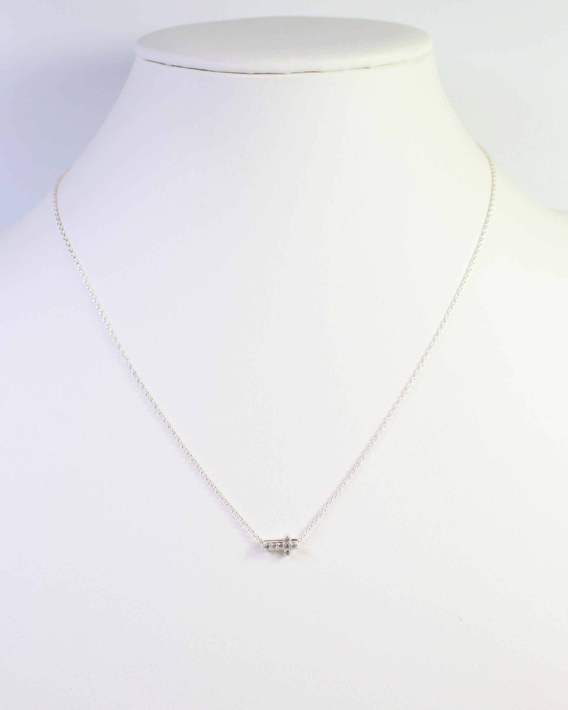 Sleek silver necklace showcasing an off-center cross pendant with modern edge. This versatile piece strikes the perfect balance between spiritual symbolism and contemporary style. Layer it with your favorites or let it shine solo—either way, it's a conversation starter that works with everything.