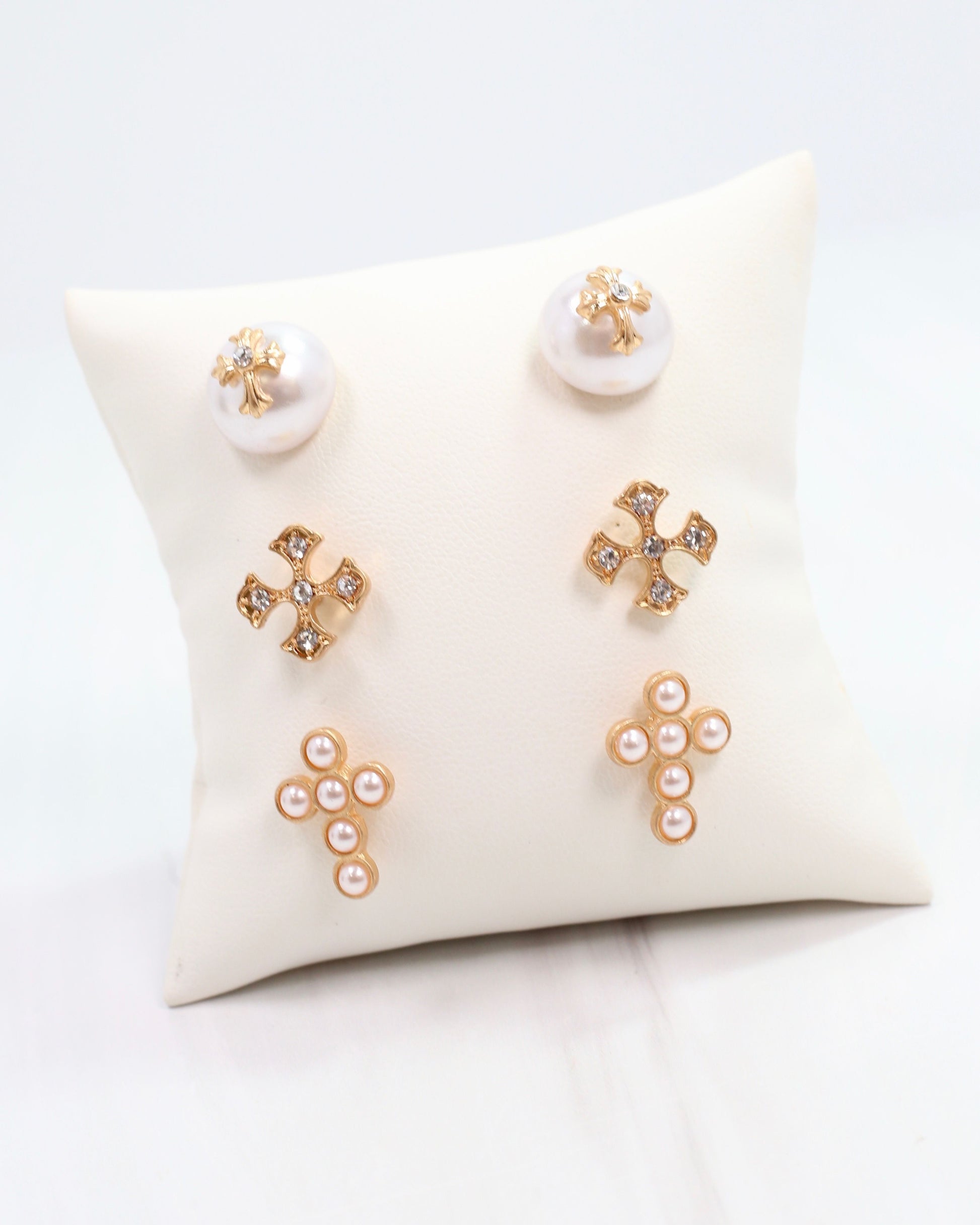 Get ready to rock these Minnie Lou Cross Earrings! Adorned with a pearl cross in worn gold, a pearl dome stud with a gold cross, and a vintage cross with clear stones, these classy and versatile earrings are perfect for any event. Plus, with a titanium post, they're comfortable for all-day wear.