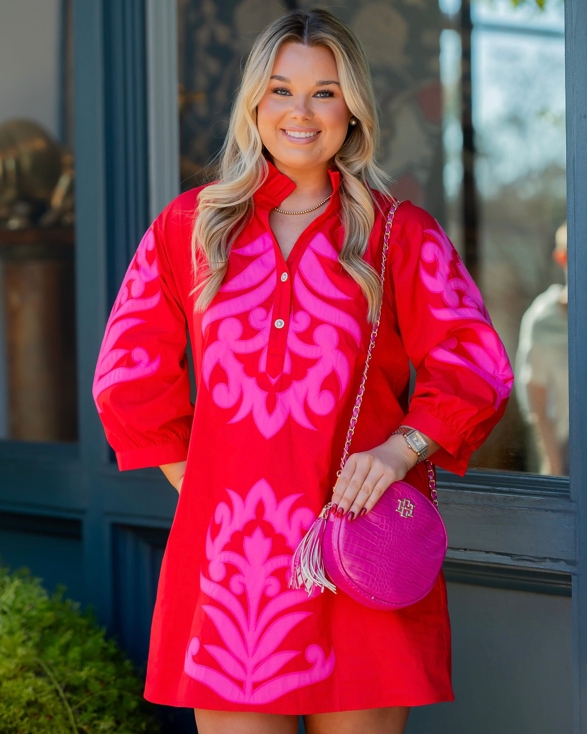 Slip into effortless elegance with the Monroe Floral Applique Shift Dress. This charming piece features intricate baroque floral appliqués that add instant sophistication, while the relaxed shift silhouette keeps things comfortable and breezy. The ruffled high neckline brings a playful touch, and practical wide pockets mean you can actually carry your essentials. Button up the front for easy styling versatility—dress it up for brunch or keep it casual for weekend adventures. Three-quarter sleeves strike the perfect balance between coverage and seasonal ease.