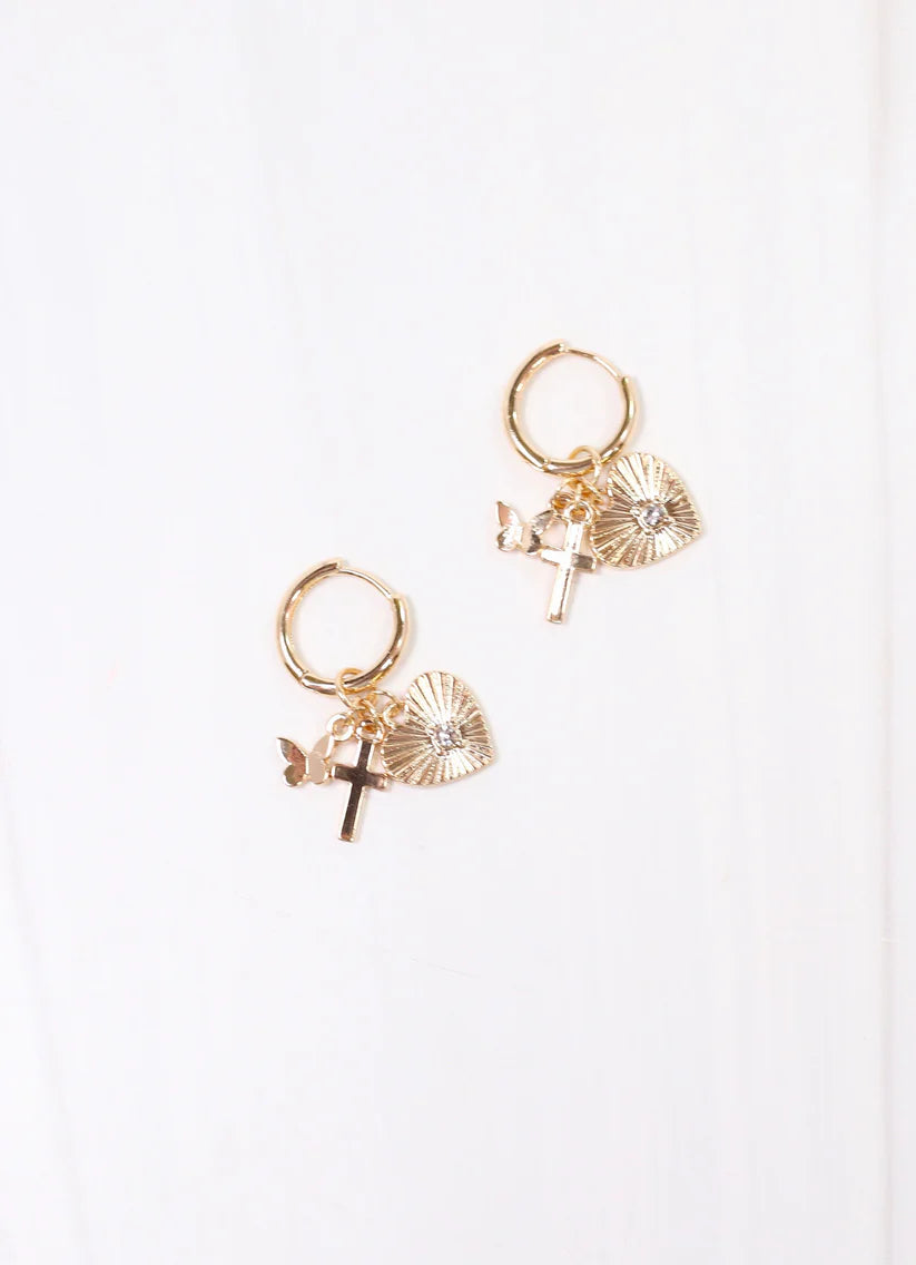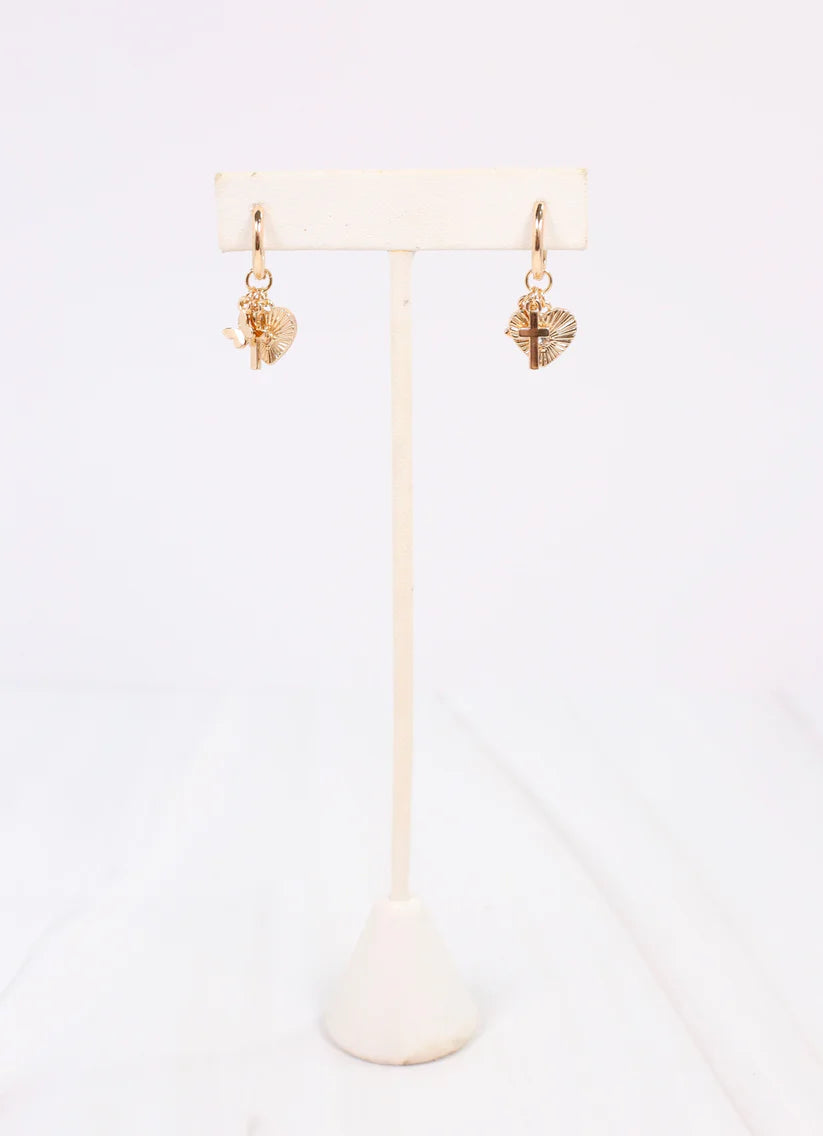 This earring is precious! It features a triple charm drop on a simple hoop. There is a petite butterfly, a cross, and a ribbed heart with CZ accent.