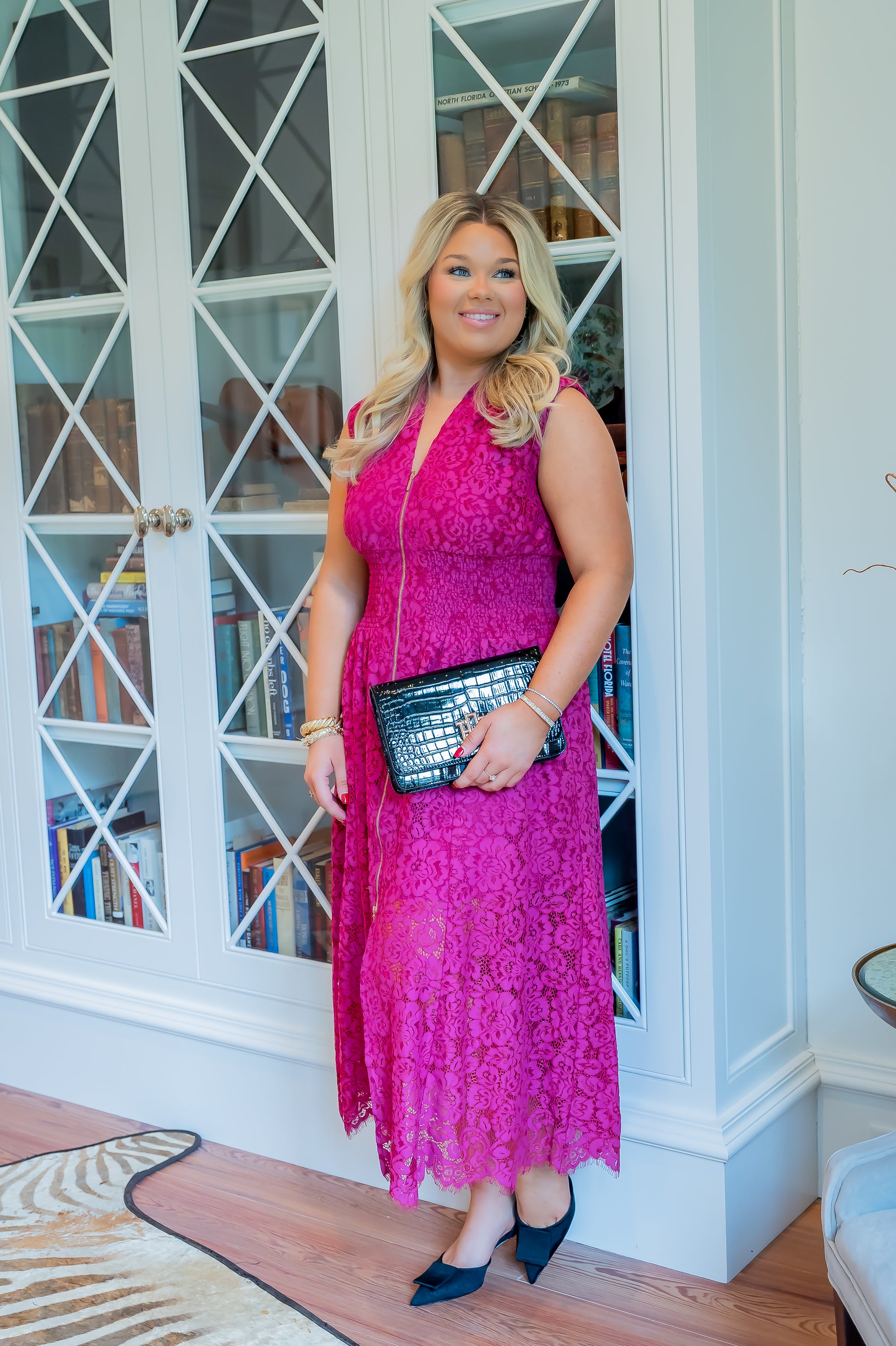 This New York Lace Dress in deep rose exudes sophistication with its rich, beautiful hue and delicate lace fabric. Designed with a flattering v-neck and a front zip closure for ease, it features an elasticized waist that enhances your silhouette. The scalloped hem adds an elegant touch, making it perfect for weddings, parties, or any special occasion where graceful style is essential. Side pockets!!