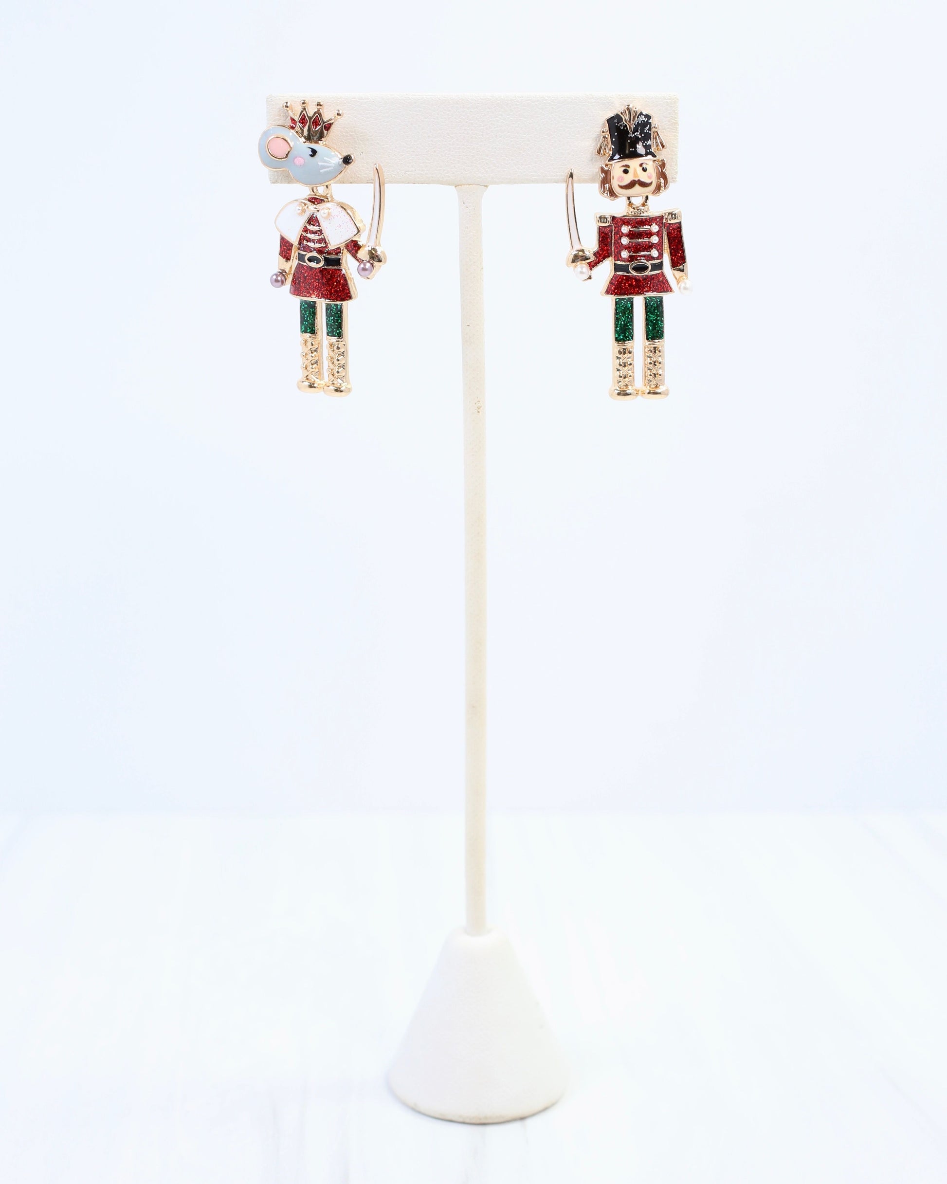 Make a bold statement with the Nutcracker King Earrings in red glittery enamel. Featuring detailed Nutcracker and Mouse King charms with swords drawn, these dangling earrings bring a playful yet stylish edge to your holiday wardrobe.