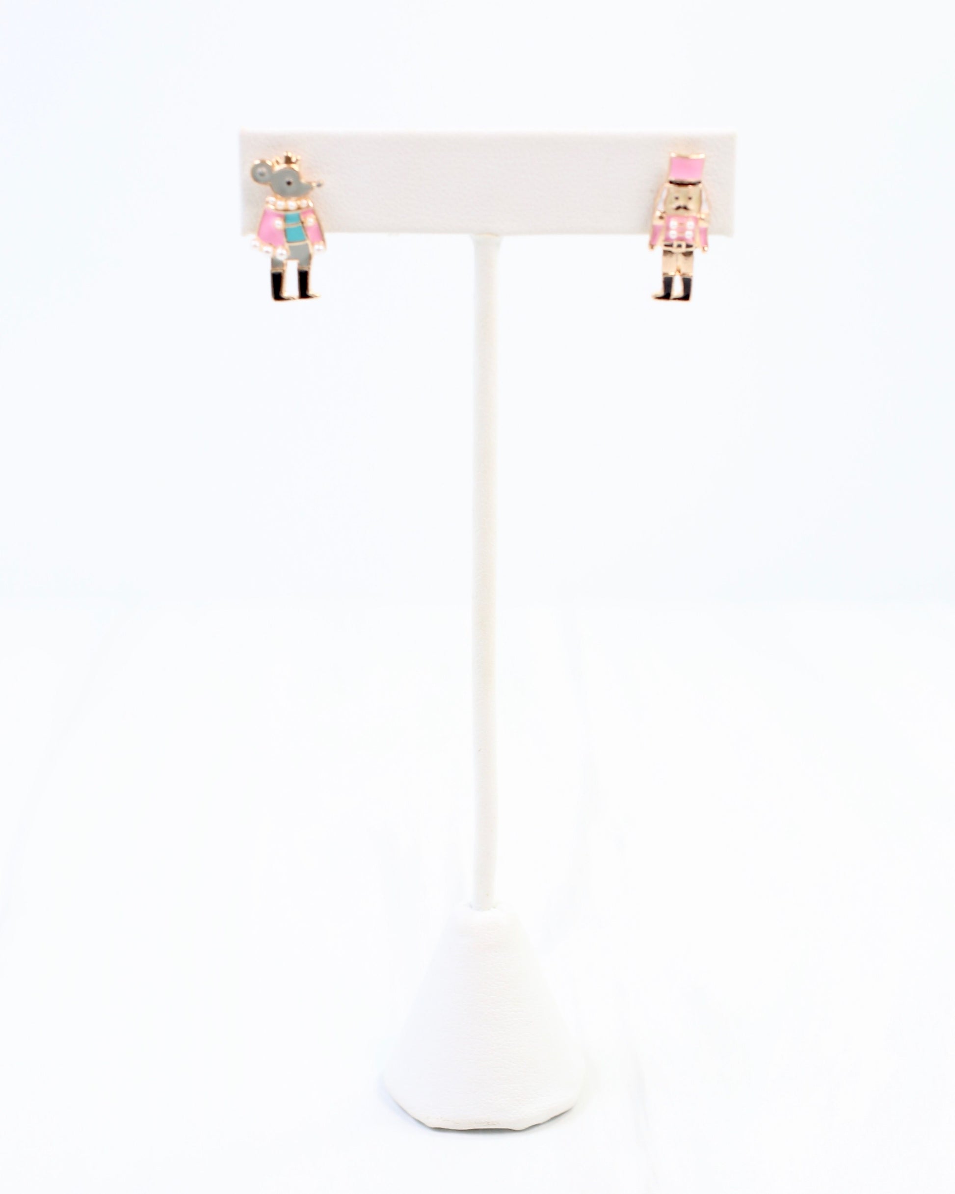 Add a festive touch to your look with the Nutcracker Suite Dreams Earring in Pink. Featuring charming small enamel studs of the nutcracker and mouse king, each earring is delicately accented with petite pearls for a subtle, elegant shimmer. Perfect for holiday ensembles or year-round whimsy, these earrings offer a fashionable nod to a classic tale.