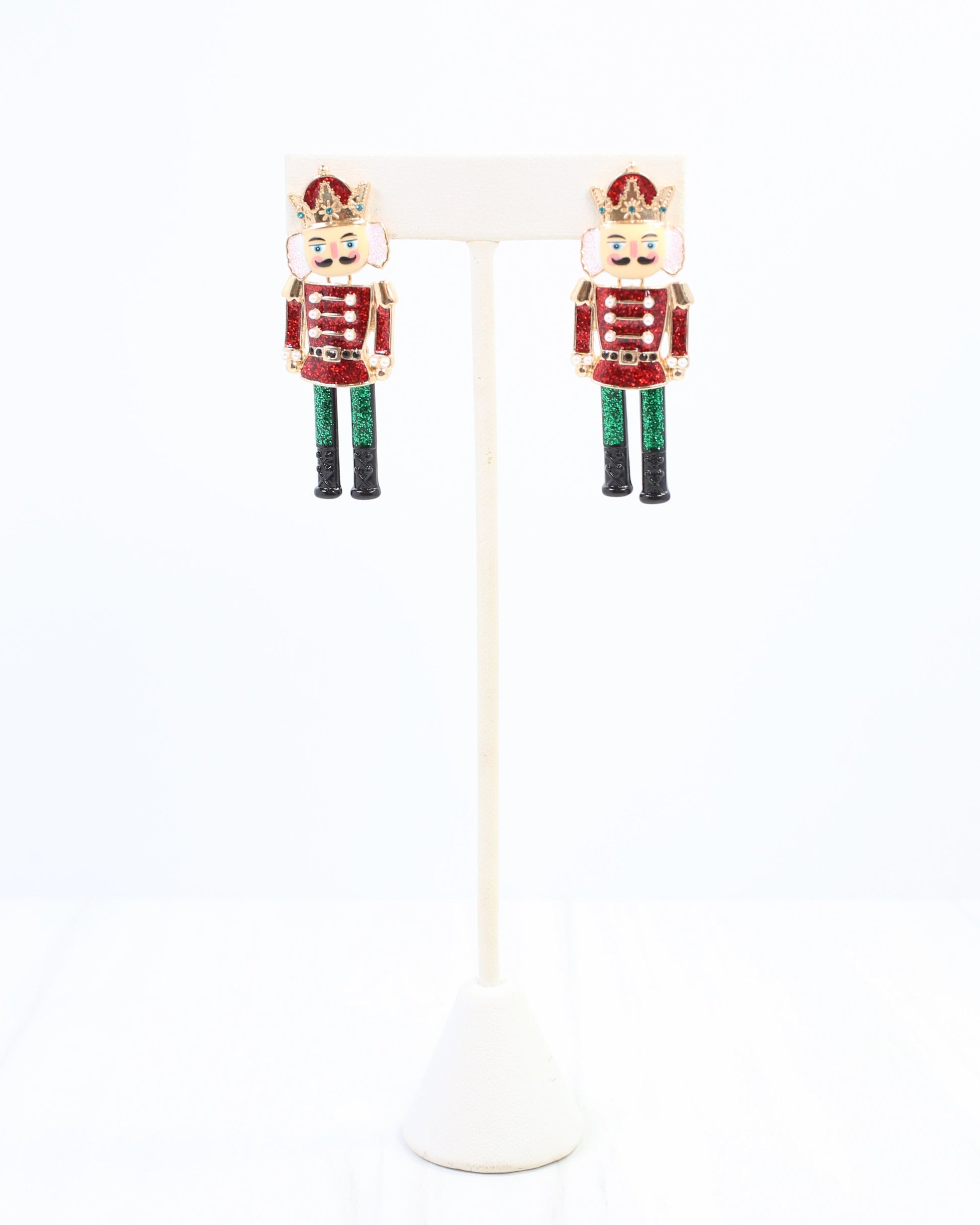 Make a noble statement with the Nutcracker Waltz Earrings in red. These glittered dangling earrings feature swinging legs and body that create dynamic movement, adding festive charm and eye-catching style to your holiday look.