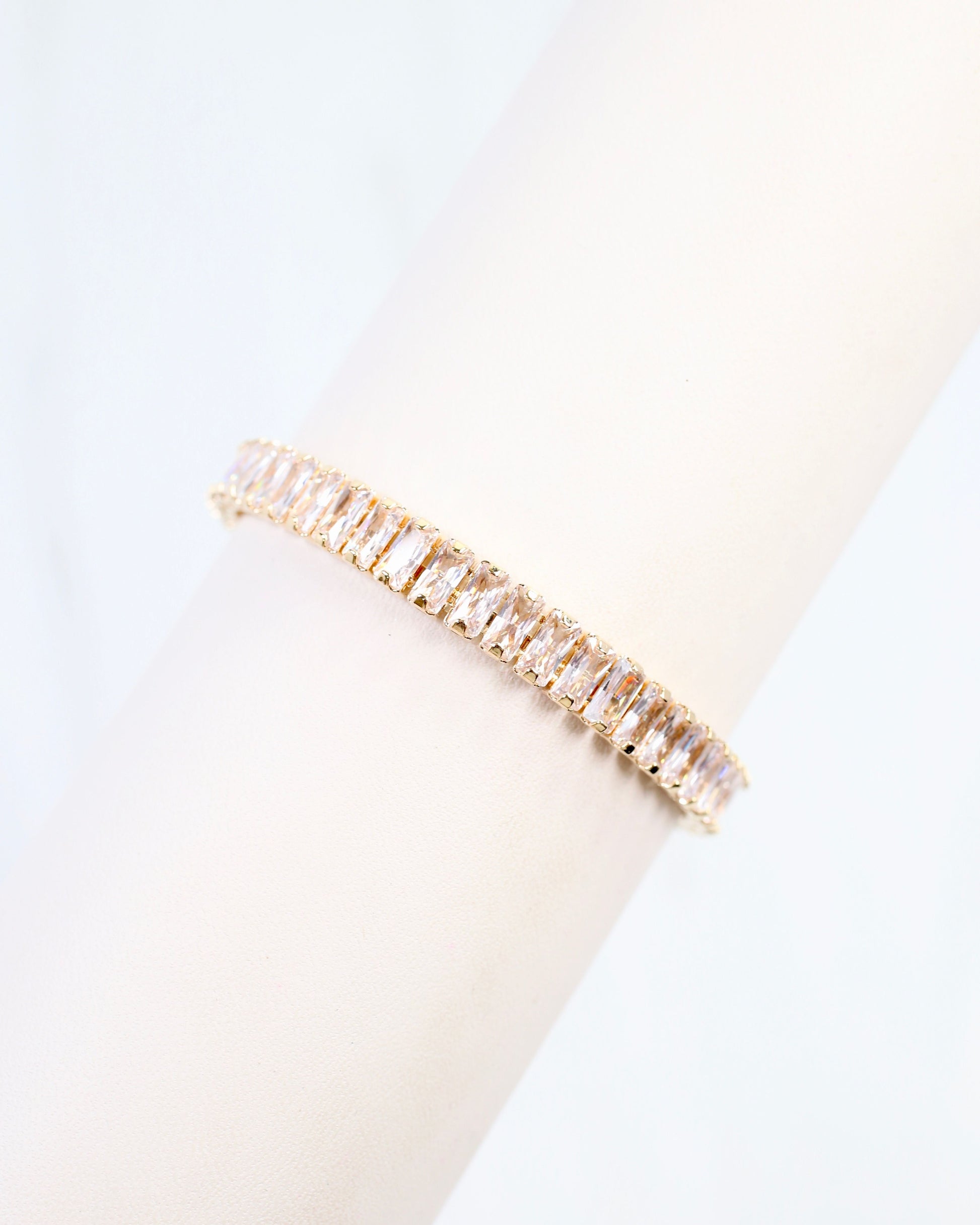 Elevate your style with the Paradise CZ Cuff Bracelet in Gold. This open cuff features sparkling cubic zirconia baguette details at each end, adding a sleek and modern touch. Its coil design offers a comfortable fit while making a chic statement for any occasion.