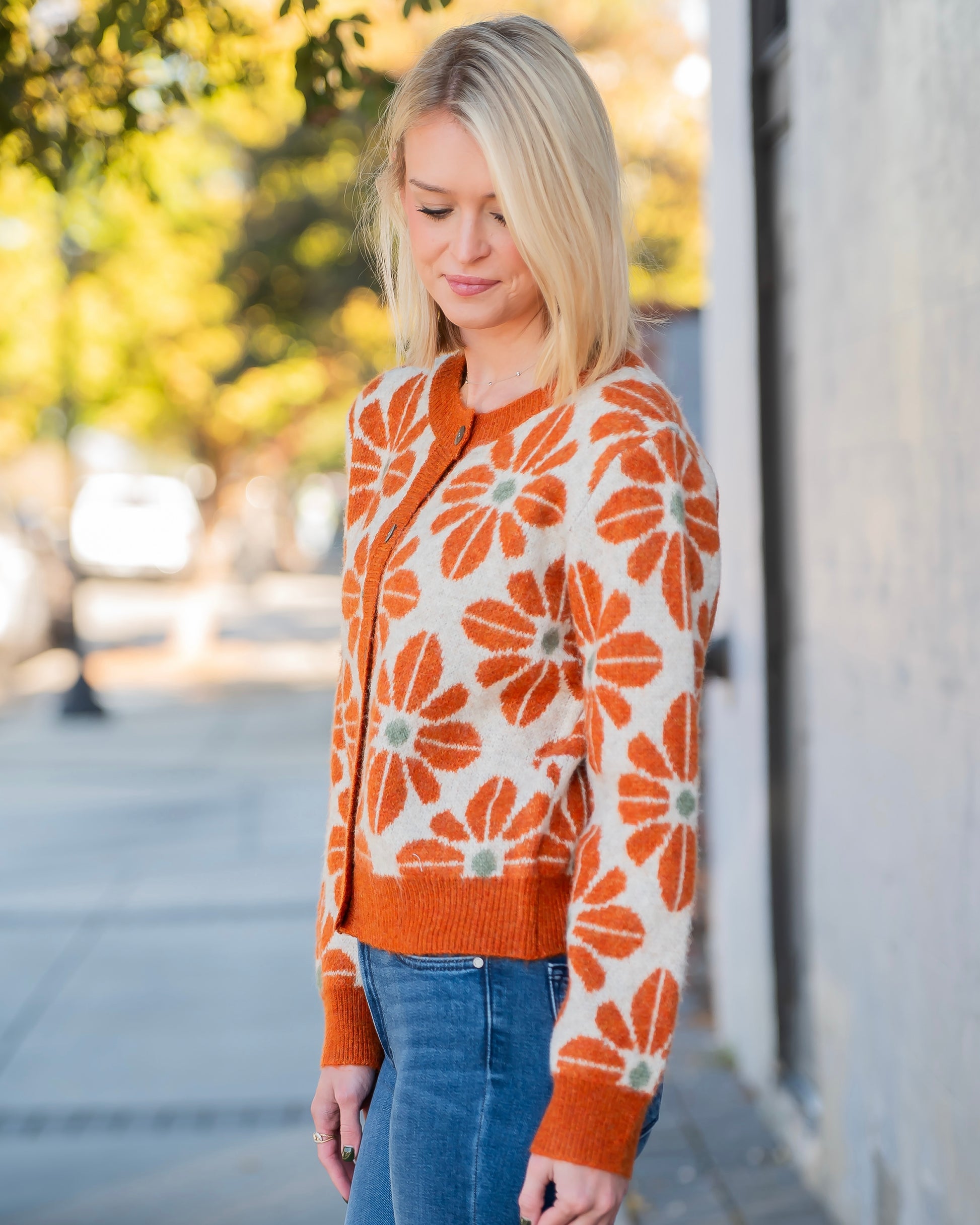The Partridge Floral Knit Cardigan features a retro-inspired floral pattern that adds a stylish touch to any outfit. This lightweight, long-sleeve sweater knit cardigan is unlined and non-sheer, making it perfect for layering in any season. Its comfortable knit fabric ensures both warmth and breathability, combining classic charm with modern fashion.