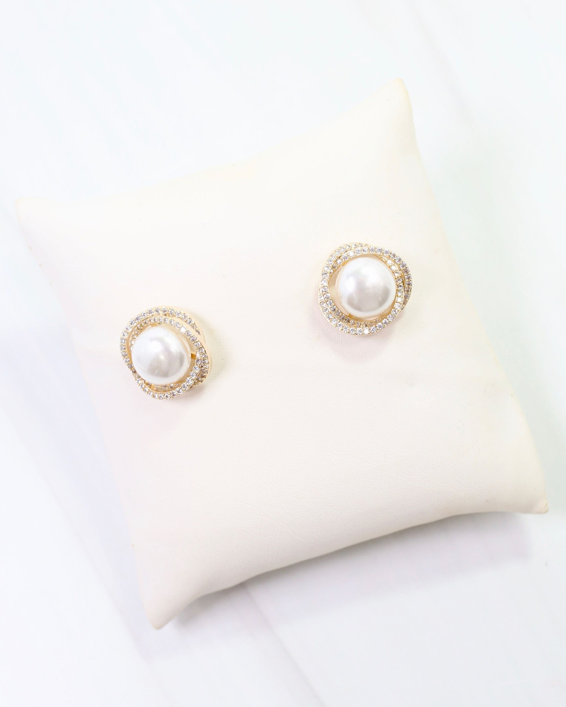 Add a touch of sparkle with the Pendleton Pearl and Crystal Stud in Gold. Featuring a lustrous pearl center framed by intertwined CZ halos, these gold-dipped brass earrings bring elegant shimmer to any outfit.