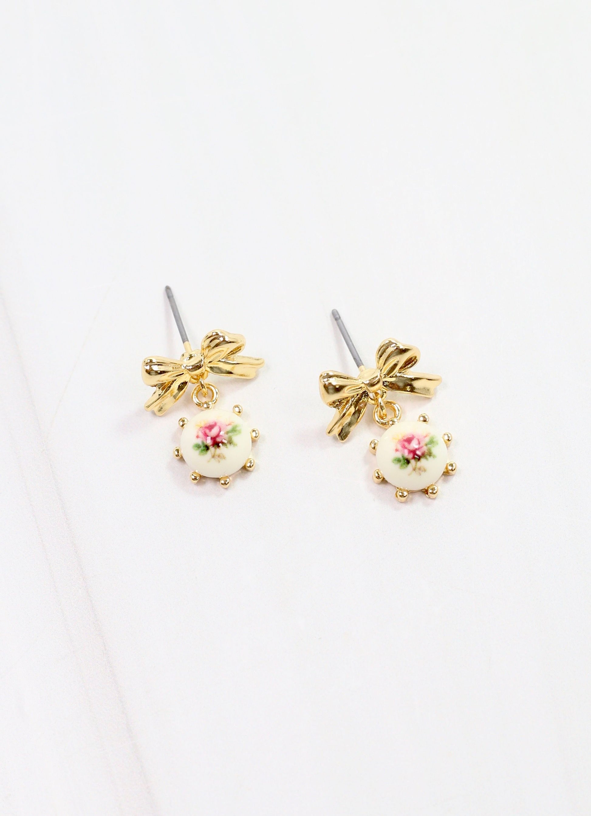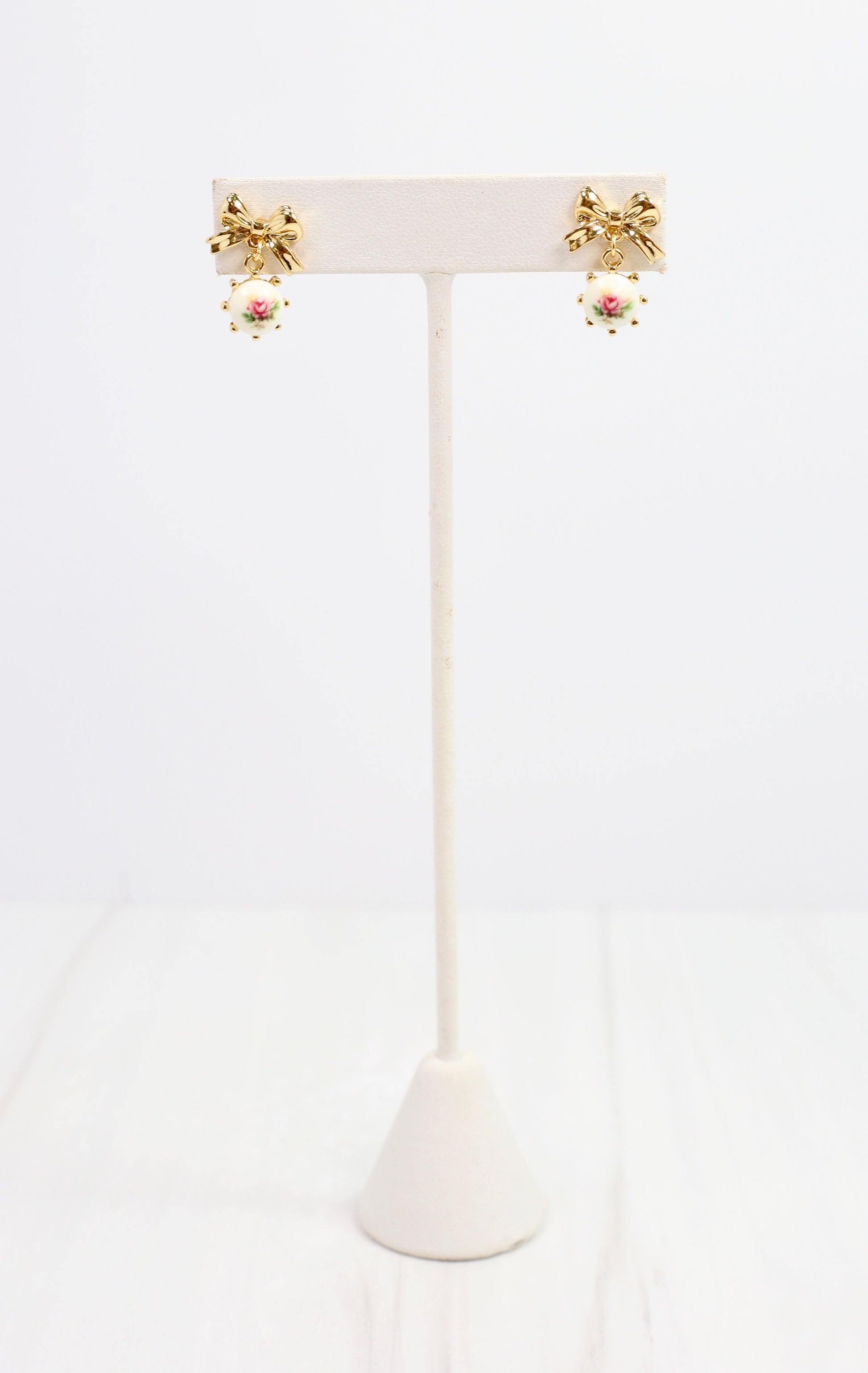 This dainty earring features a shiny gold bow post with a floral ceramic drop accent. Such a cute on trend piece to accessorize with.