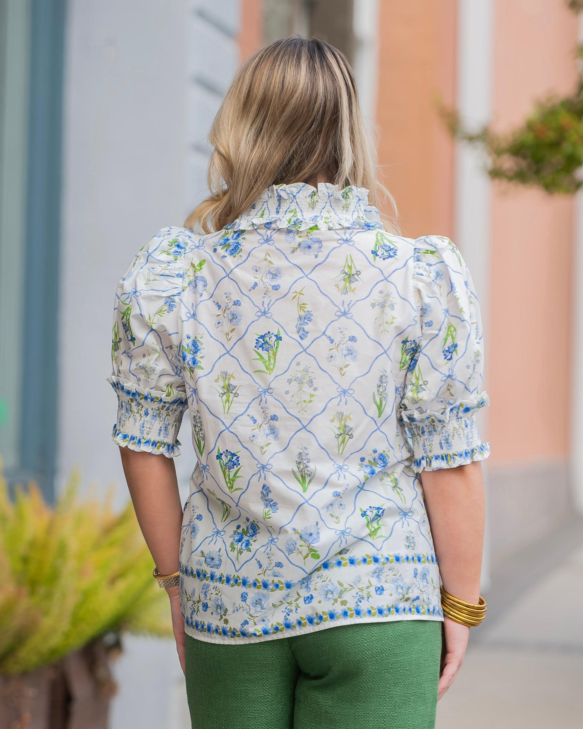 This Seattle Botanical Print Puff Sleeve Top brings botanical charm and playful details to your wardrobe. Featuring a statement ruffled high neck with a flattering V-cut and front button closure, paired with voluminous short puff sleeves that command attention. Smocked cuffs adorned with delicate ruffles add texture and movement. Made from lightweight, non-sheer woven fabric that's unlined for breathability, it's designed for comfort without compromise. A versatile piece that transitions effortlessly from casual to dressed-up occasions.