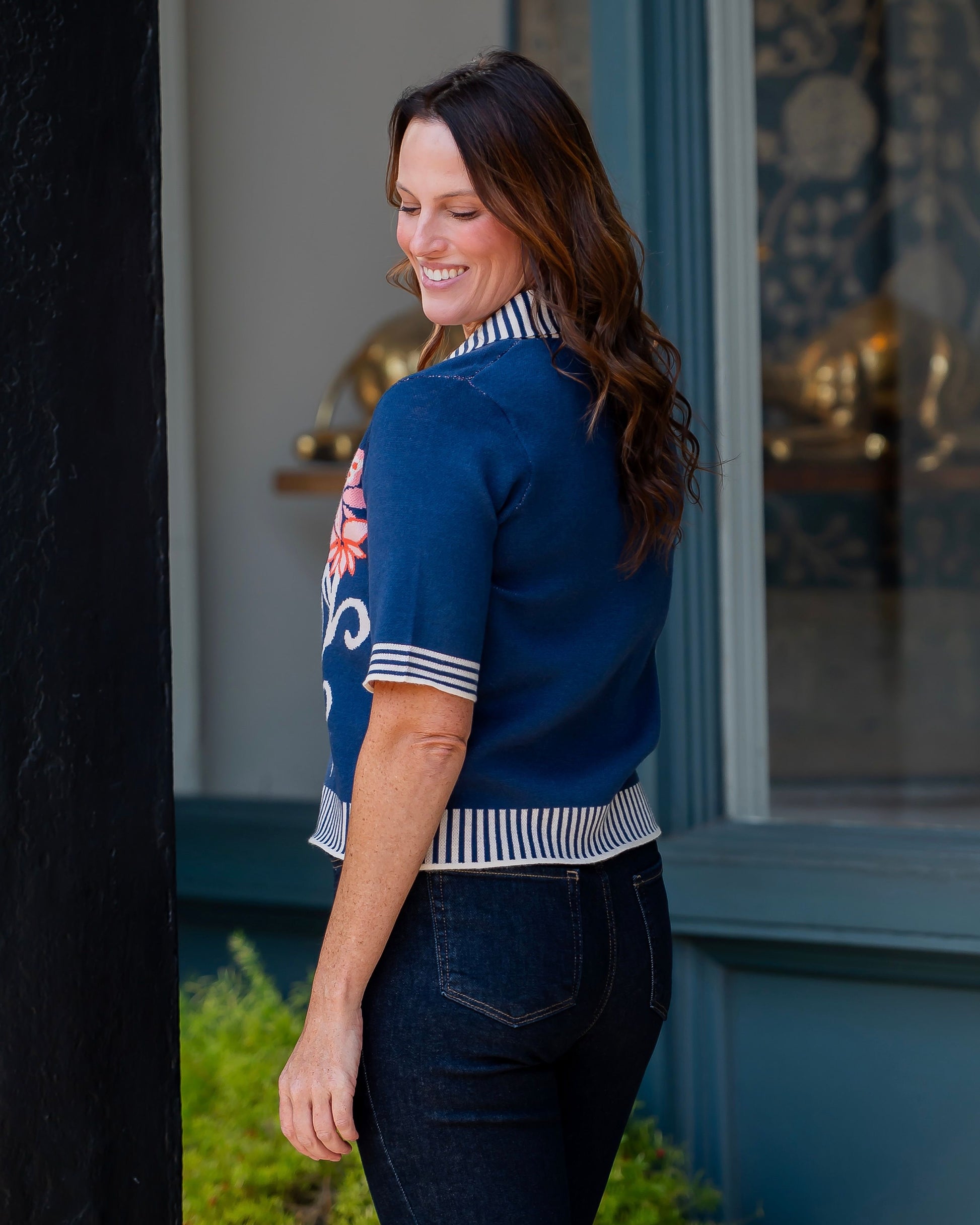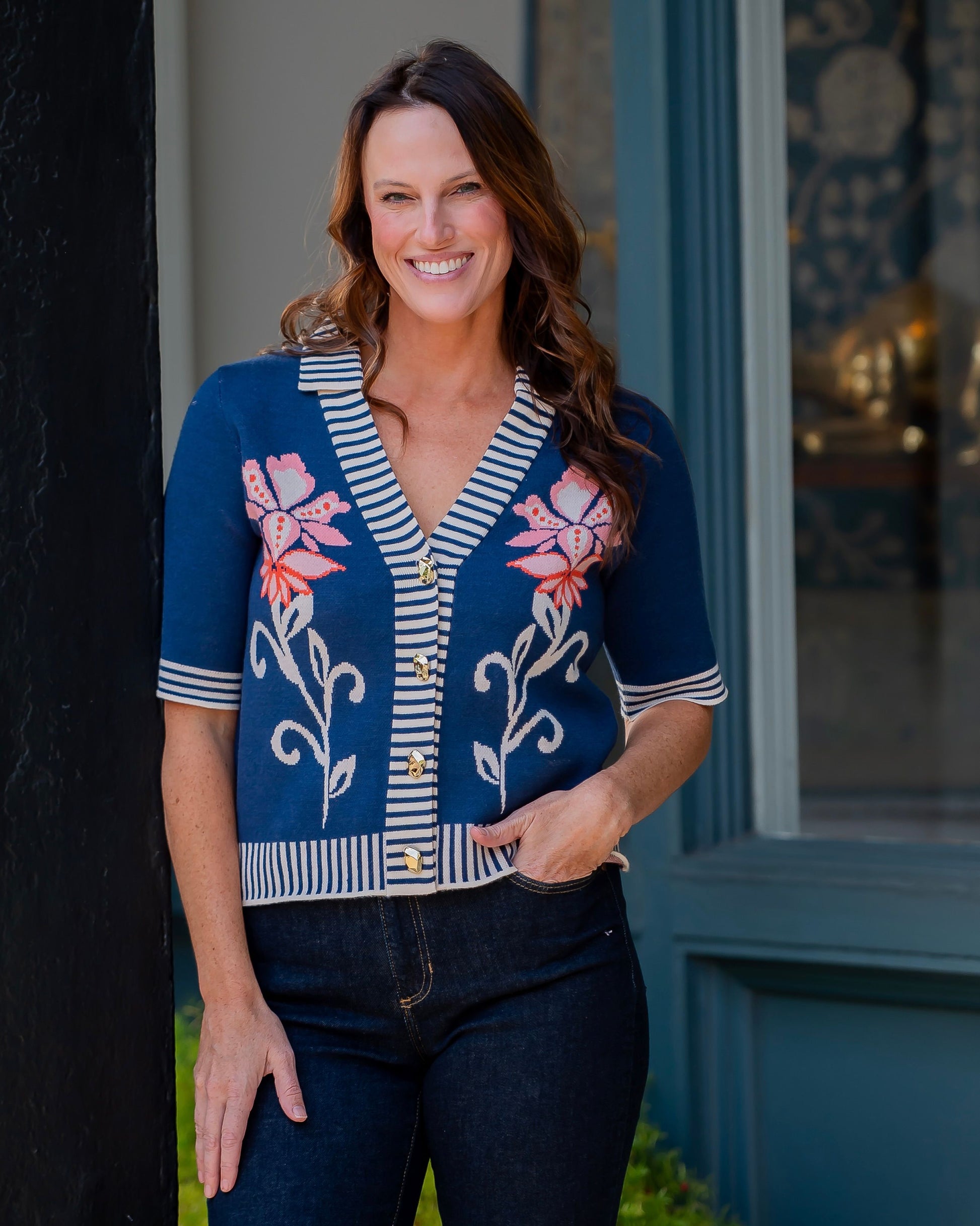 Meet Stella—the short sleeve knit cardigan that's about to become your go-to layer. This beauty showcases a gorgeous floral pattern across the front, paired with shimmering gold geometric buttons that add just the right amount of glam. Perfect for transitioning between seasons, Stella's lightweight knit drapes beautifully and works with everything from jeans to dresses. Whether you're heading to brunch or a casual night out, this cardigan brings effortless style and a playful edge to your wardrobe. It's the piece you'll reach for again and again.