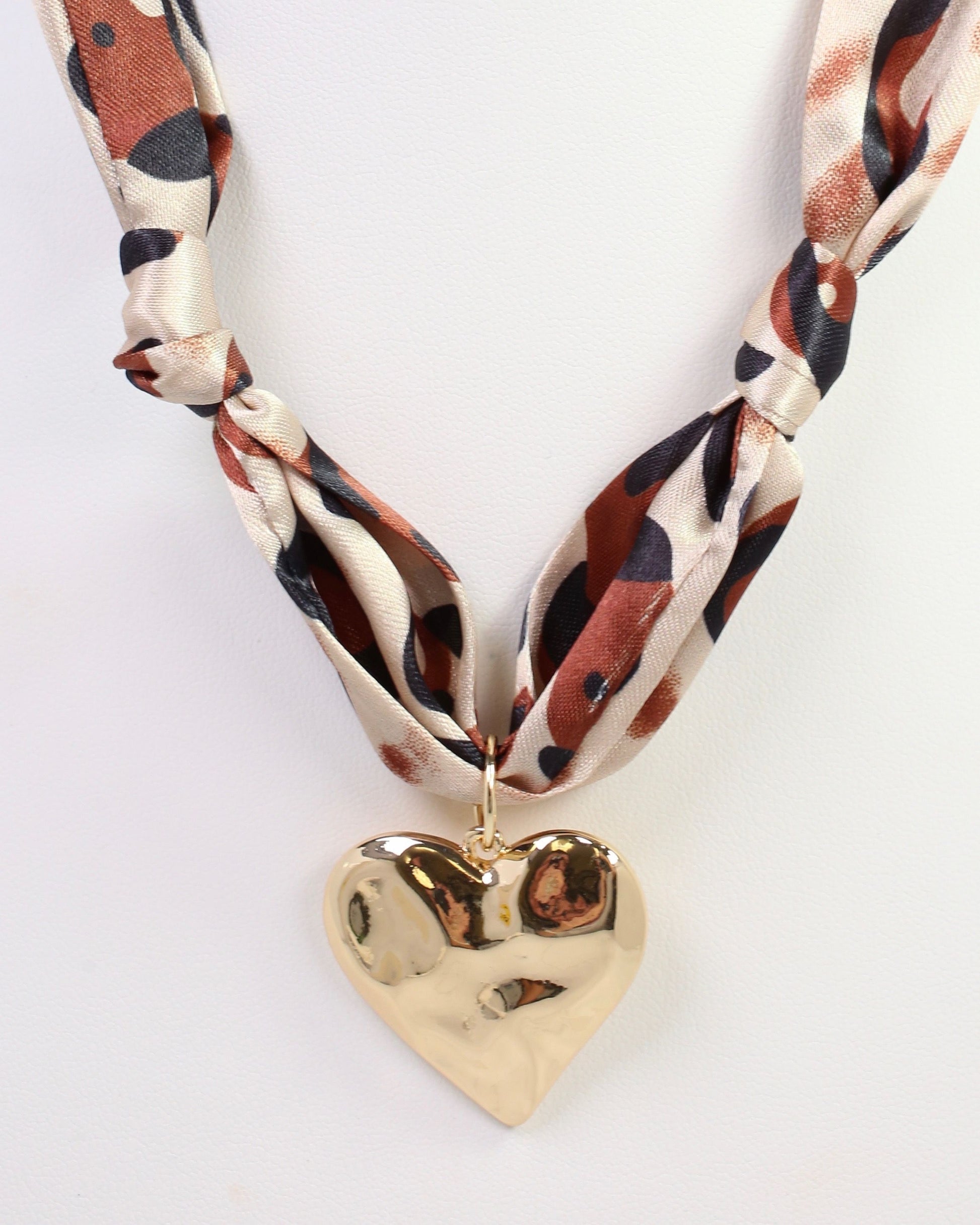 The Plaines Heart Charm Scarf Necklace in Leopard print blends playful charm with stylish edge. Featuring a soft scarf design accented by a delicate heart charm, this necklace adds a fashionable touch of wild sophistication to any outfit.