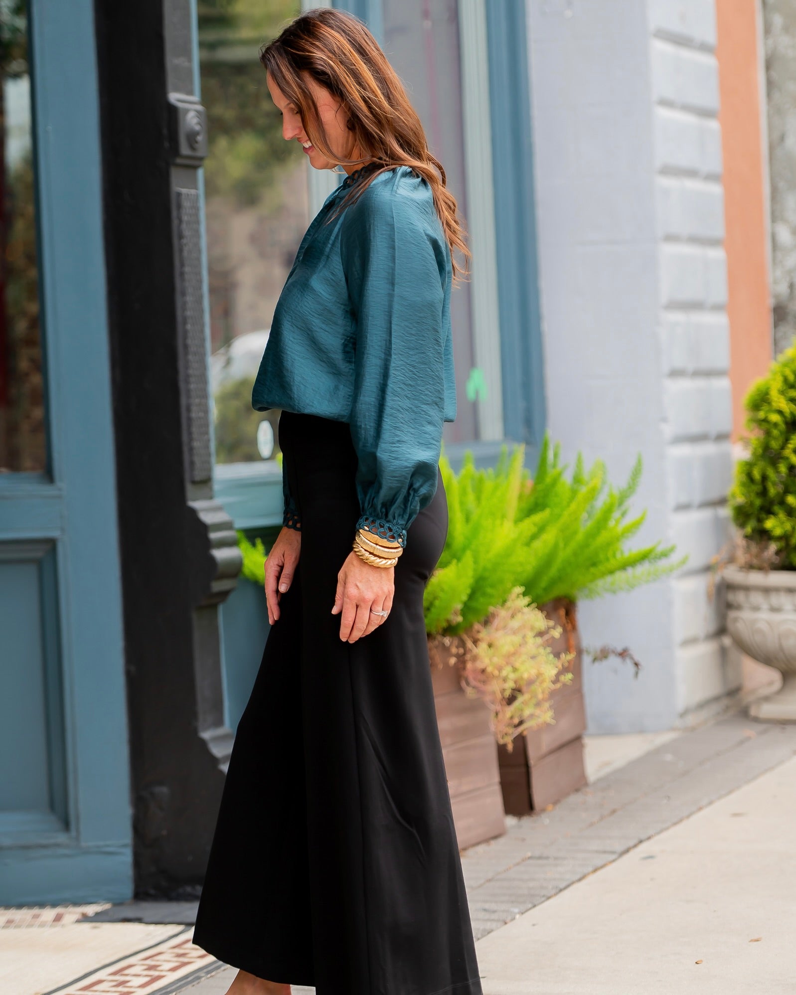 Elevate your wardrobe with the Polly Ponte Flared Pants in Black. Featuring a high-rise waist and a flattering flare leg cut, these pants combine style and comfort effortlessly. Crafted from ponte knit fabric, they provide structured support with just the right amount of stretch. The wide waistband and pull-on design ensure a sleek, streamlined fit that moves with you, perfect for any fashionable occasion.