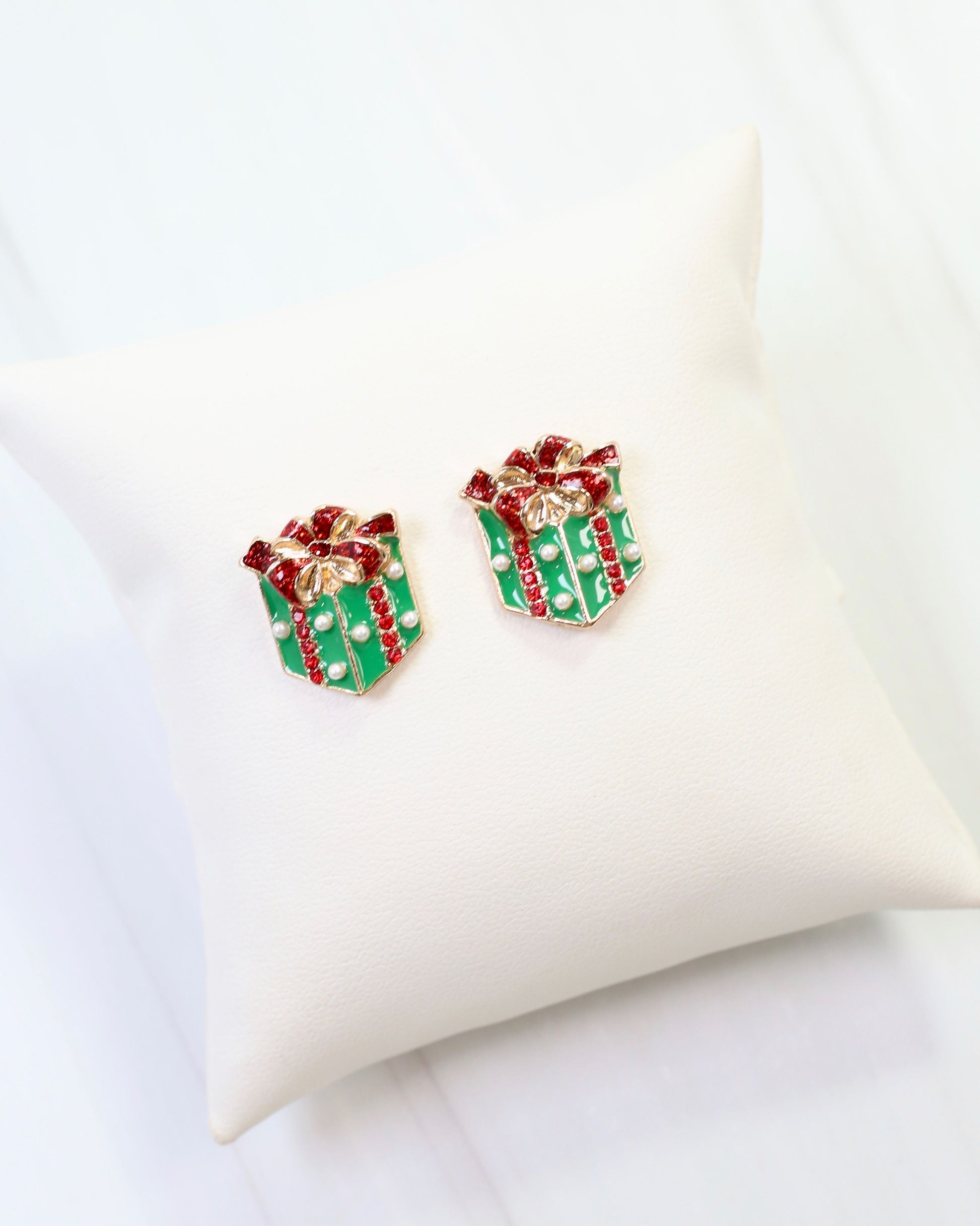 The Pretty Present Stud Earrings in green combine red stones and pearls for a stylish, elegant look. Perfect for adding a fashionable touch to any outfit.