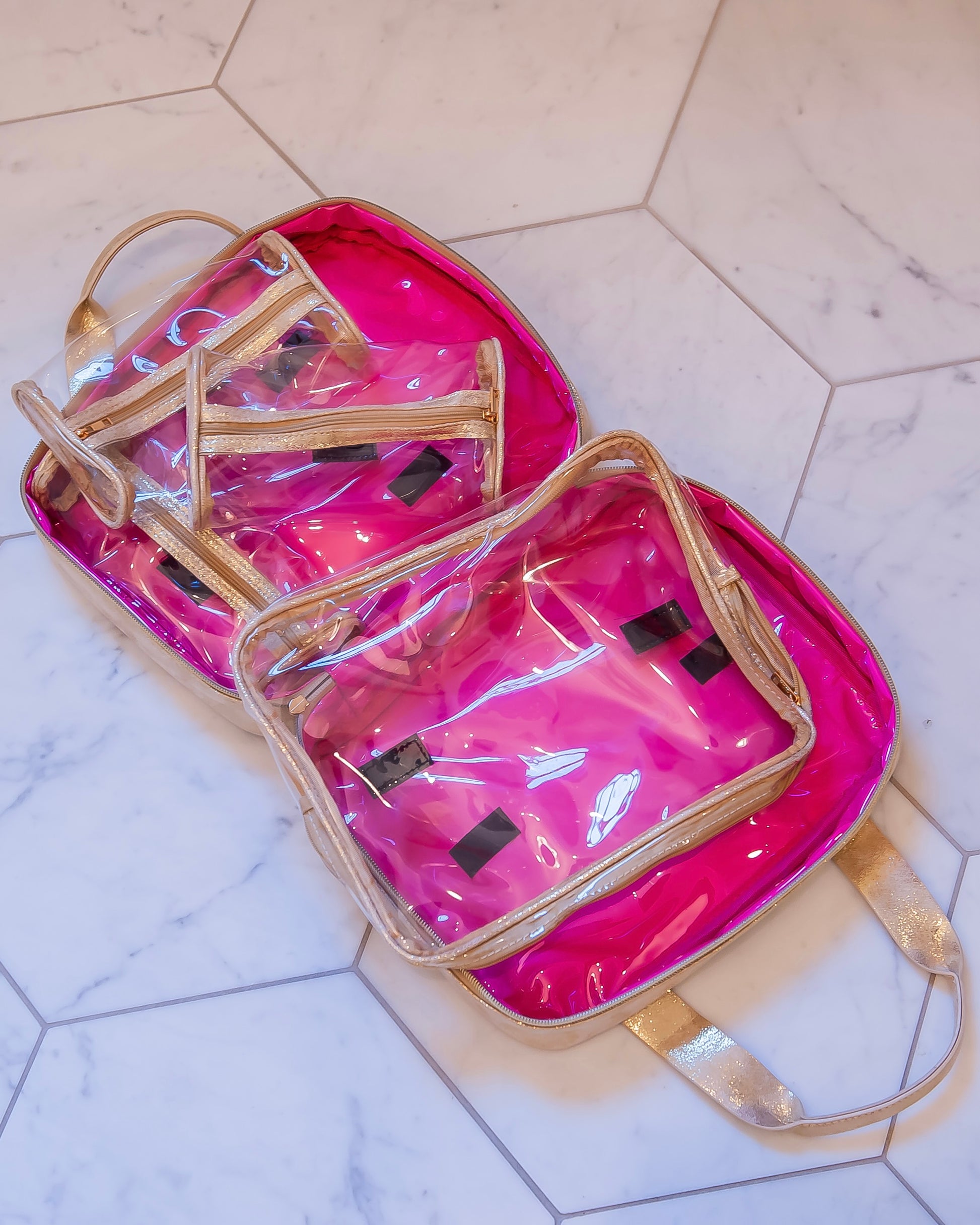 This large case is the ultimate makeup and travel piece. It features a quilted vegan patent leather fabric and two top carrying handles. The three sided zipper allows the case to unfold and lay completely flat, and the interior is lined with a hot pink fabric with a clear protective material. For ultimate organization, this case has four clear removable pouches that are attached to the interior with velcro. Each removable case has a zipper closure. The possibilities are endless when it comes to what this case can carry- cosmetics, toiletries, chargers, and more.