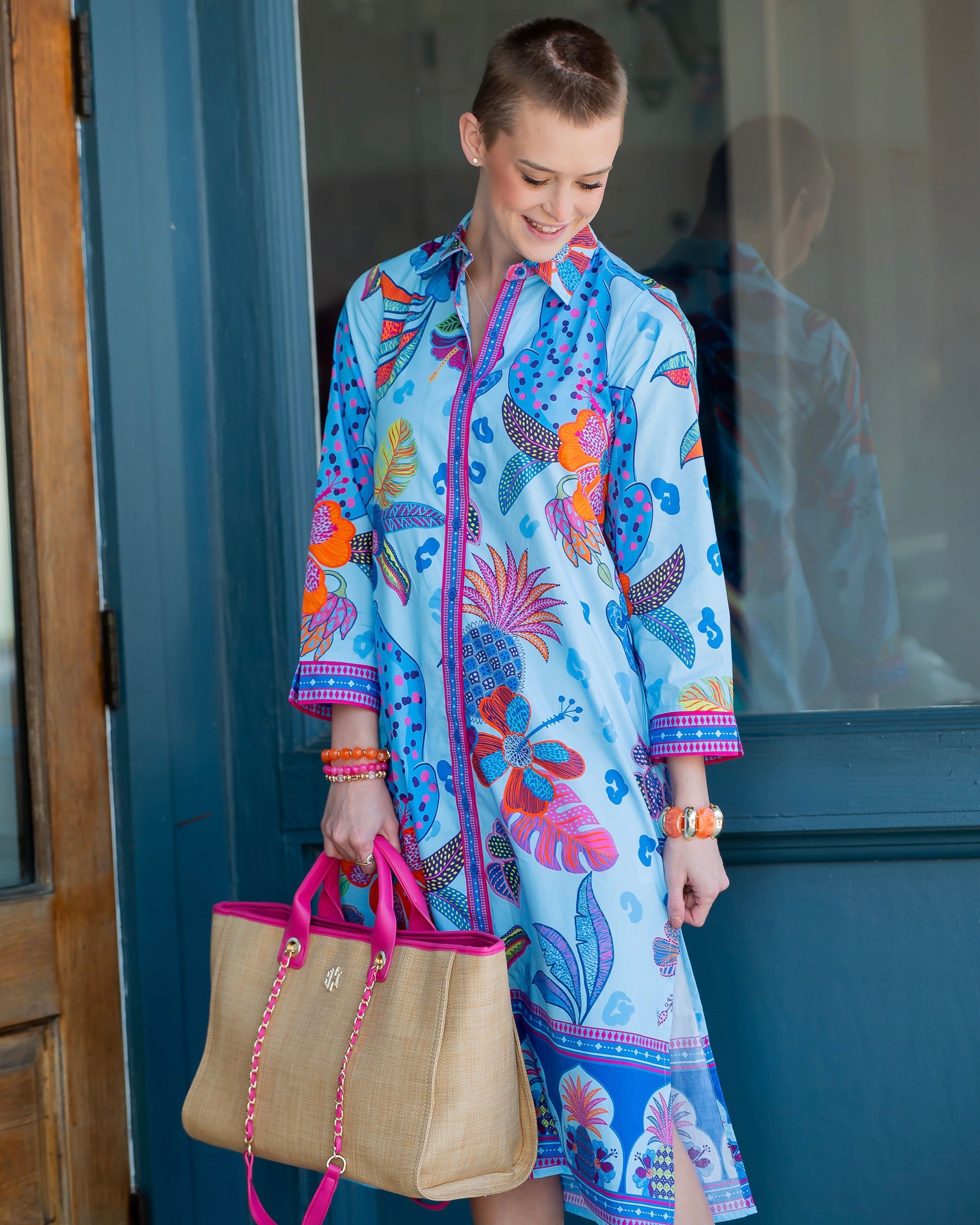 Embrace adventure in our Eliza Tropical Safari Print Button Down Dress. This statement piece features a vibrant safari-inspired print that brings exotic flair to your everyday wardrobe. The classic button-down silhouette pairs with a crisp collar for polished sophistication, while functional side pockets add practical style. Strategically placed side slits extending to the mid-calf create effortless movement and a modern edge. Perfect for warm-weather dressing, travel, or making a bold impression.