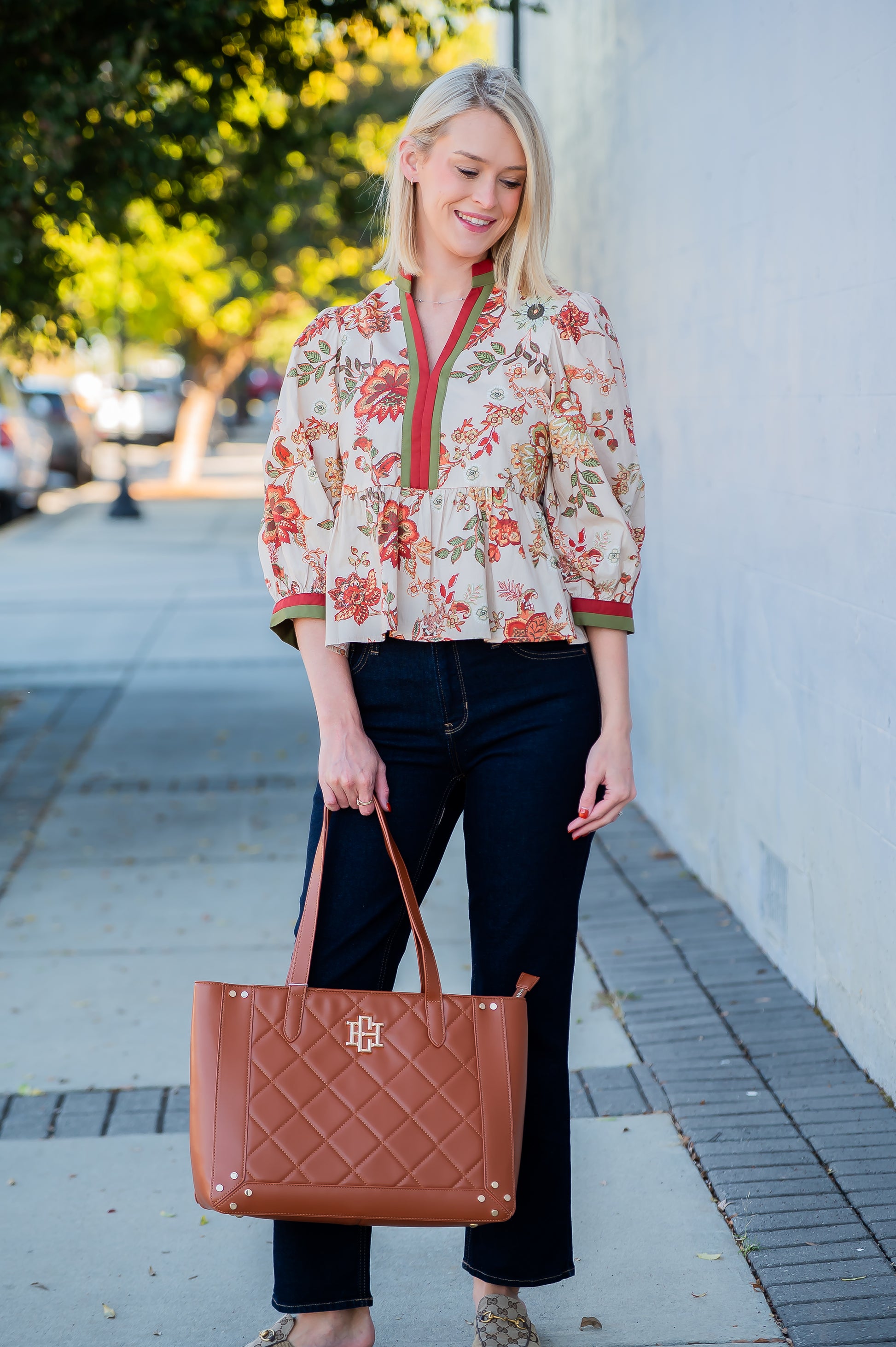This Salina Floral Print Top brings playful charm to your wardrobe with its ¾ sleeves and contrasting rust and green binding along the V-neck. The flattering peplum waist adds a flirty touch, while the ecru background showcases a lively mix of rust, orange, and green botanical blooms, perfect for fun, fashionable days.