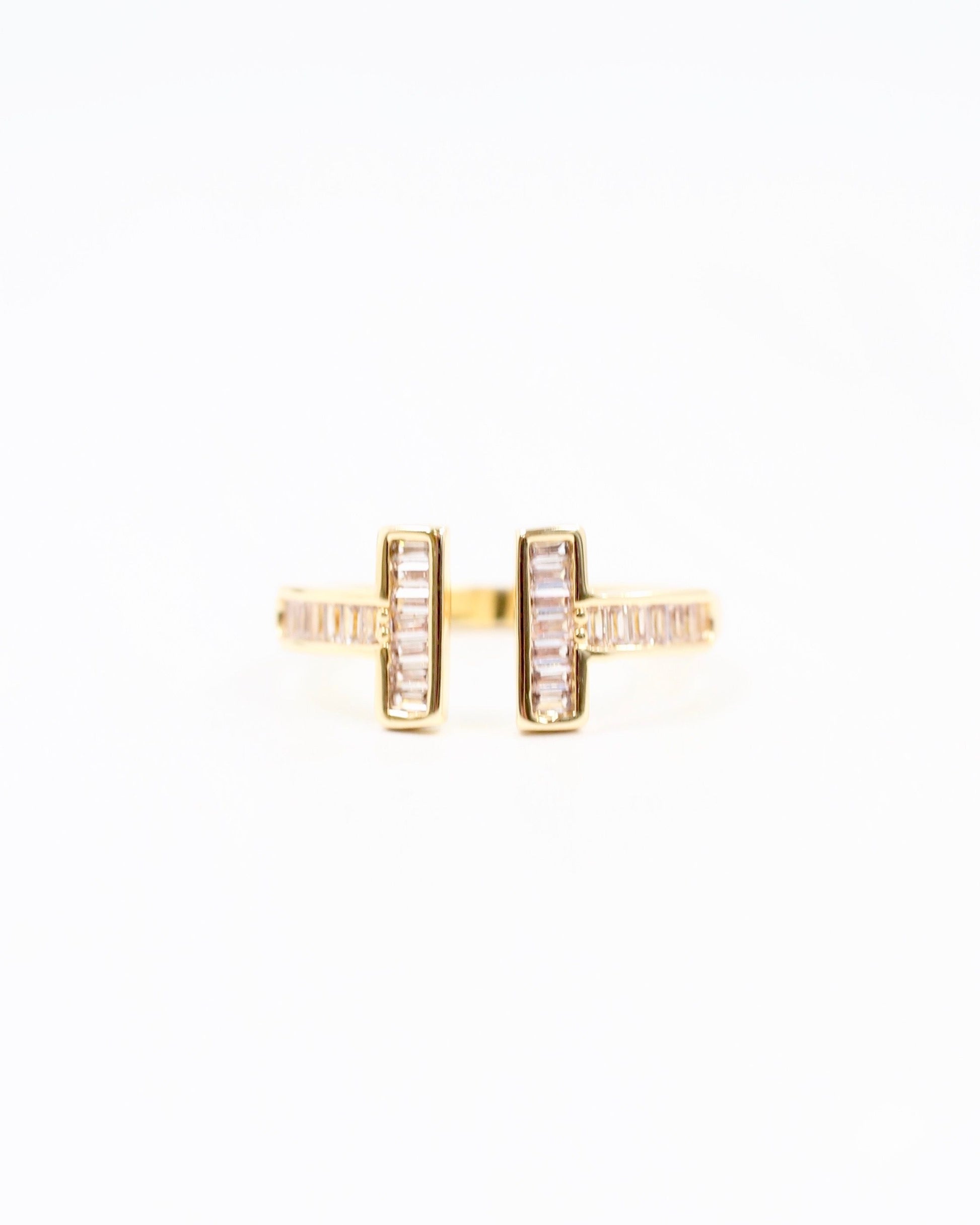 The Richmond Ring in Gold features an elegant open "T" design adorned with baguette-cut cubic zirconia stones, adding a refined sparkle. Crafted from gold-dipped brass, this adjustable ring offers both durability and a perfect fit, making it a sophisticated addition to any jewelry collection.