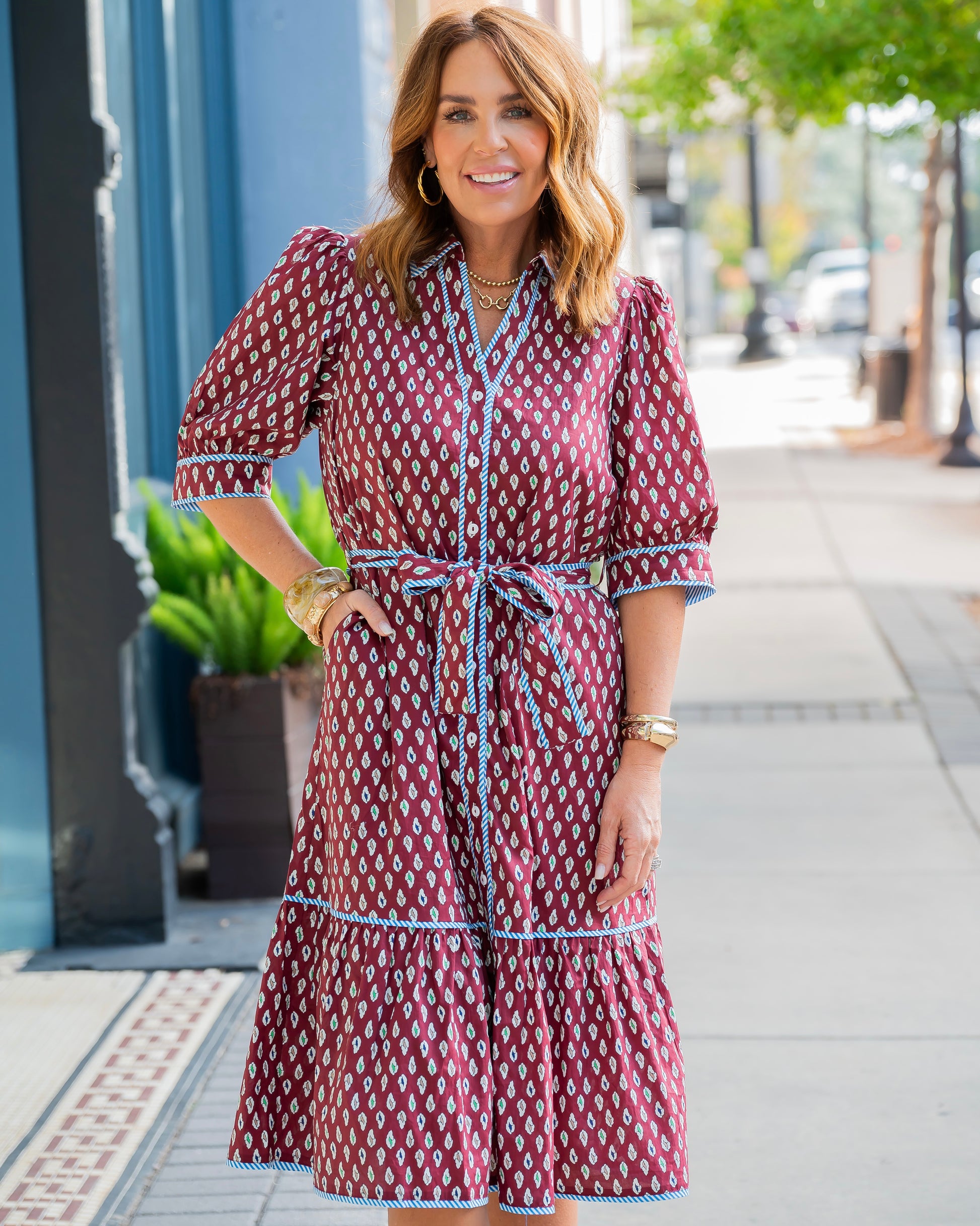 Turn heads in the Riverview Print Midi Dress, featuring a rich burgundy background with vibrant cream and green patterns. Fun blue and white striped fabric accents the sleeves, collar, front, and hem for a playful contrast. The button-down front and self-tie belt let you customize the fit while keeping your look effortlessly chic and fashionable.