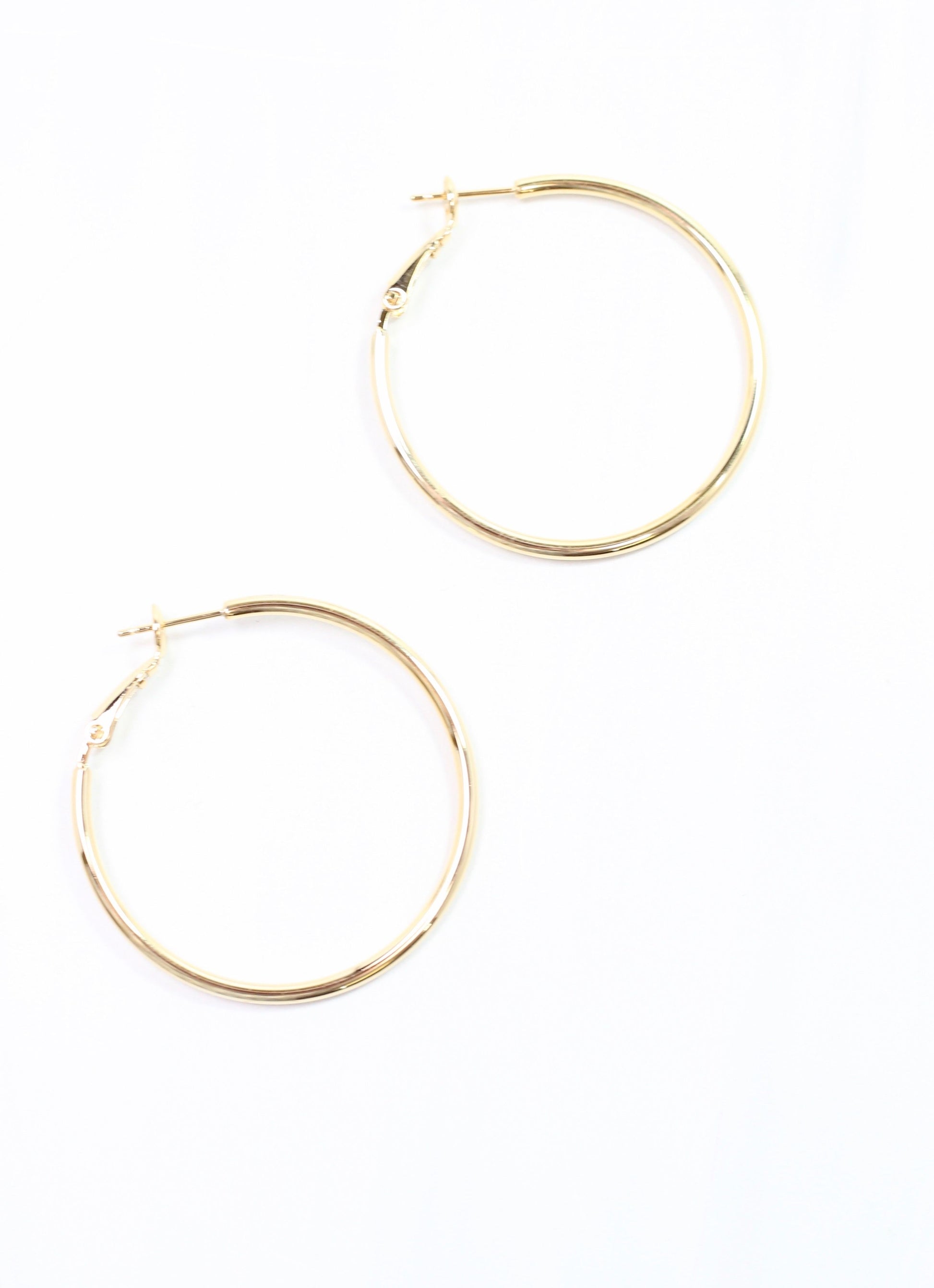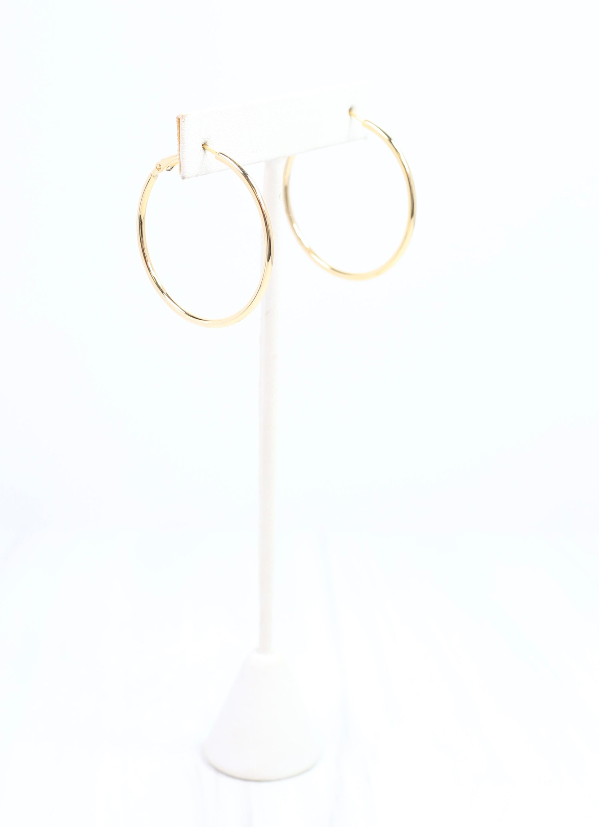 This thin hoop earring is a great basic size in thickness and diameter. It has a latchback closure and will easily transition from day time to evening looks.