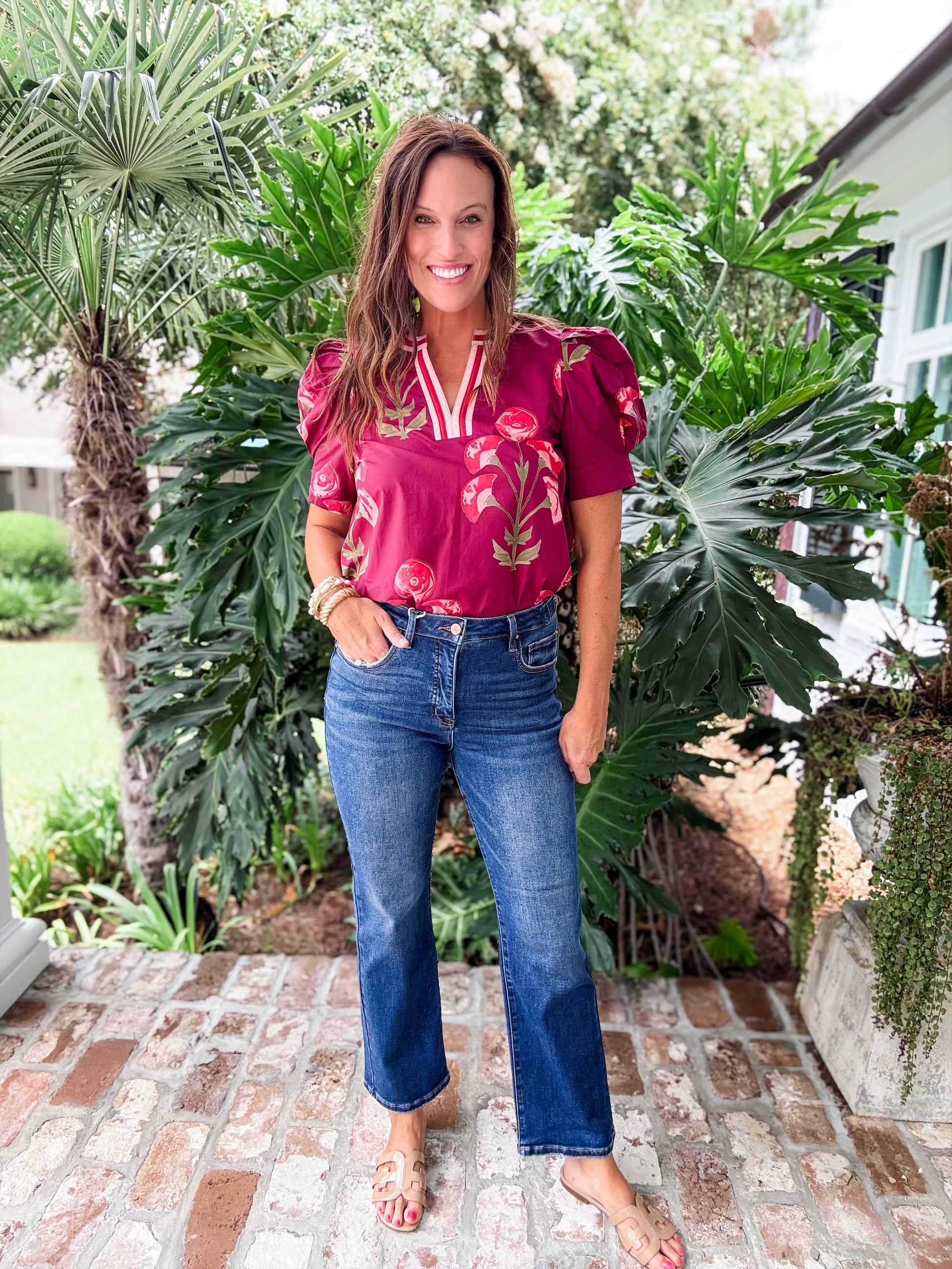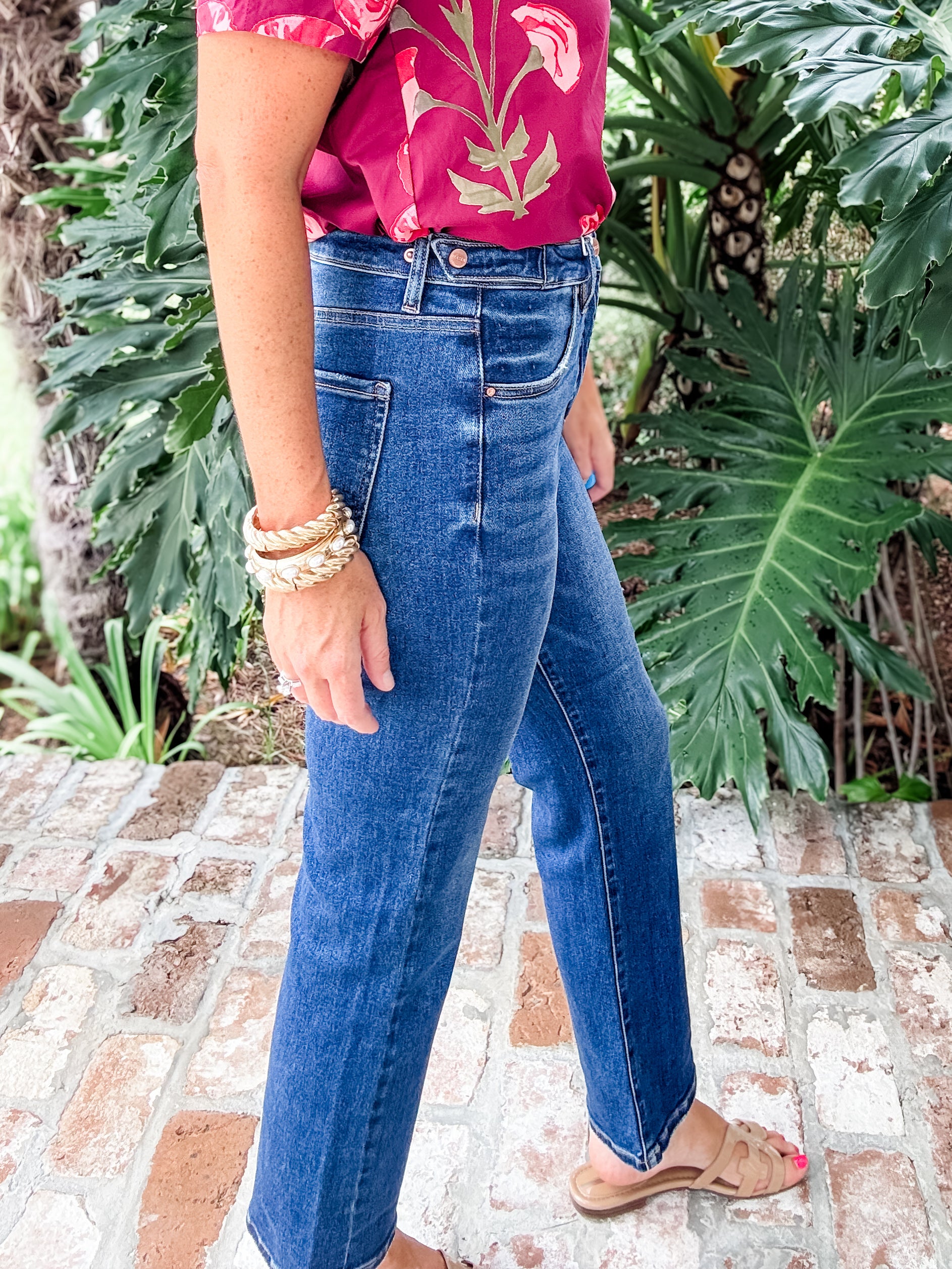 These Risen Jeans feature a high-rise ankle-length straight leg design with an adjustable waistband for a perfect fit. The tummy control feature offers a flattering silhouette, combining comfort and style effortlessly for a chic, modern look. Dark denim wash looks great with transitional tops as we head into the Fall season.