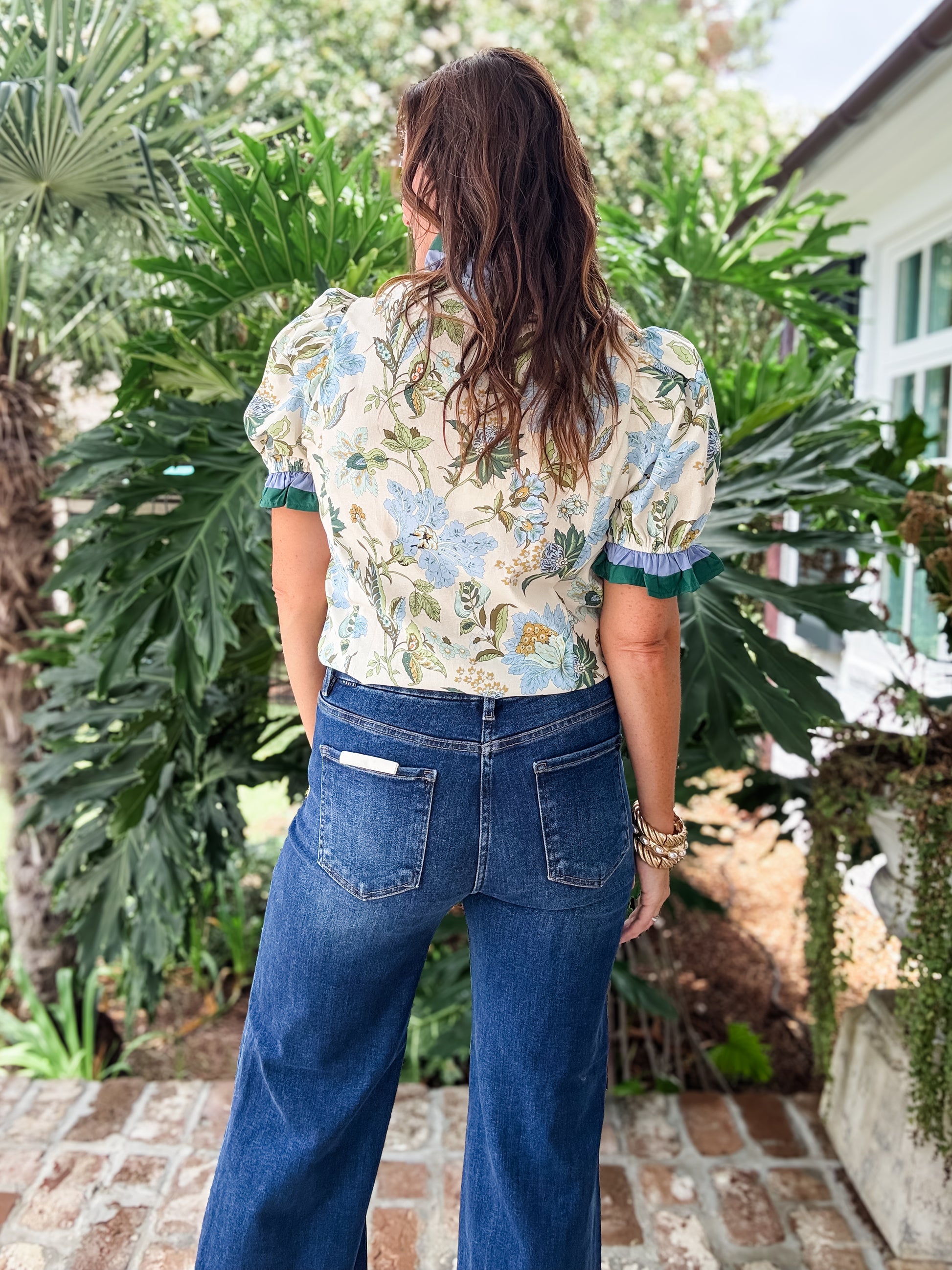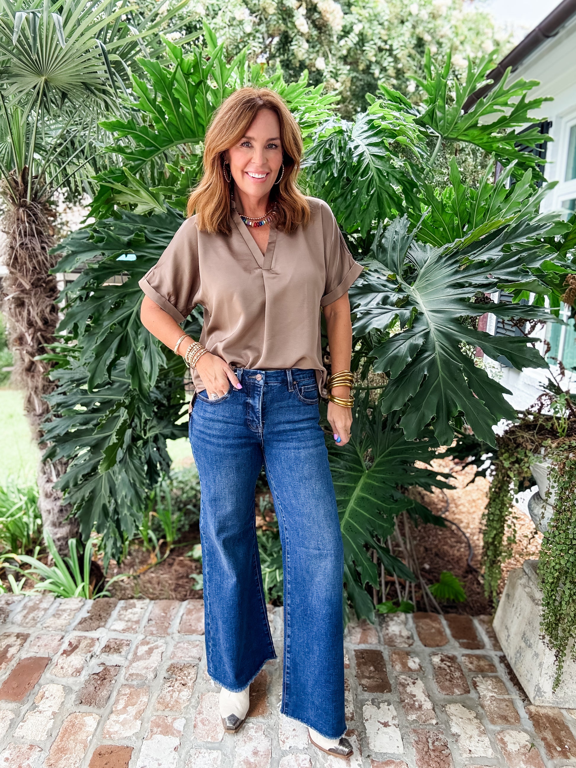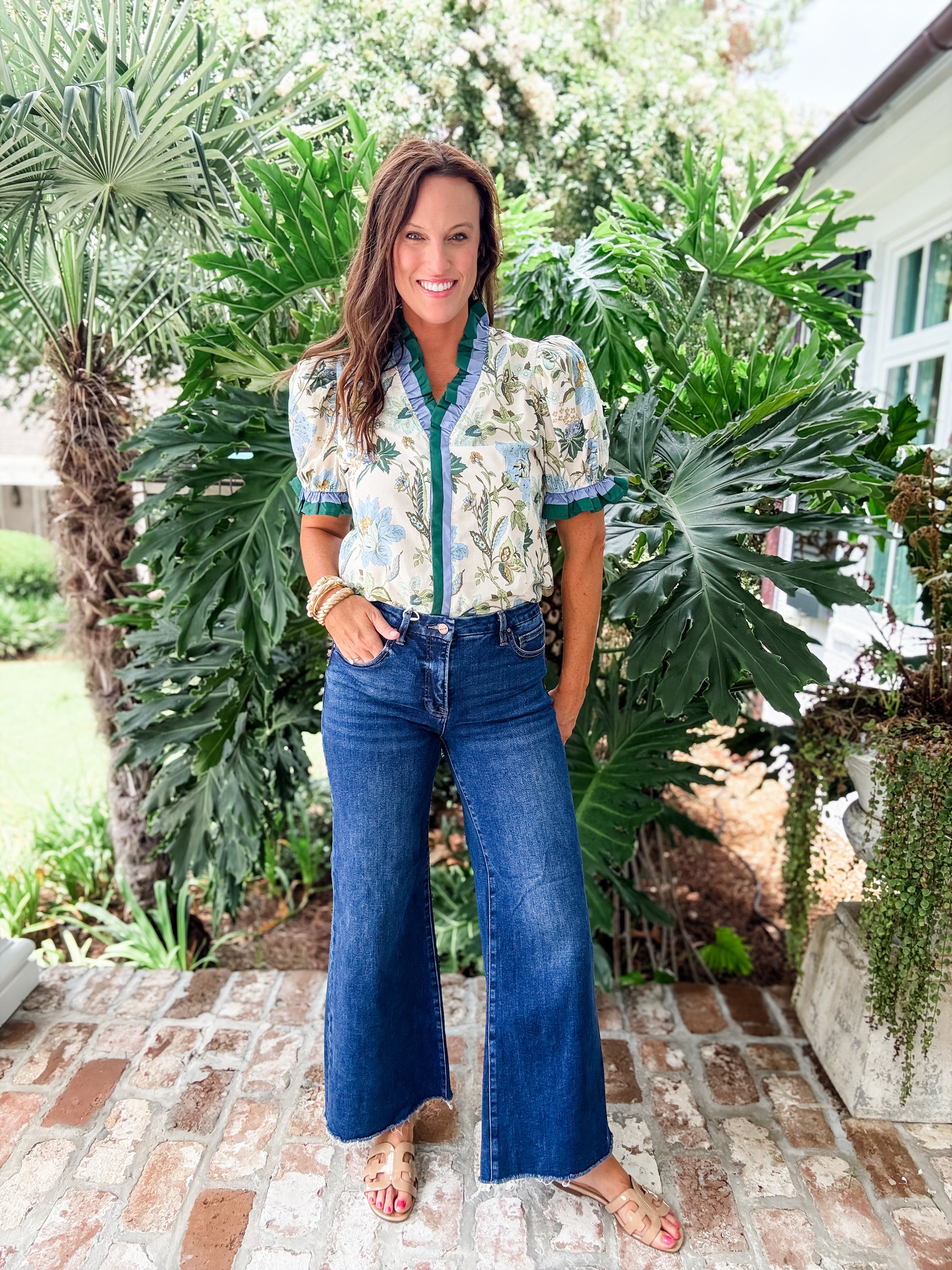 These mid-rise wide jeans offer tummy control for a flattering fit and feature a classic dark medium wash. The raw hem adds a trendy touch and allows you to easily customize the length to suit your style. Perfect for a fashionable, comfortable look.