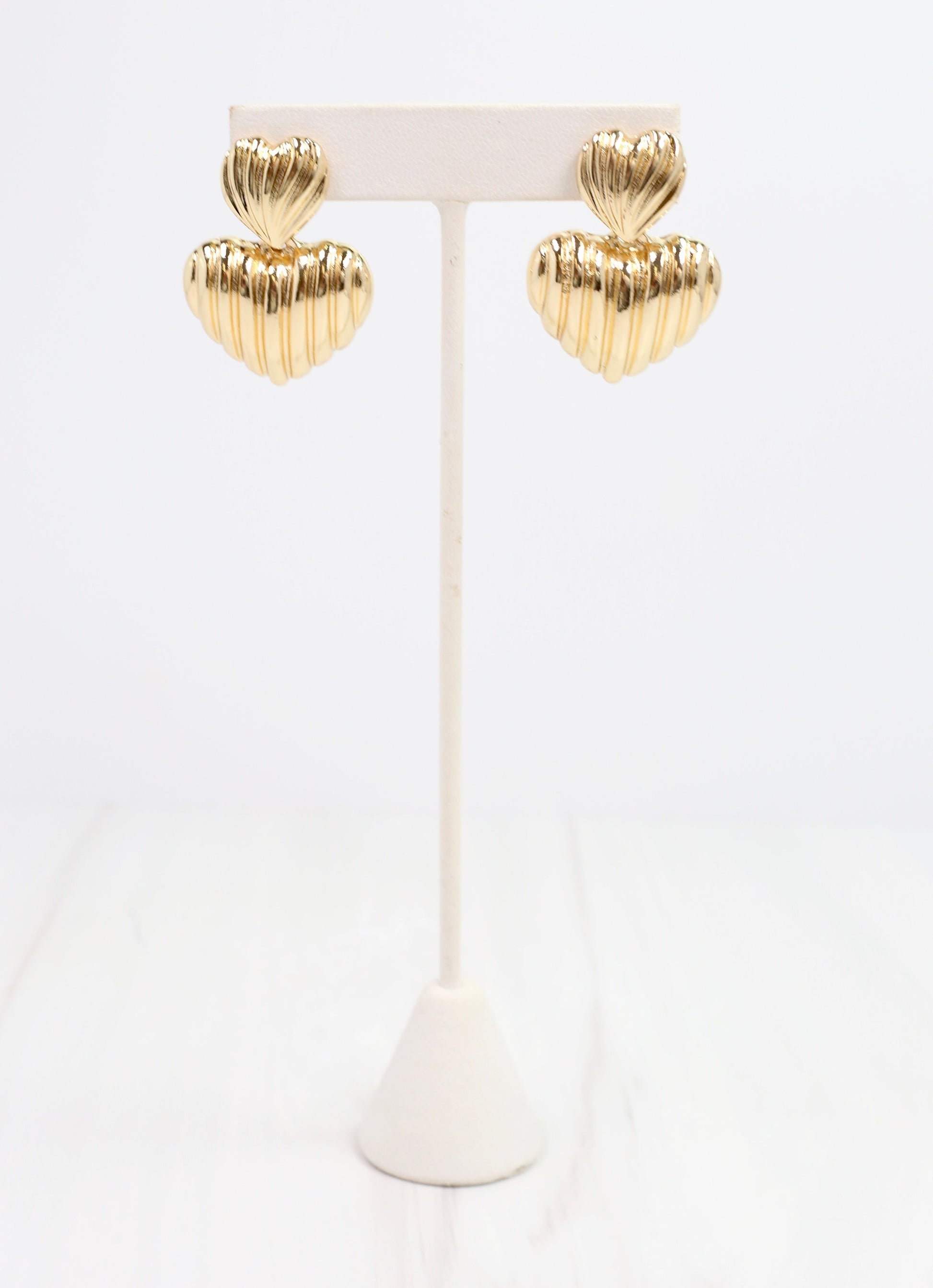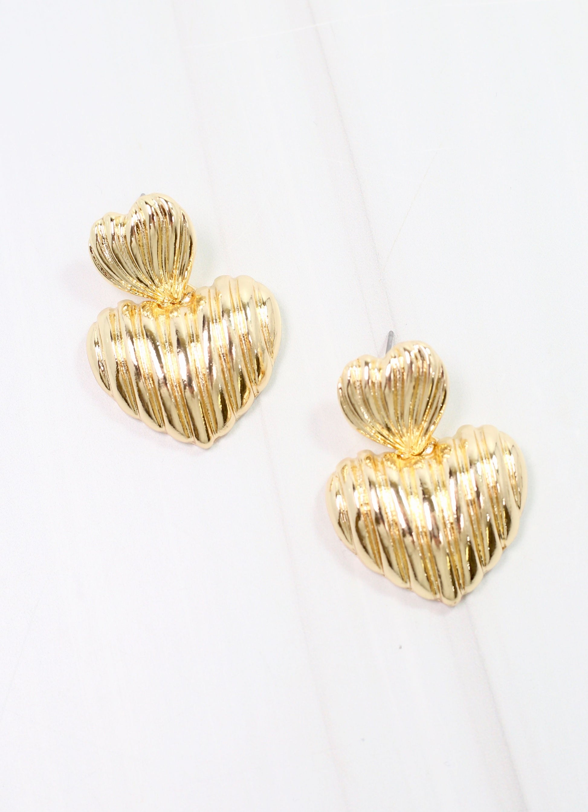 This double drop heart earring has a ribbed textured design on a post back. It's a fun accessory to add a little fun to your outfit.