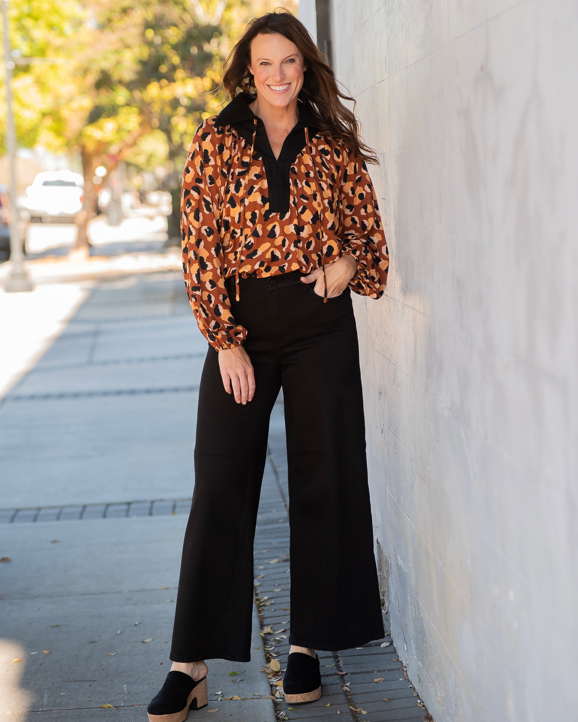 The Ronnie Suede Feel Collar Blouse brings playful charm with its black suede feel collar and tie front detail. Showcasing a vibrant brown and black animal print, this lightweight blouse offers a fun, flirty option for fall that easily brightens any outfit while keeping comfort in mind.