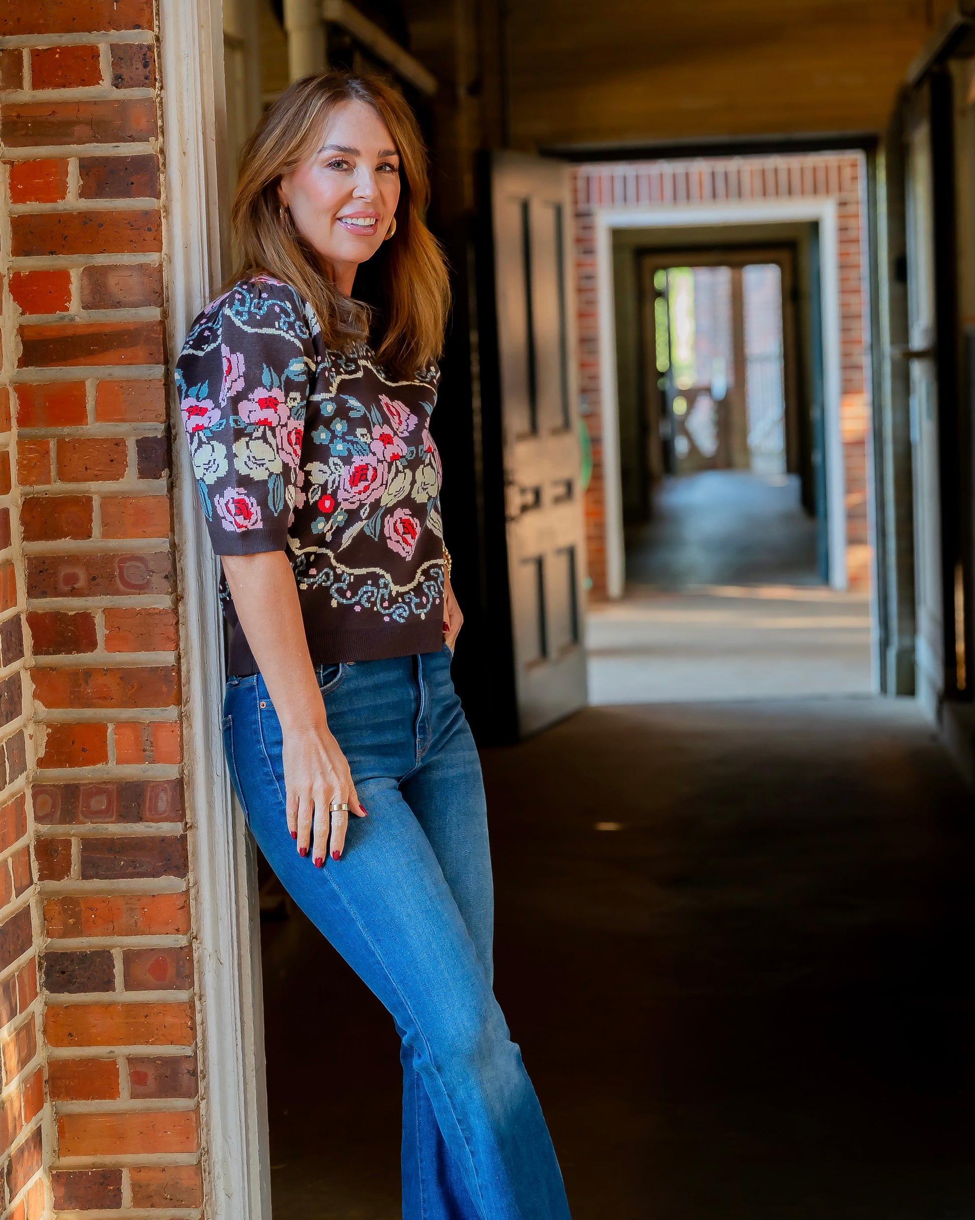 This brown short-sleeve floral knit top features charming puff sleeves and a delicate pattern of pink and pale yellow flowers. Crafted from a lightweight, ultra-soft fabric, it’s perfect for effortlessly elevating your look, whether you’re dressing up or keeping it casual.