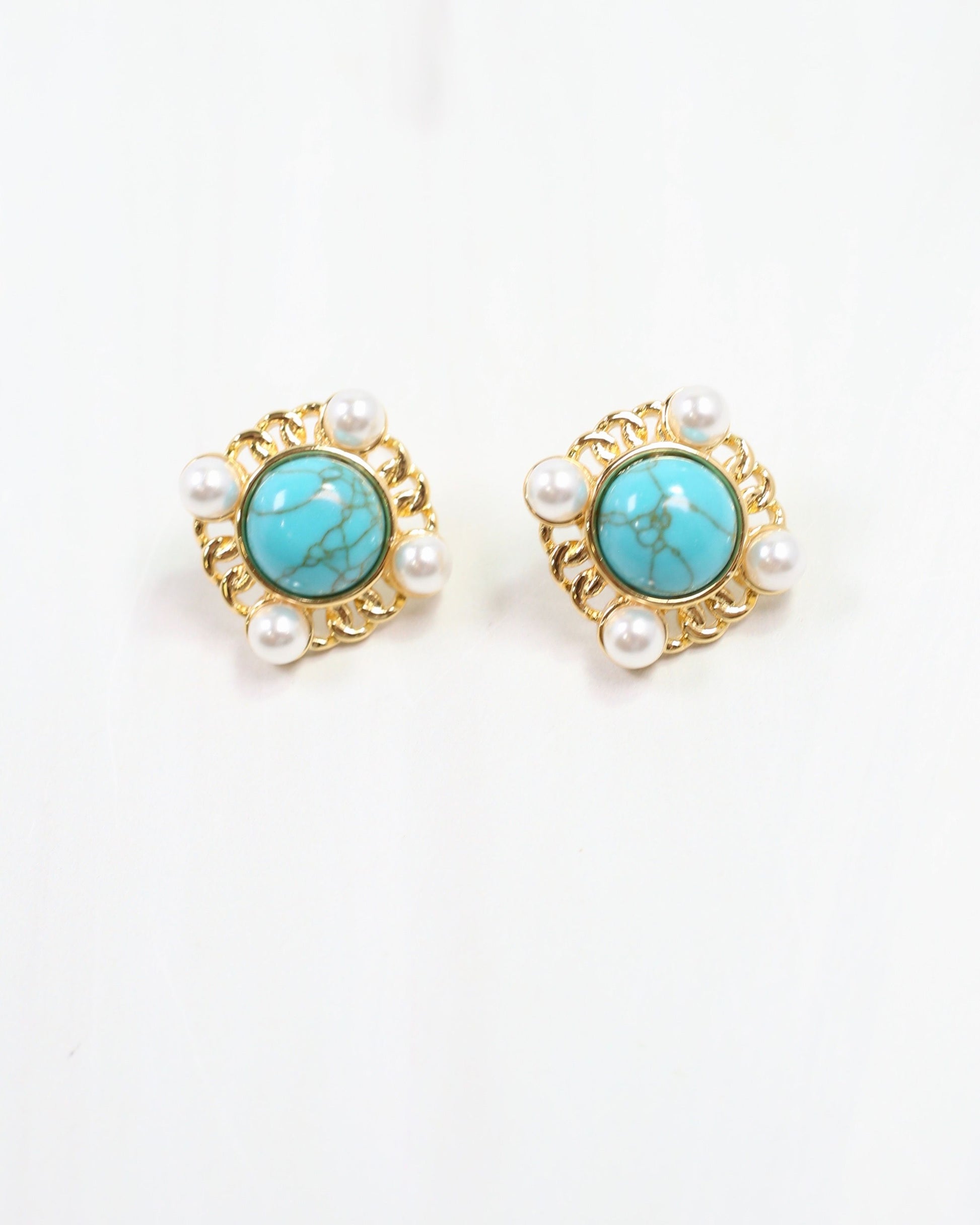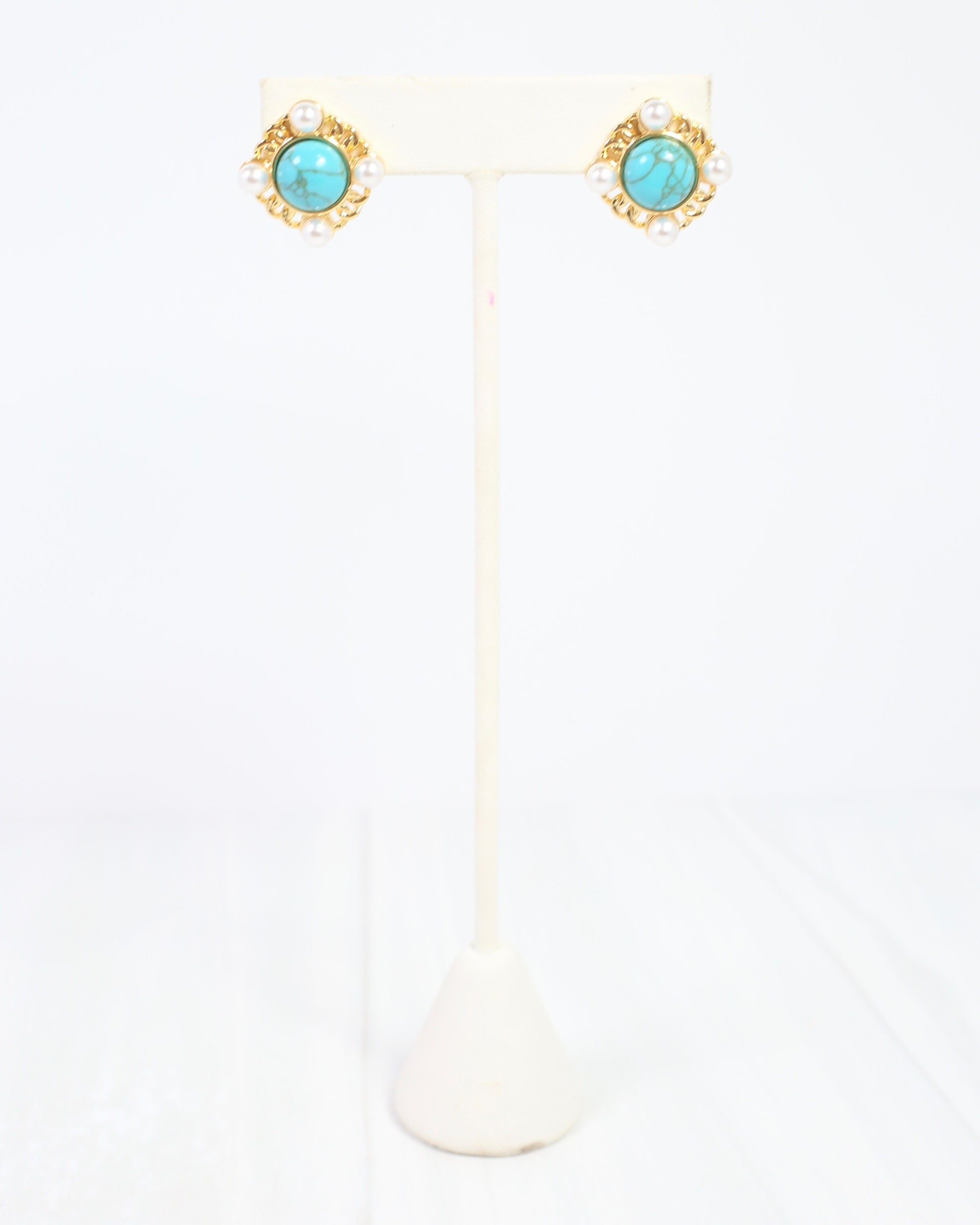 These Sante Fe Turquoise and Pearl Studs in gold feature an eye-catching square design accented with pearl points and a vibrant turquoise centerpiece. The gold scalloped edges add a refined touch, while the gold-dipped brass construction ensures lasting quality. Perfect for elevating any outfit with a chic, Southwestern-inspired flair.