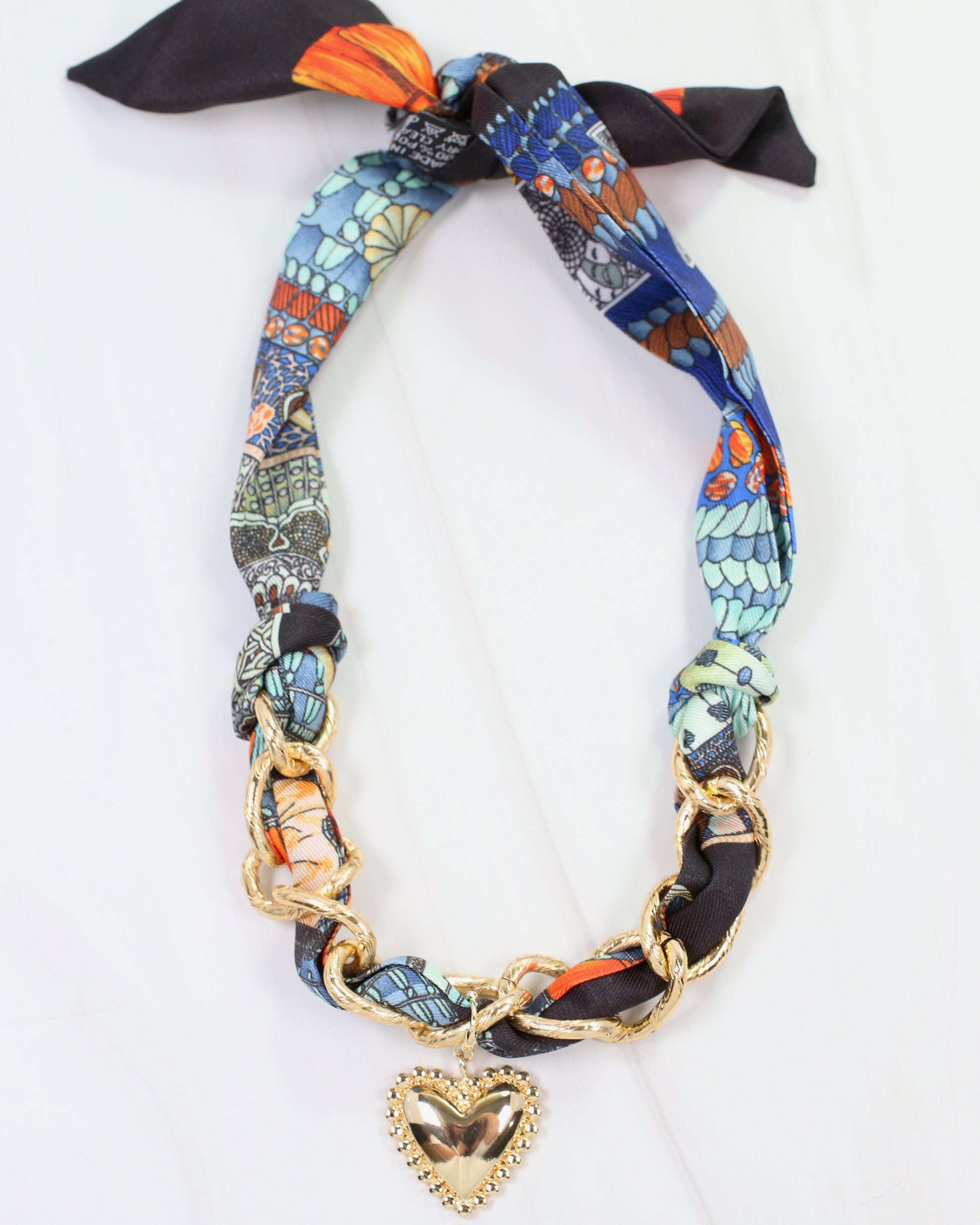 Add a fresh twist to your accessories with this playful scarf necklace. Featuring a delicate chain artfully twisted through rich blue and orange multi printed fabric, it’s finished with an adorable heart charm that adds a touch of charm wherever you go. Perfect for elevating any outfit with a fun and flirty vibe