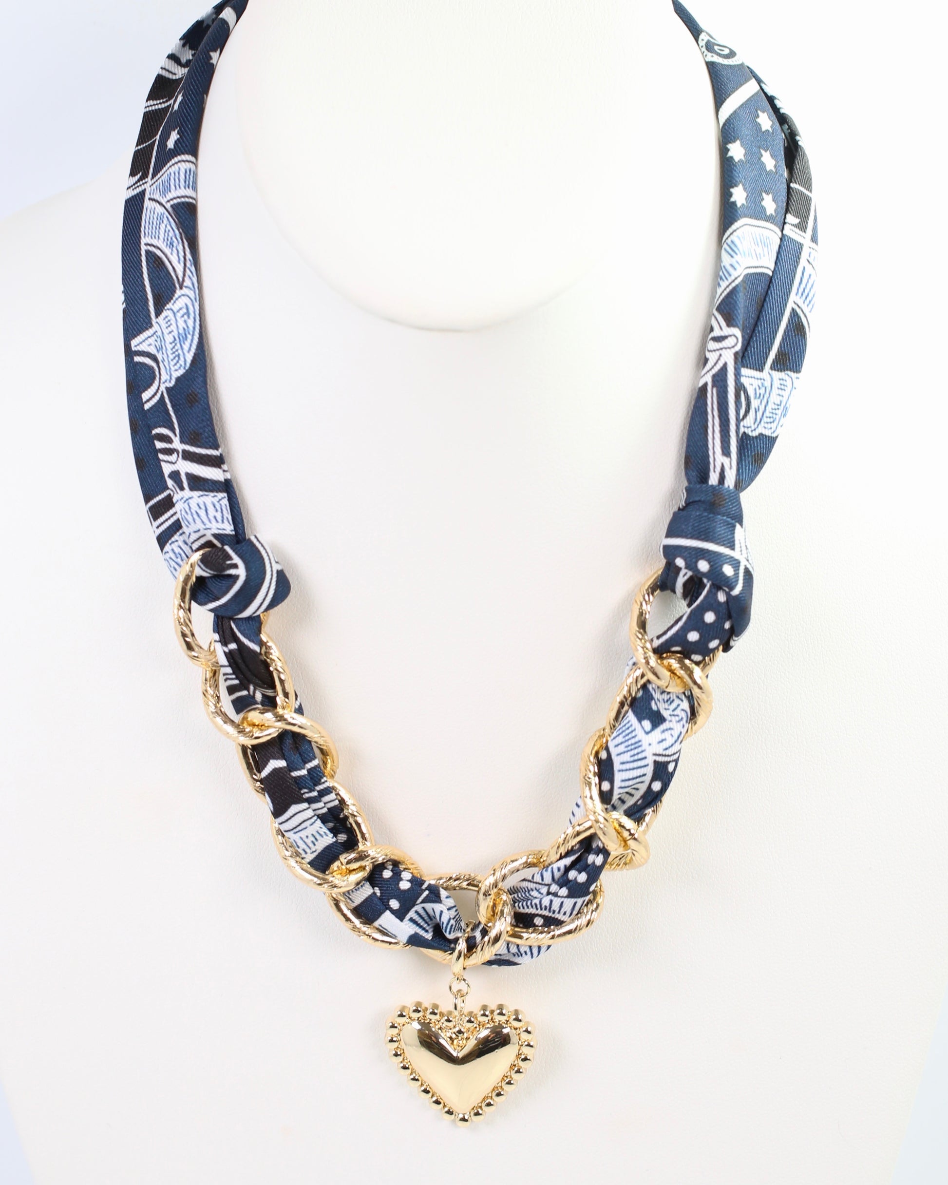 Add a fresh twist to your accessories with this playful scarf necklace. Featuring a delicate chain artfully twisted through soft navy and olive bandana print fabric, it’s finished with an adorable heart charm that adds a touch of charm wherever you go. Perfect for elevating any outfit with a fun and flirty vibe