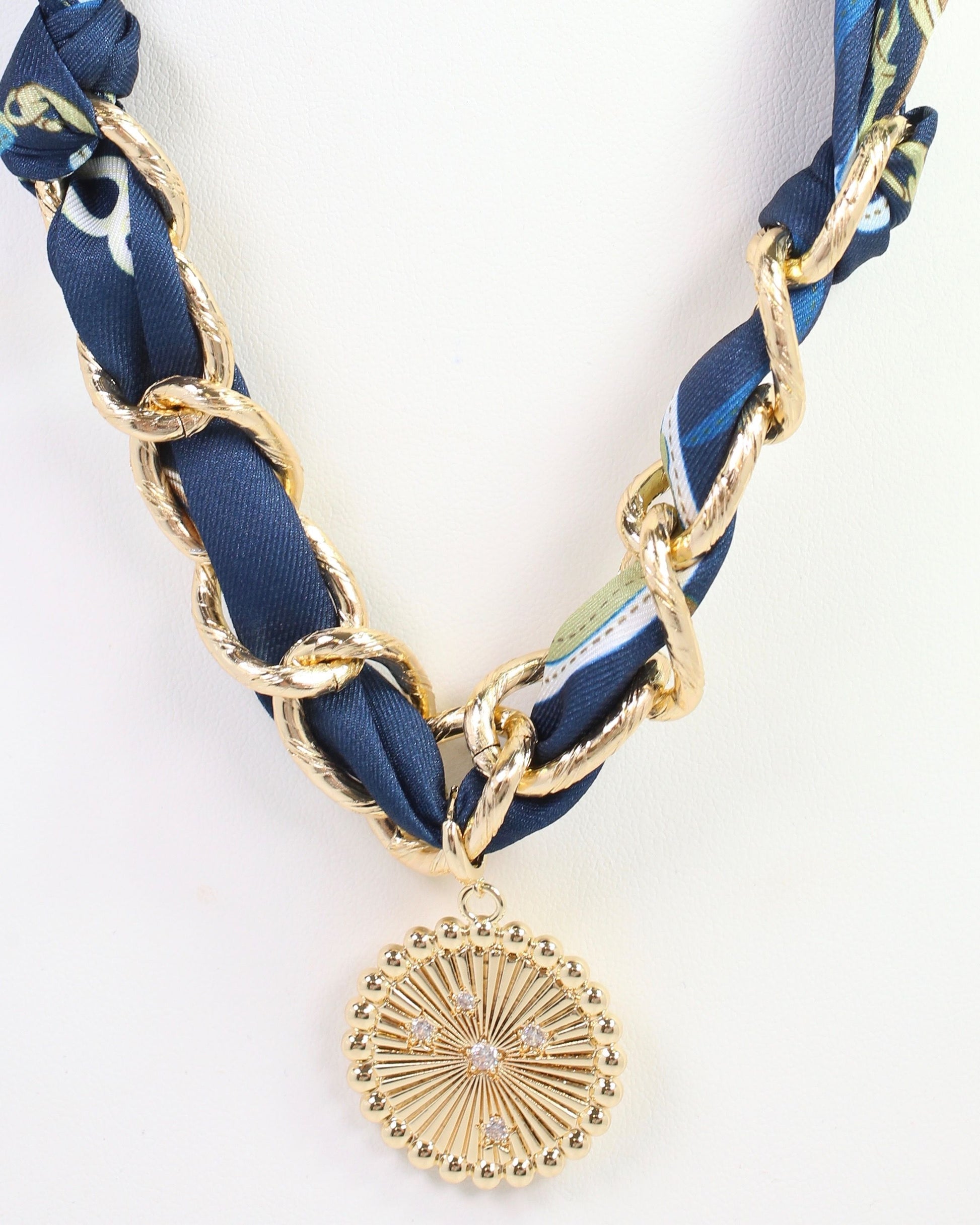 Enhance your accessory collection with the Sarah Scarf Charm Necklace in Navy Tan. This fashionable necklace combines a chic charm with a soft scarf detail in versatile navy and tan hues, adding a refined and stylish touch to any outfit. Perfect for dressing up or adding a polished accent to casual wear.
