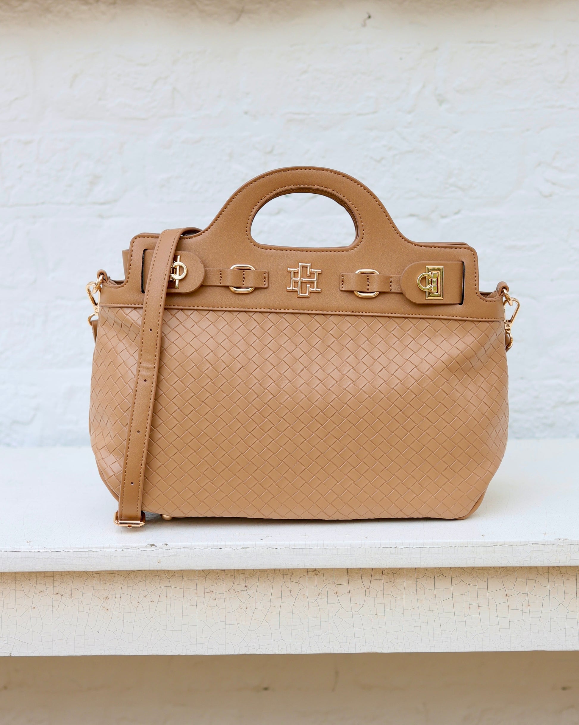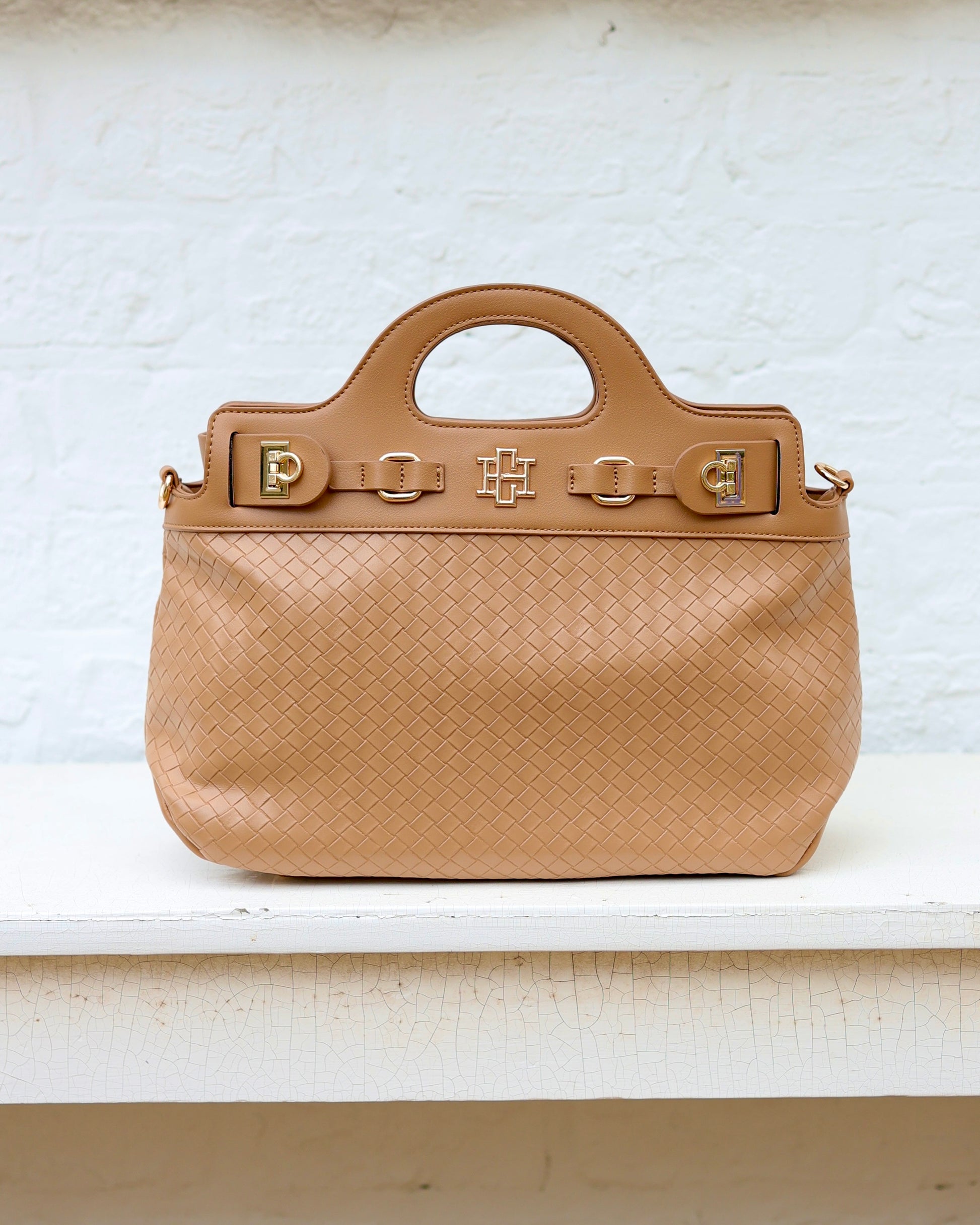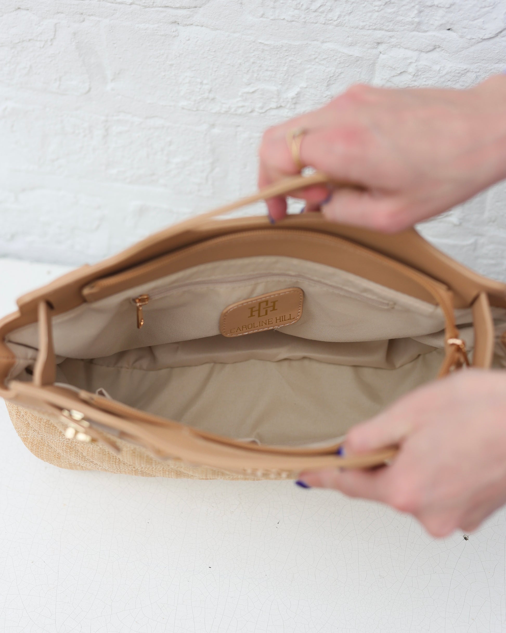 This modern handbag has a classy yet trendy silhouette. It is designed with a straw fabric with a vegan leather trim. There are two open top carrying handles as well as a removable and adjustable crossbody strap. The accent gold hardware adds a fashionable touch that elevates the whole look of this bag as well. The top zipper closure leads to the open interior with one zippered pocket and two open pockets. It also has feet on the bottom of the bag for added protection.