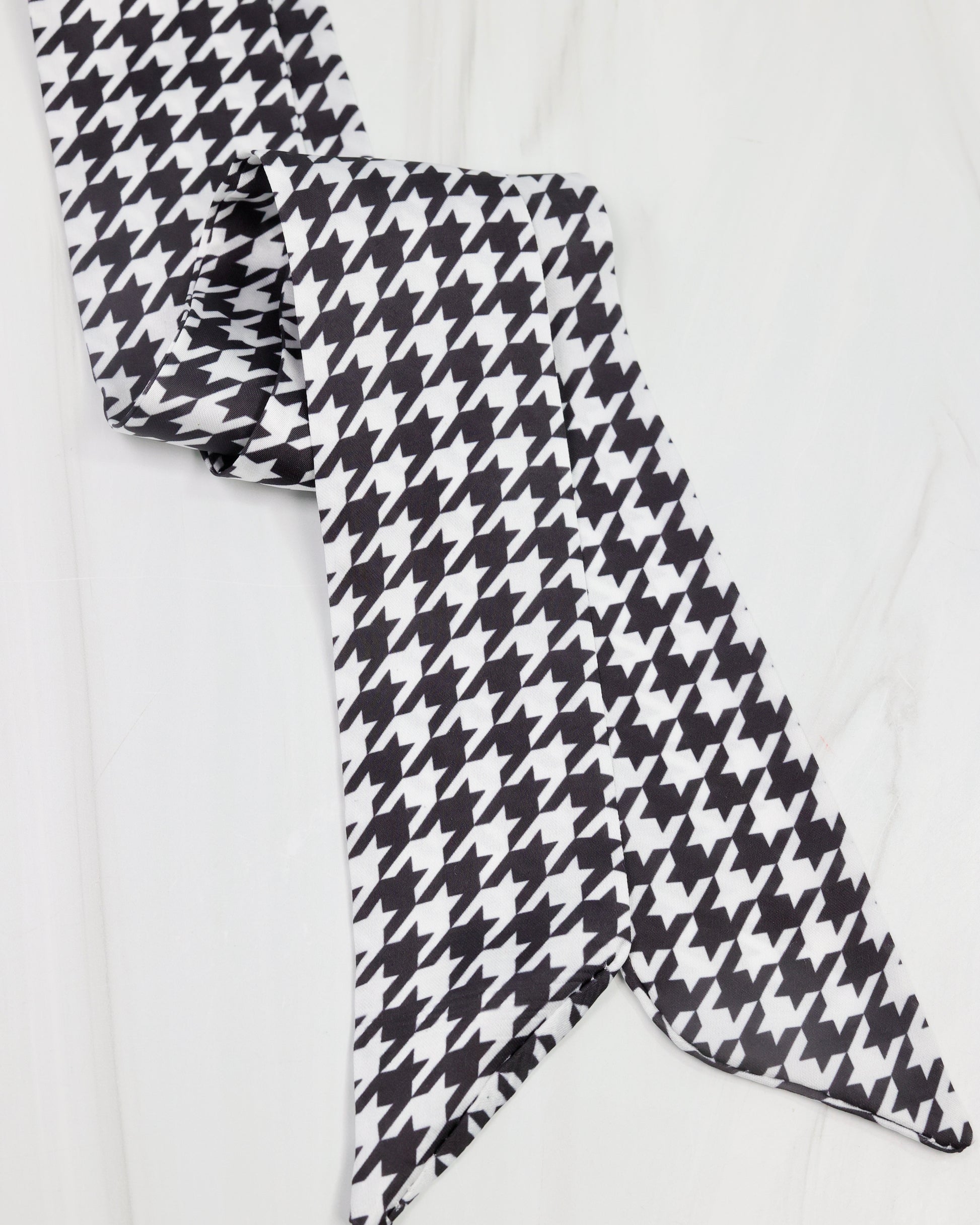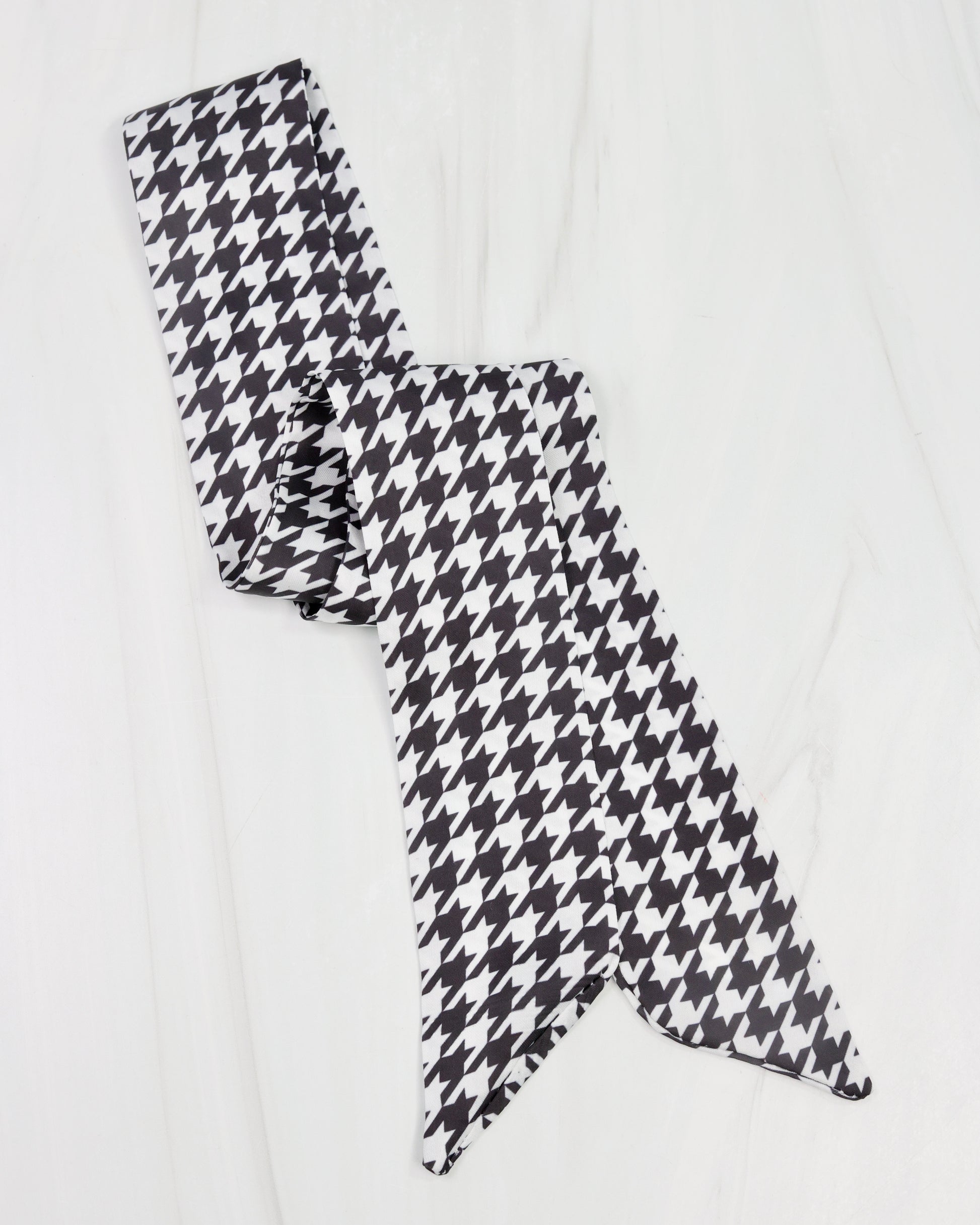 Add a stylish touch to any outfit with the Serafina Scarf in a classic Black and White print. Its smooth satin-like texture makes it perfect for tying around your neck, wrist, bag, or even your cowgirl boots, adding a playful and fashionable flair wherever you wear it.