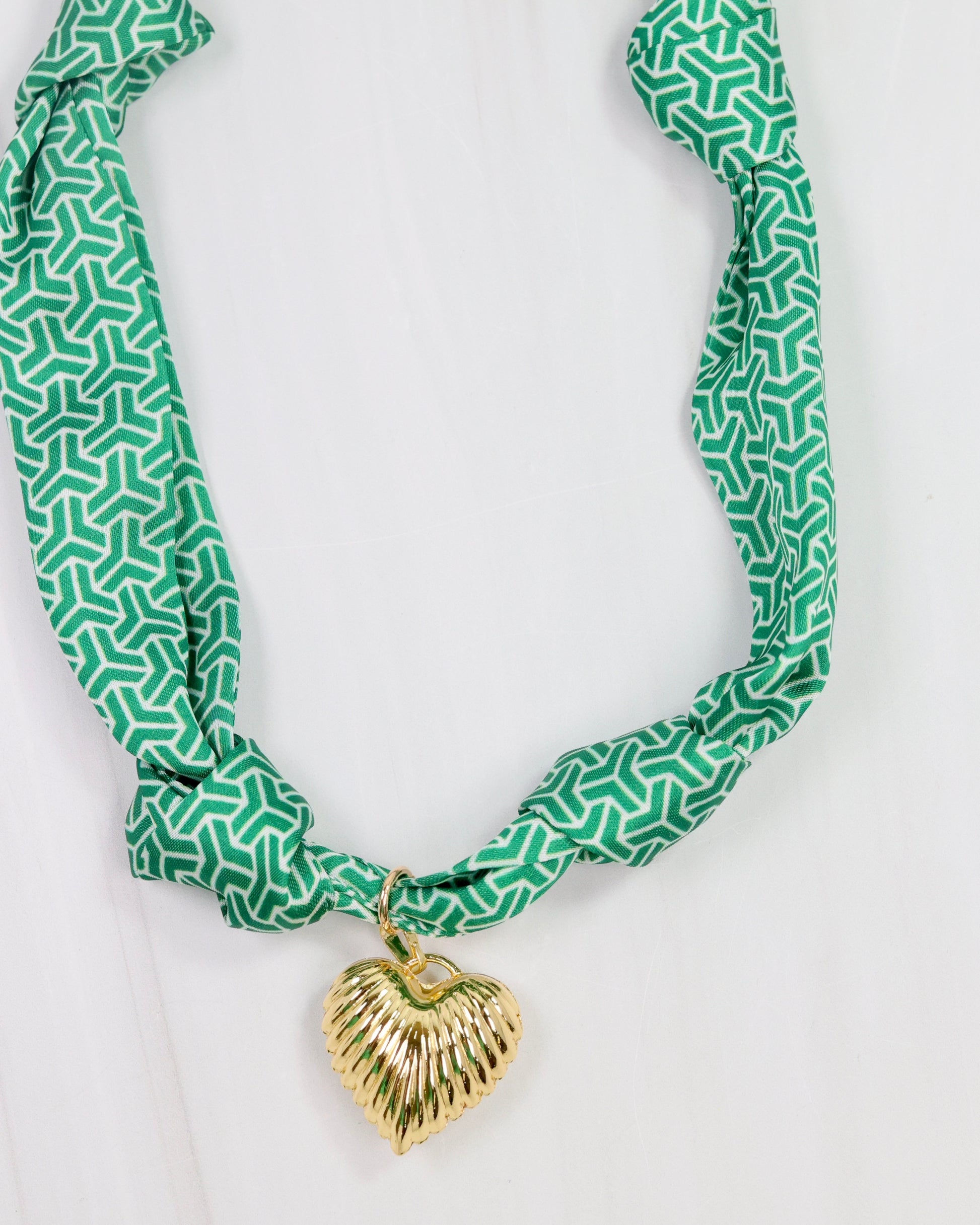 Elevate your look with the Serafina Scarf Charm Necklace featuring a playful Green print. This satin-feel scarf is accented by a ribbed puff heart charm pendant, adding a playful yet chic touch. Designed with two stylish knots and a tie-back closure, it offers adjustable comfort and a perfect fit for any outfit.