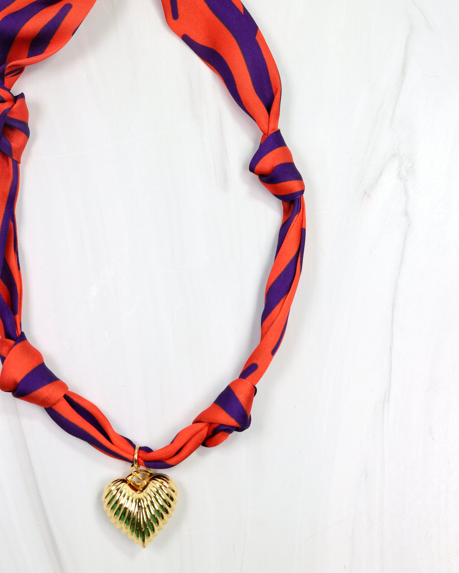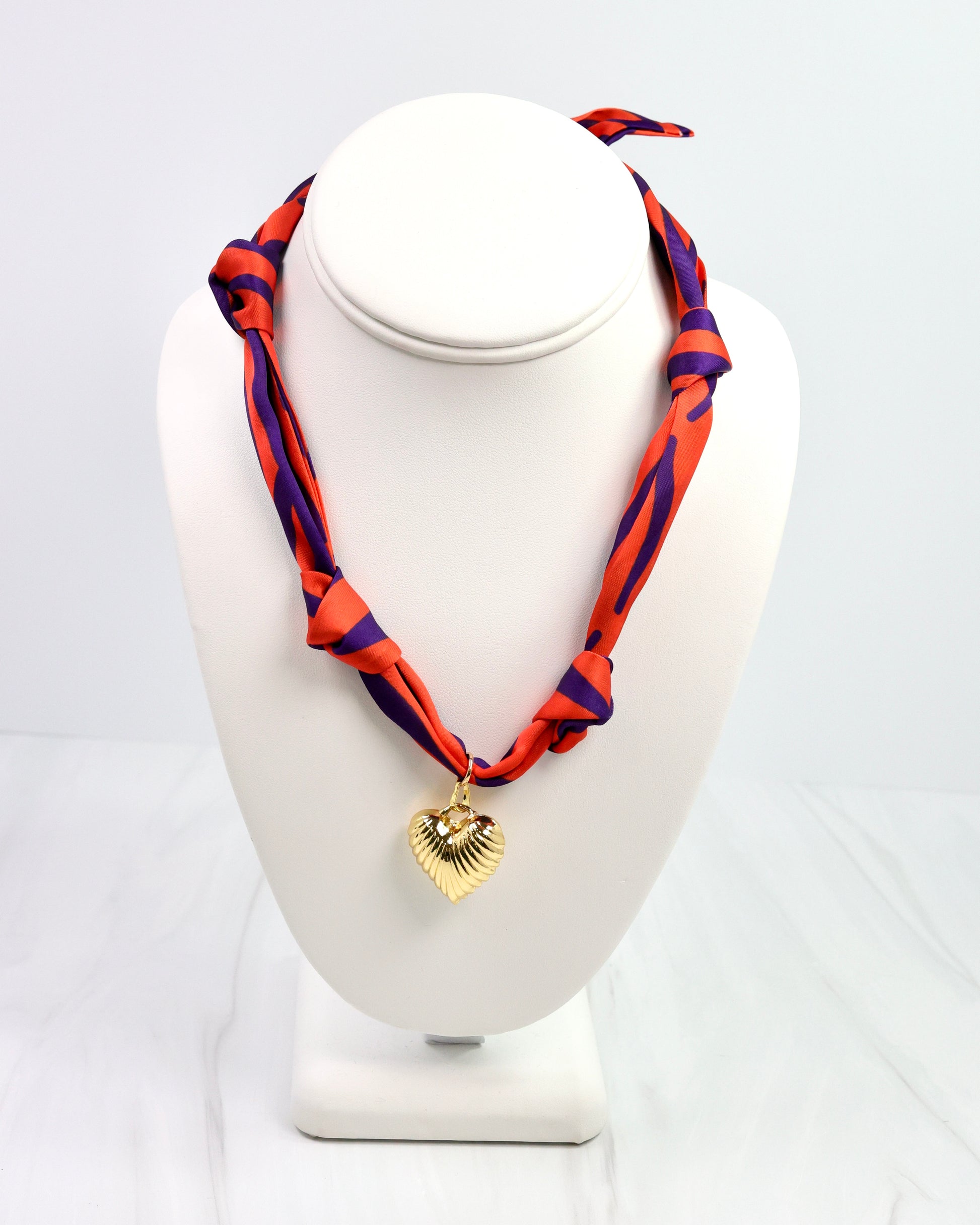 Elevate your look with the Serafina Scarf Charm Necklace featuring a playful Purple and Orange print. This satin-feel scarf is accented by a ribbed puff heart charm pendant, adding a playful yet chic touch. Designed with two stylish knots and a tie-back closure, it offers adjustable comfort and a perfect fit for any outfit.