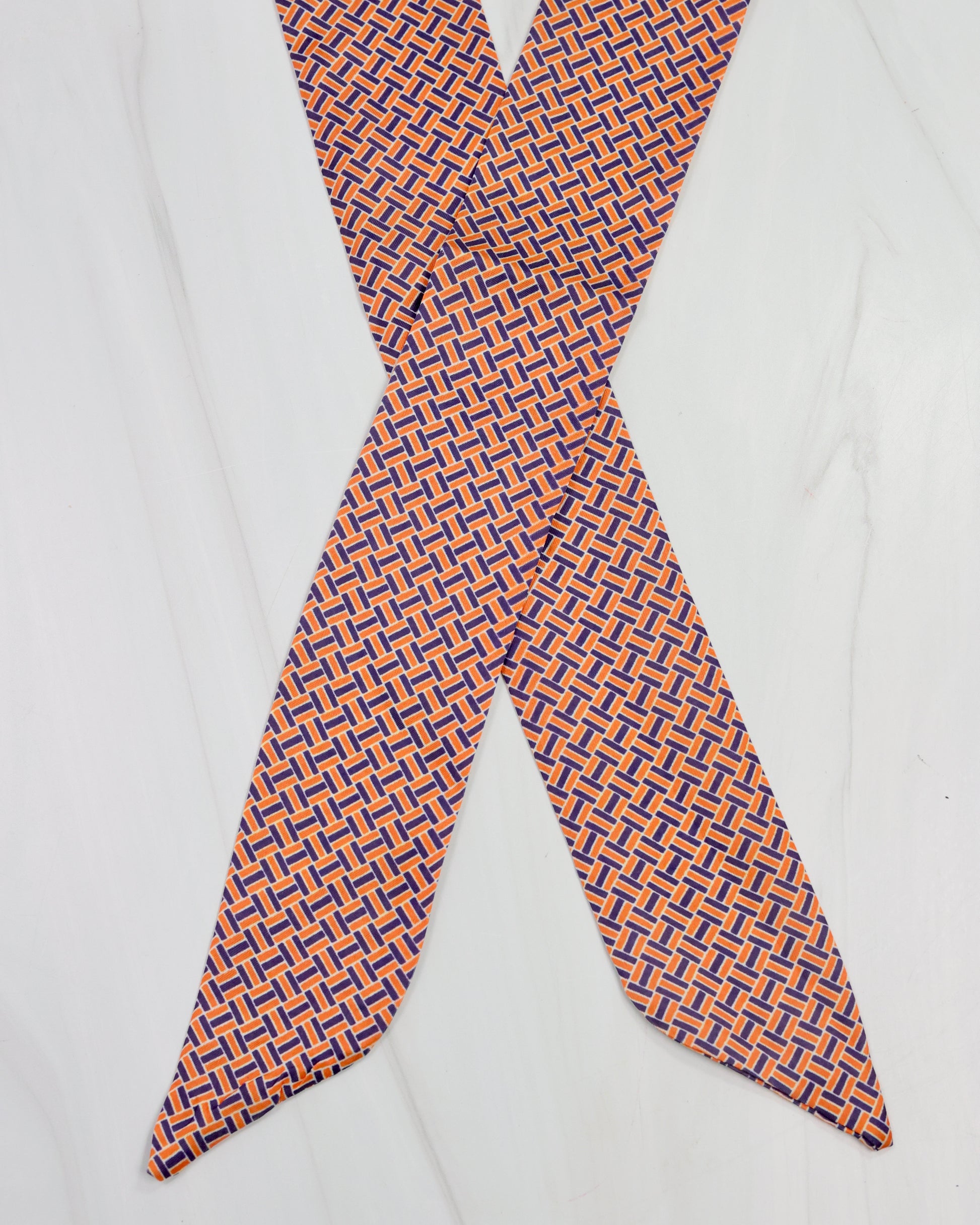 Add a stylish touch to any outfit with the Serafina Scarf in a classic Navy and Orange pattern. Its smooth satin-like texture makes it perfect for tying around your neck, wrist, bag, or even your cowgirl boots, adding a playful and fashionable flair wherever you wear it.