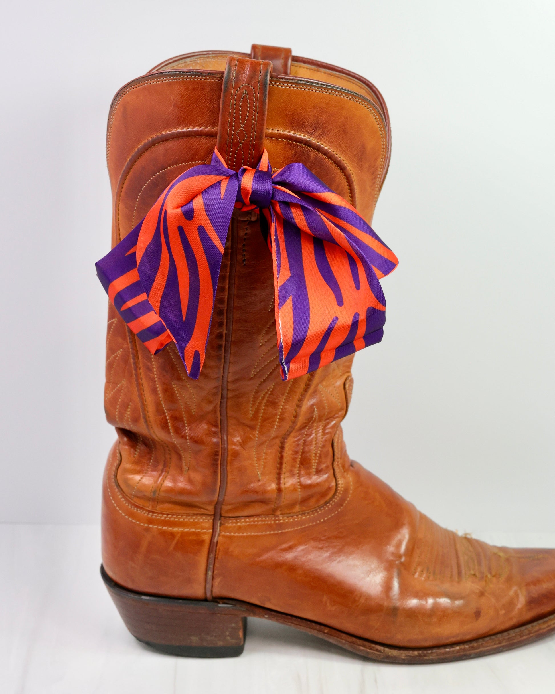 Add a stylish touch to any outfit with the Serafina Scarf in a playful purple and orange print. Its smooth satin-like texture makes it perfect for tying around your neck, wrist, bag, or even your cowgirl boots, adding a playful and fashionable flair wherever you wear it.