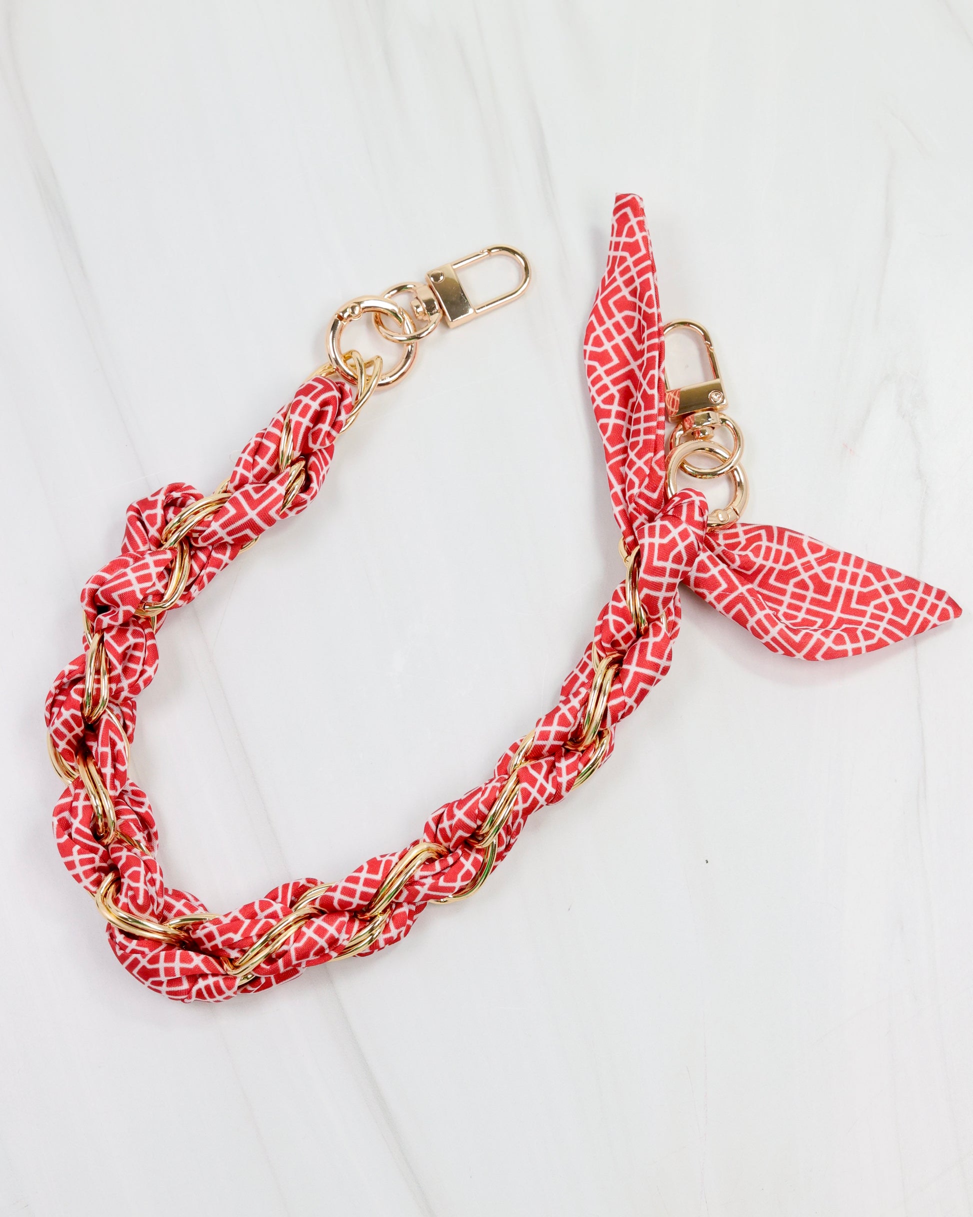 Elevate your accessory game with the Serafina Scarf Purse Chain in a striking red and white geometric print. Featuring a chic gold link chain intertwined with a stylish printed scarf, this piece effortlessly combines school spirit with sophisticated fashion. Perfect for adding a refined yet spirited touch to your favorite handbag.