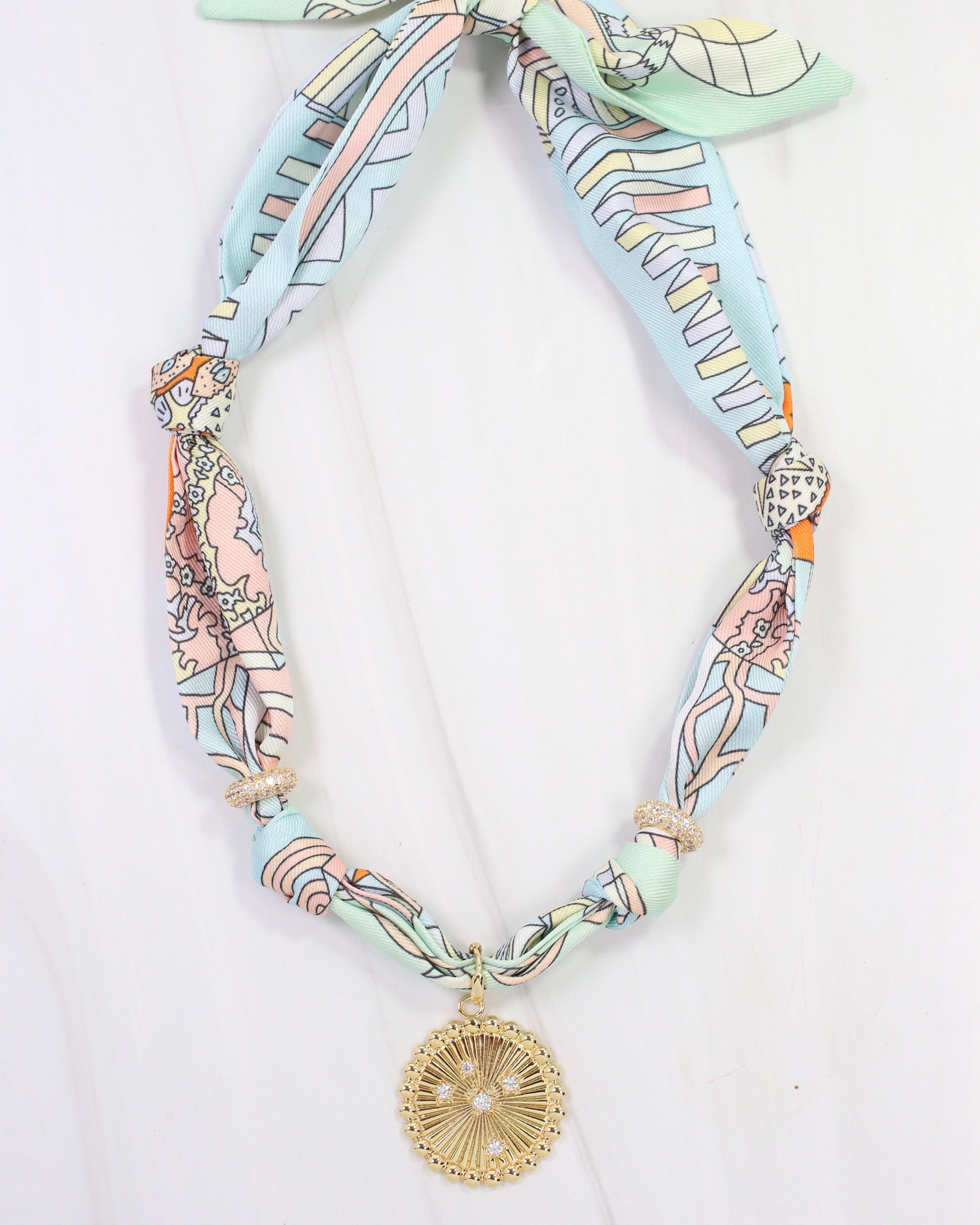 Add a pop of color with the Shannon Scarf Charm Necklace in Seafoam Featuring a beautiful light seafoam print with playful hints of seafoam and coral, this necklace shines with a gold ribbed disc charm accented by sparkling cz detail and two pave cz spacers. It’s the perfect cheerful accessory to brighten up any outfit.