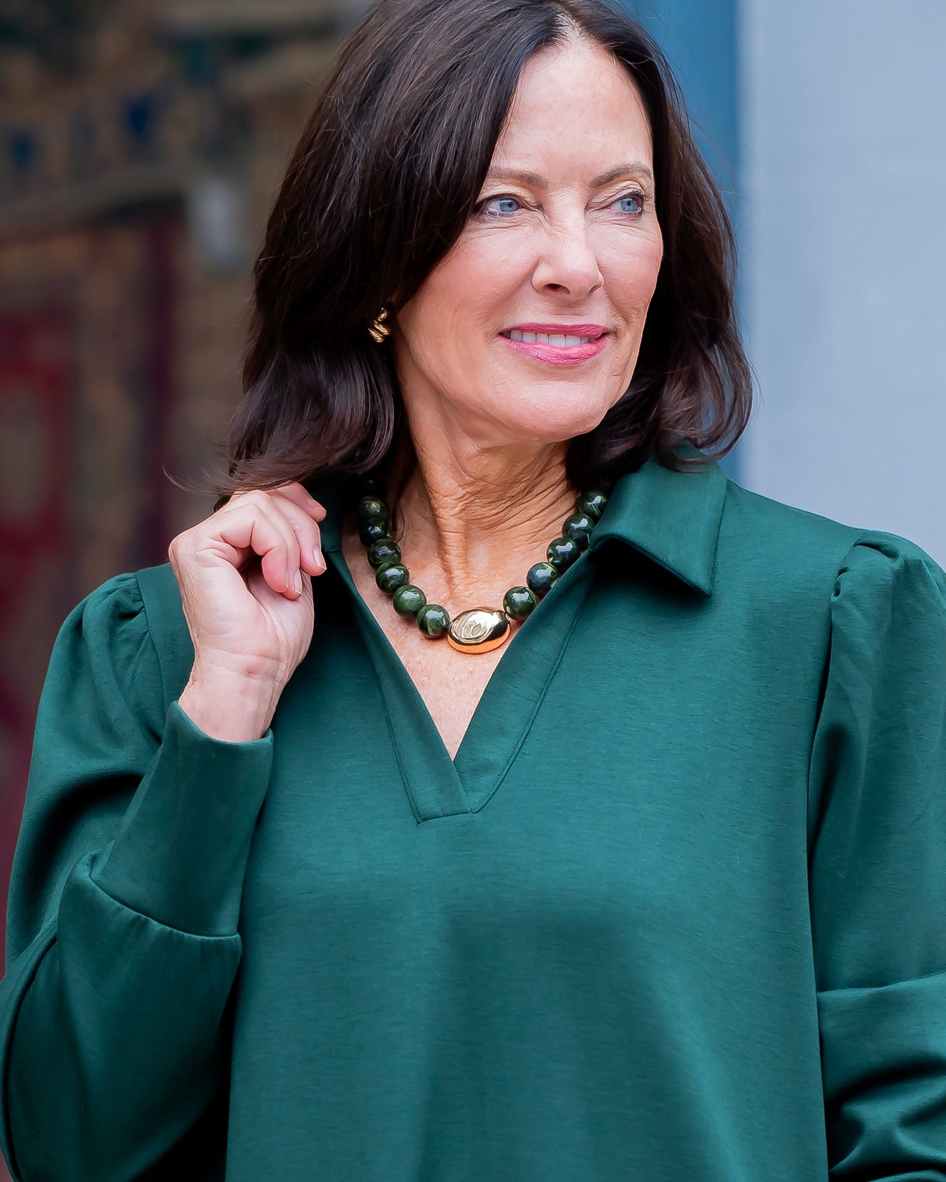 Step out in style with the Slater Side Slit Midi Dress in rich Hunter Green. Featuring long sleeves and a chic collared neckline, this dress brings a playful touch with puffy shoulders and a flirty side slit. Perfect for turning heads while staying comfortably fashionable from day to night.