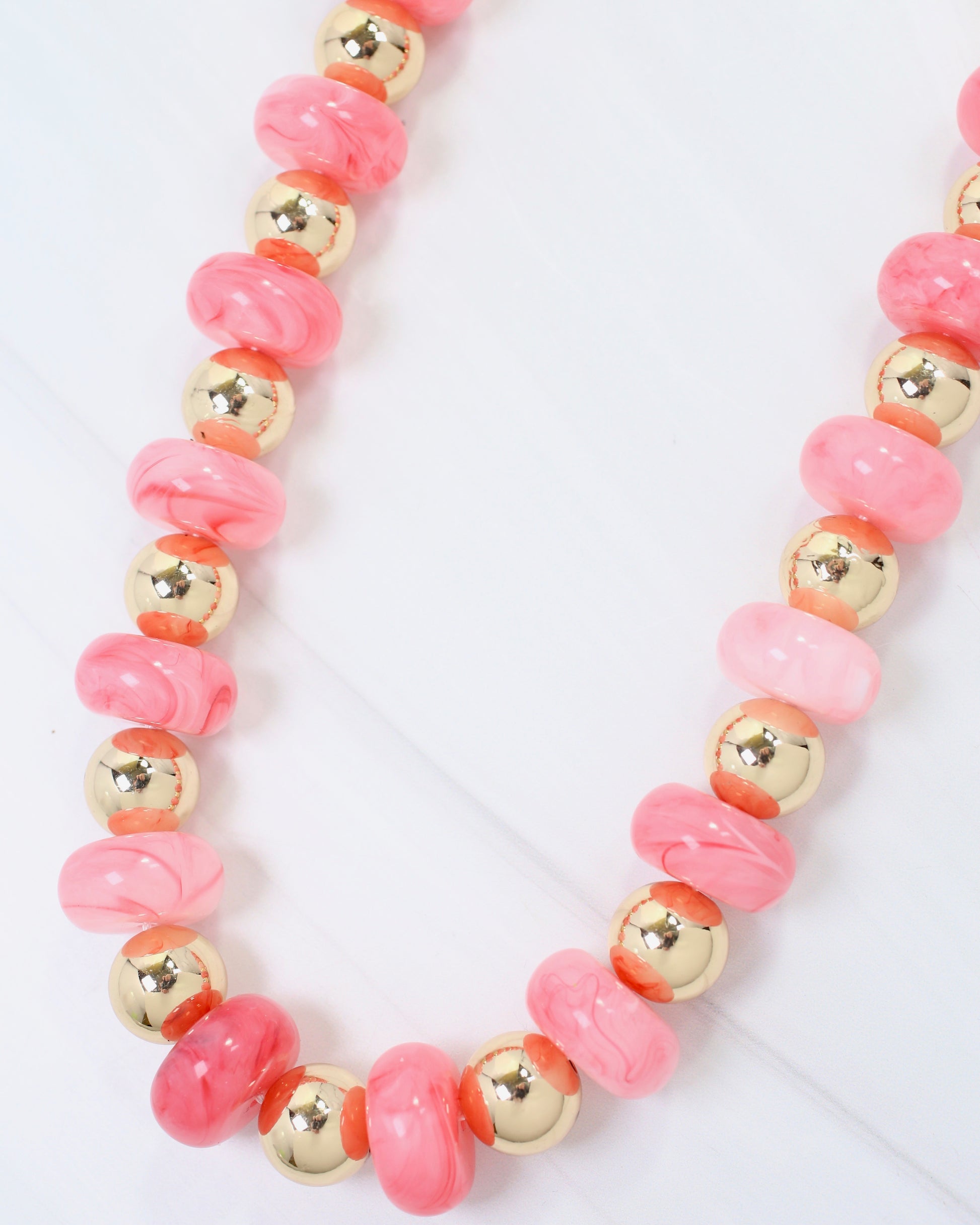 Get ready to turn heads with this playful pink marble and gold necklace that's anything but boring. Smooth marble disc beads dance alongside shimmering gold CC beads, creating a fun mix of textures and sparkle. Whether you're dressing up for a night out or adding pizzazz to your casual look, this charming piece brings just the right amount of personality and shine to any outfit.