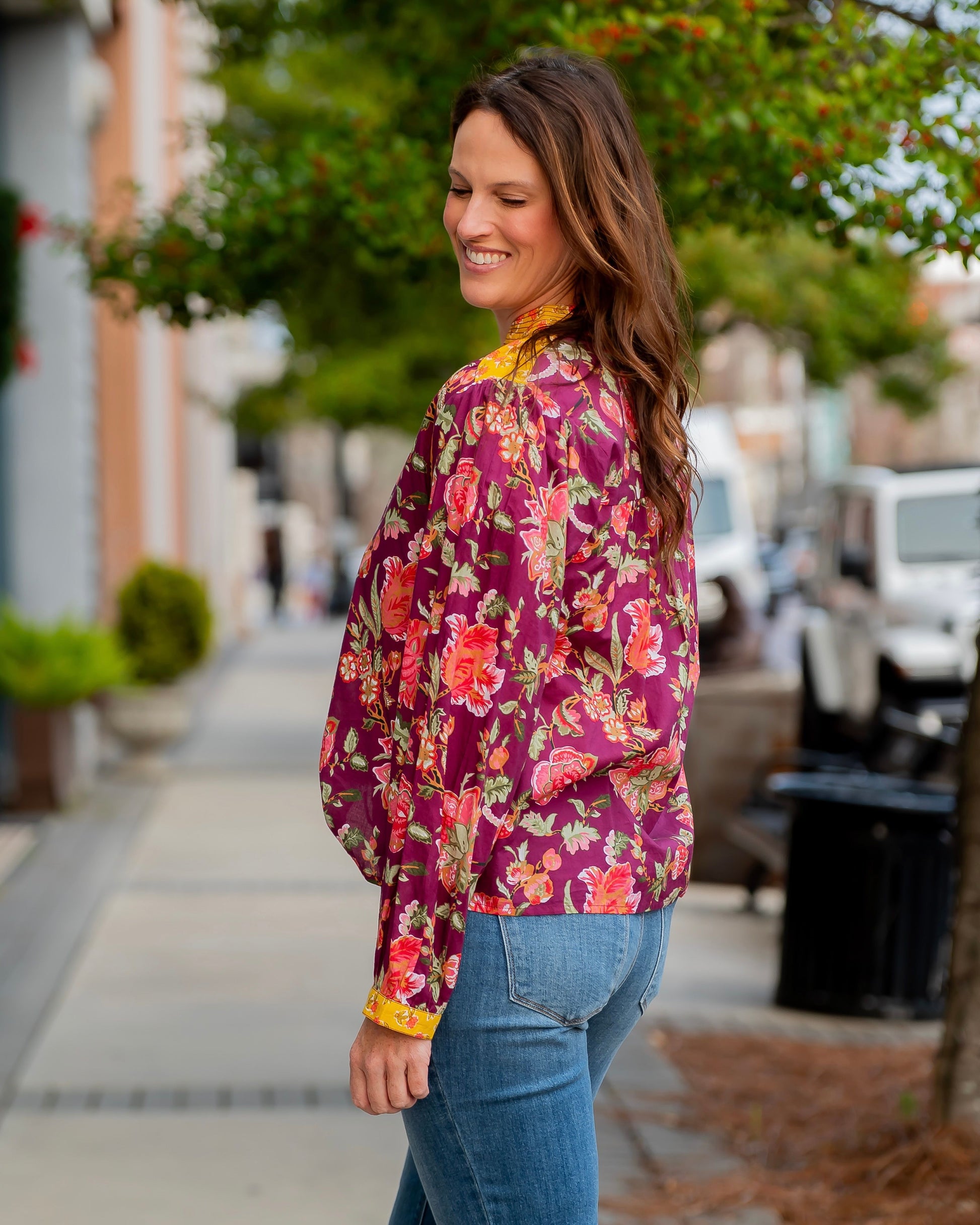 Introducing our Keystone Floral Top! With a vibrant plum background and charming pink and green floral design, this top is sure to elevate your fall wardrobe. The v-neck and long sleeves add a touch of elegance, while the mustard floral accents and plum stitching give it a unique flair. Stay stylish this season with this fun and fashionable top.