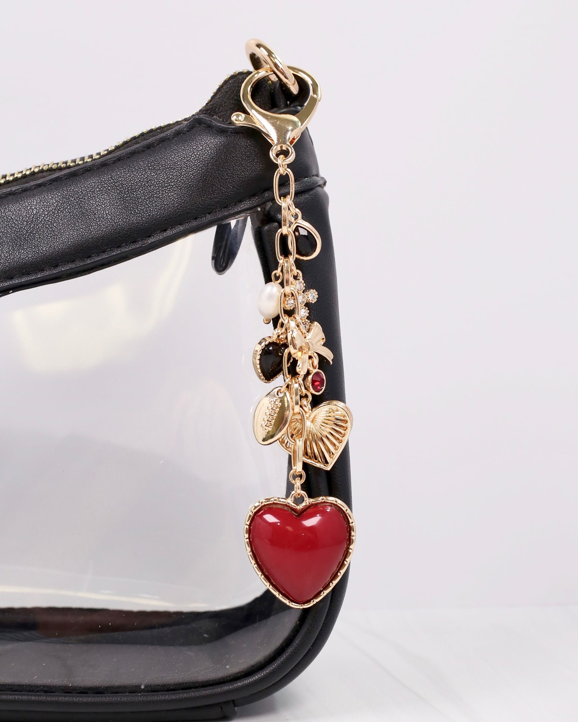 Add a stylish touch to your gameday look with the Sutton Bag Charm in garnet and black. This charming accessory features two hearts, a football, a cross, and a clover, making it a versatile piece to brighten your clear bag, use as a key chain, or pair with a scarf for a boot charm. Its playful design adds a fashionable pop of color and personality wherever you choose to wear it.